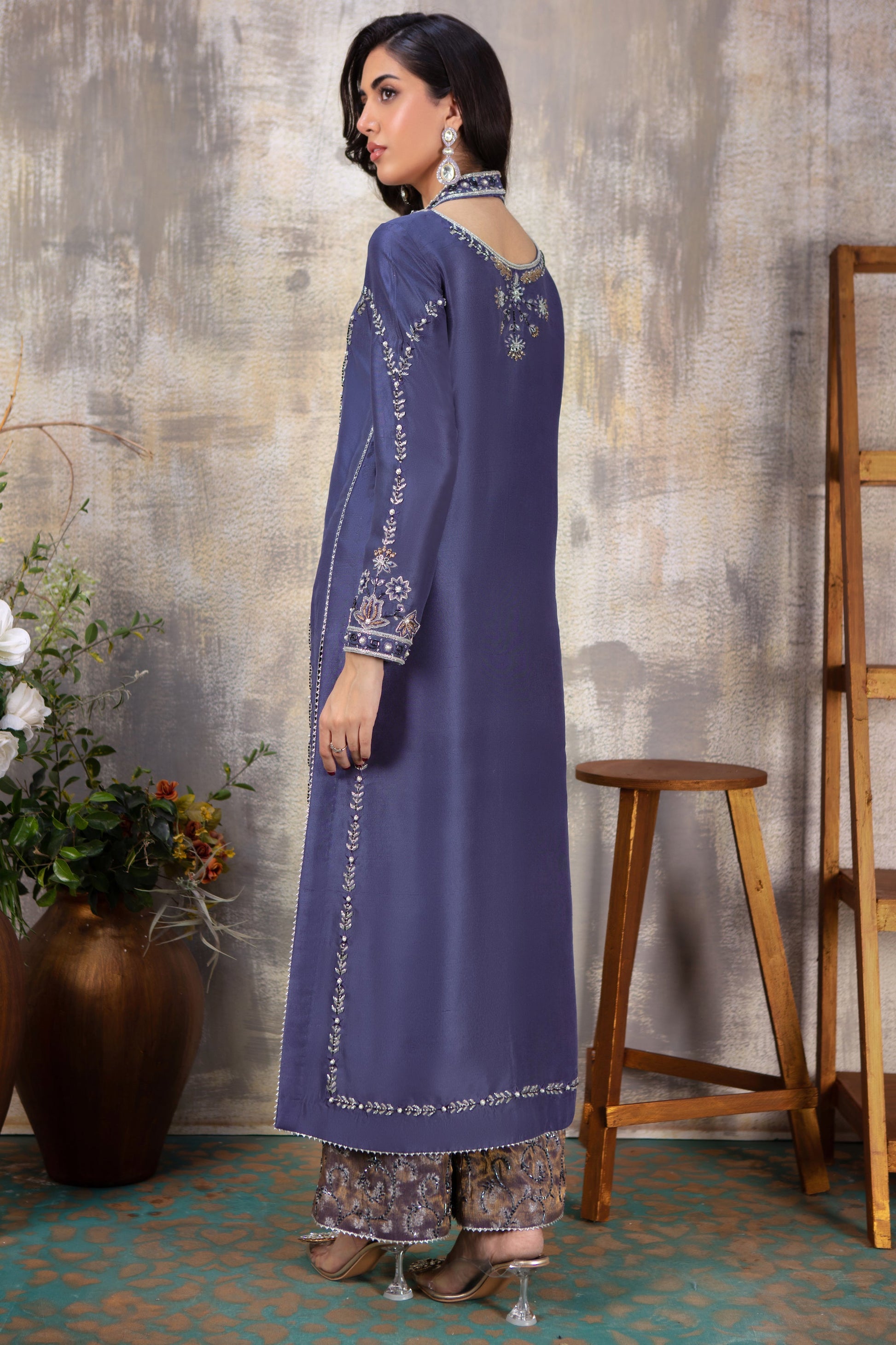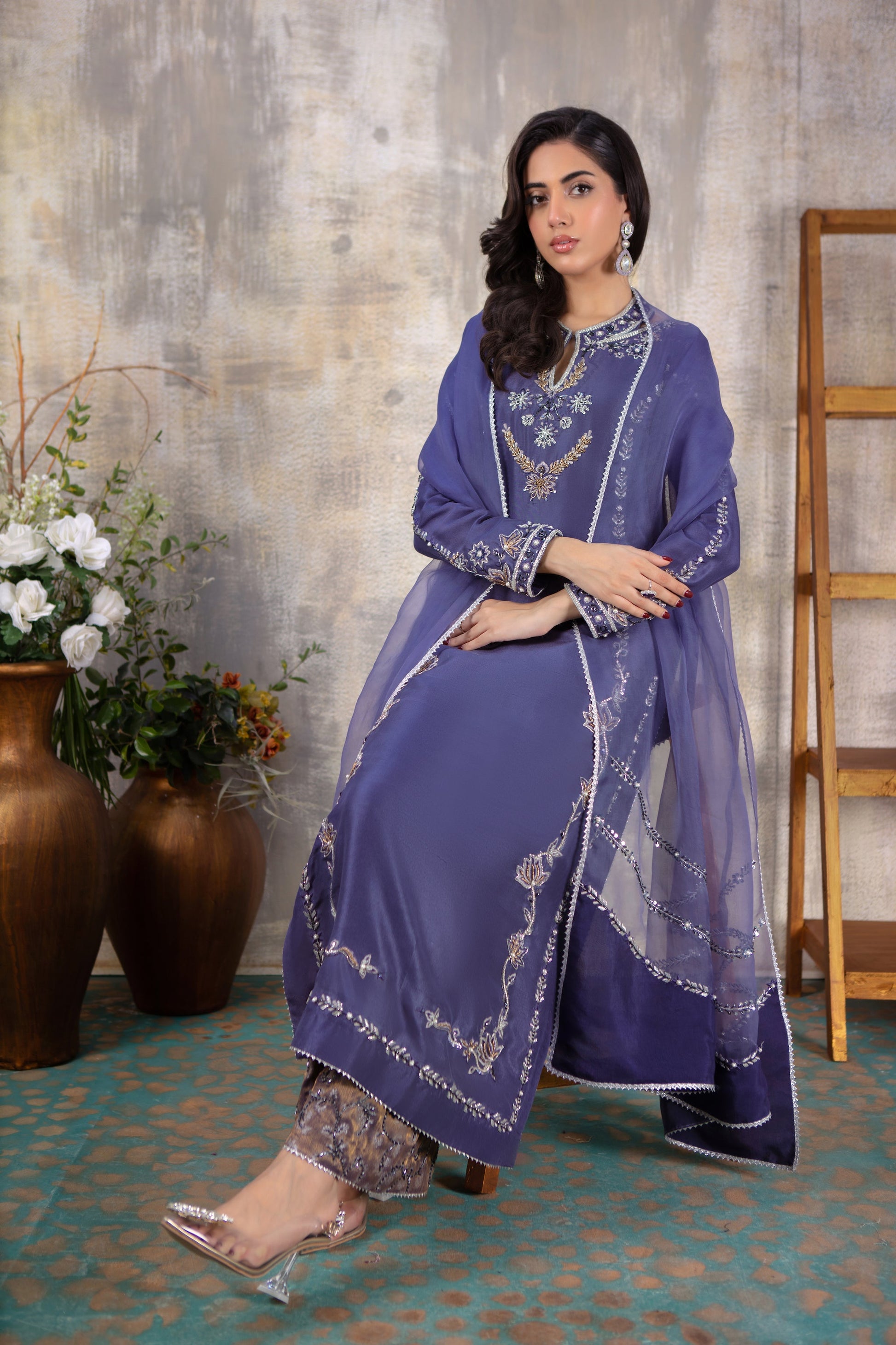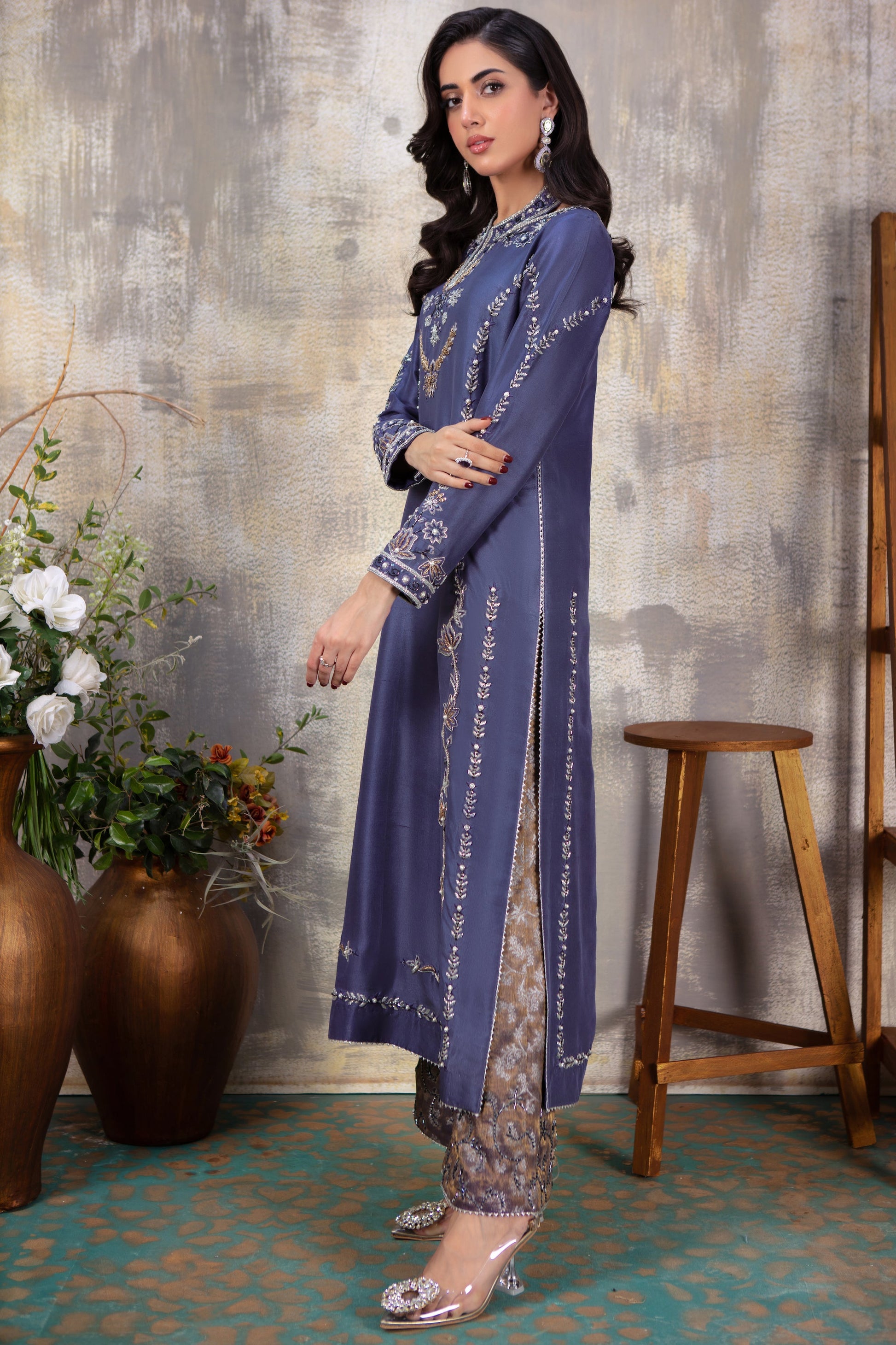 Elevate your style with this raw silk long straight silhouette shirt in a stunning peri blue, featuring intricate botanical zardozi embroidery and a chic stylized collar neckline. Paired with an embellished maysuri izaar and a statement organza dupatta, this ensemble exudes refined elegance.