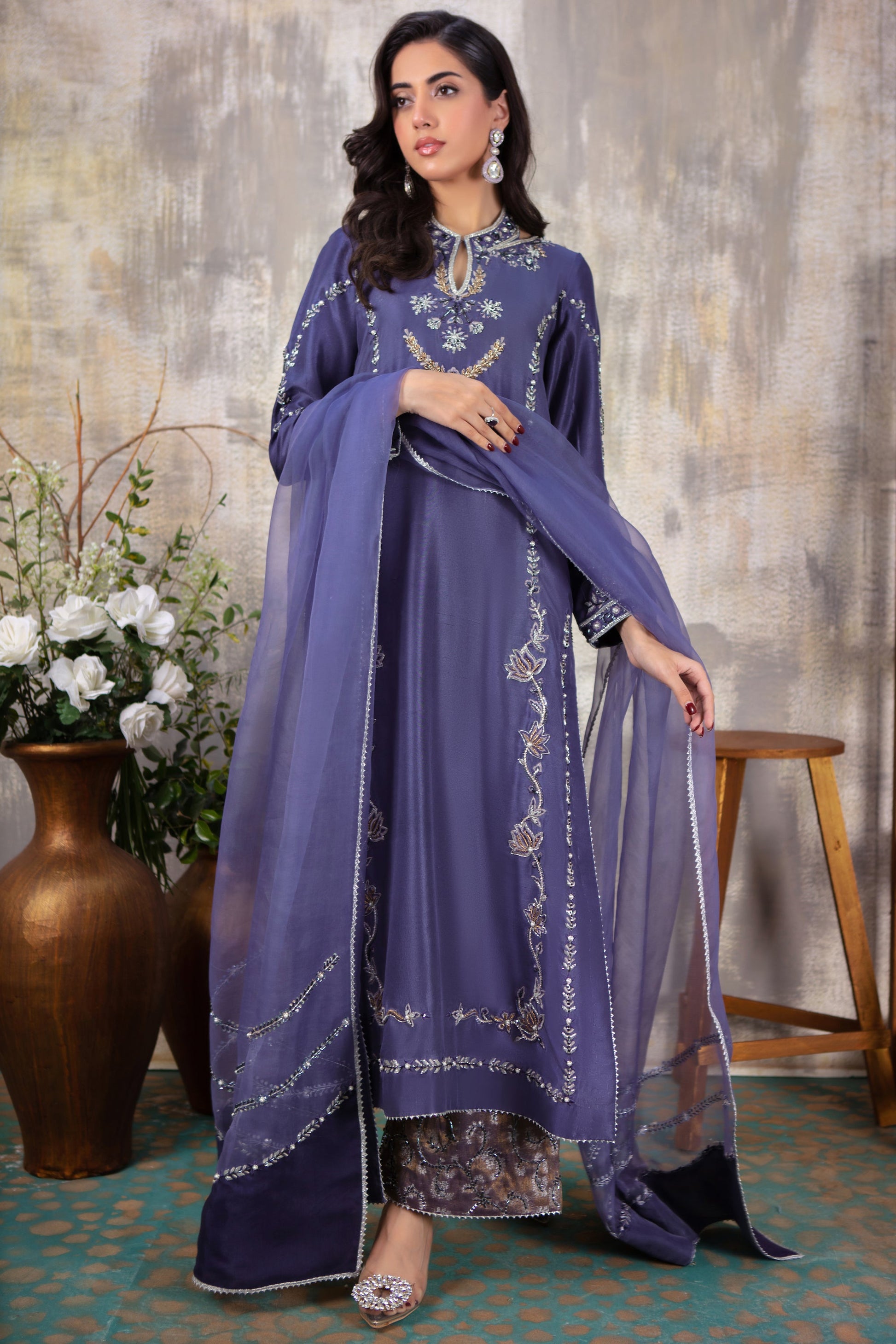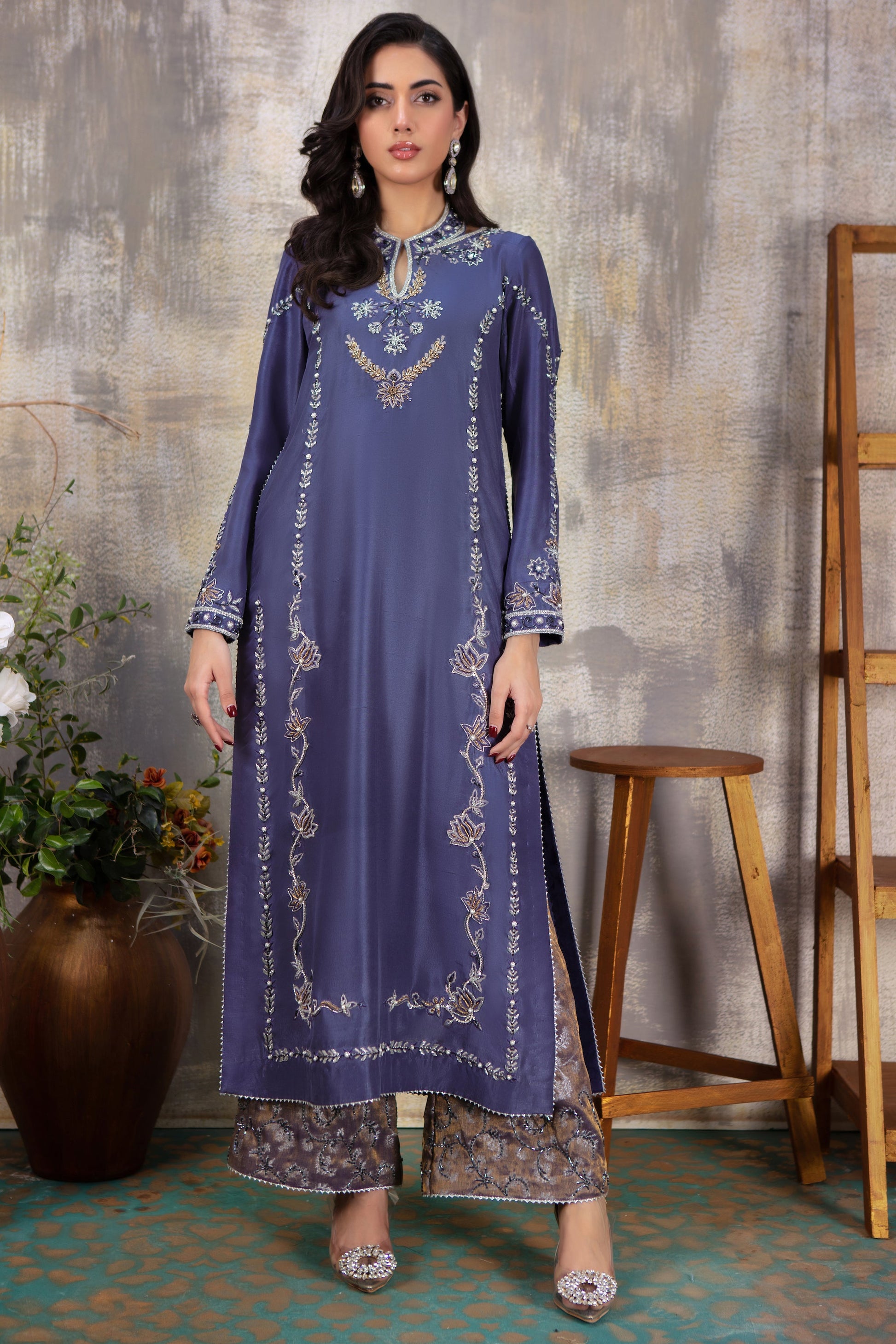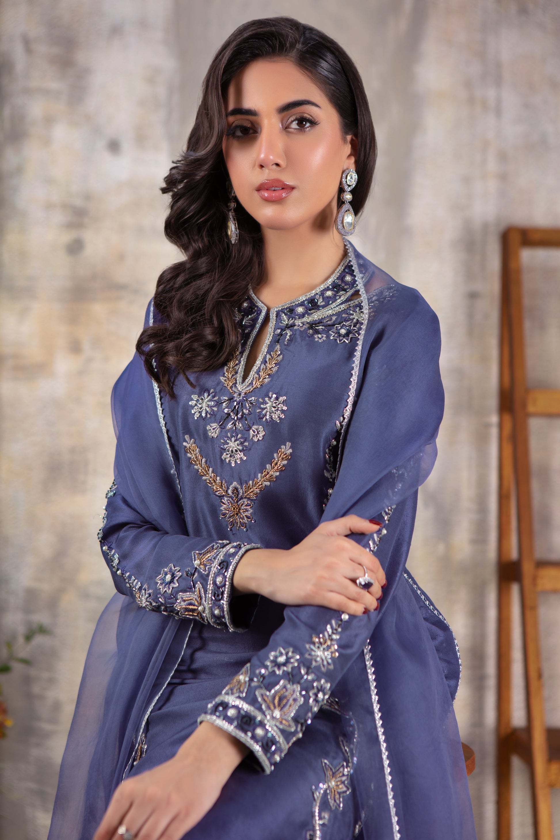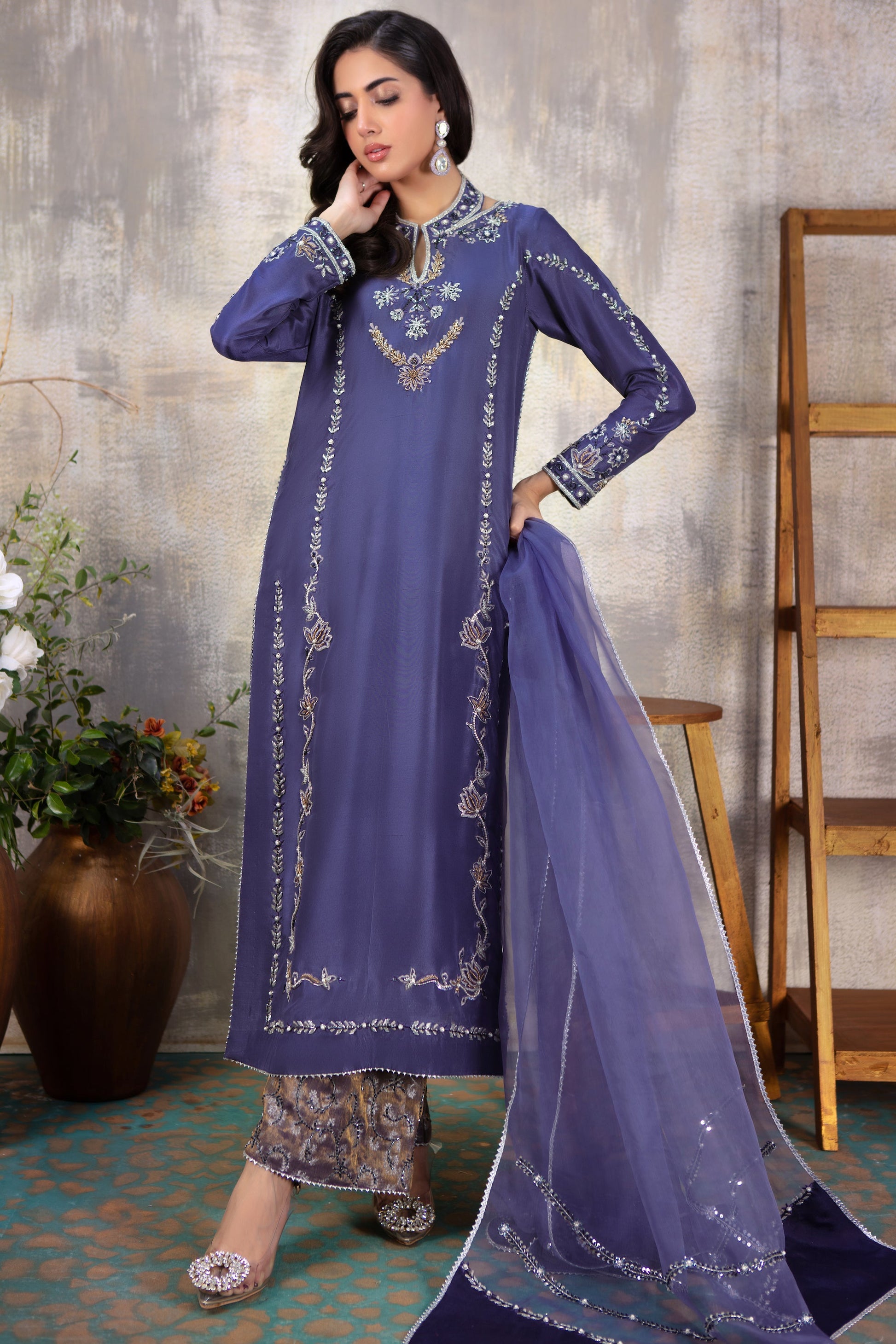 Elevate your style with this raw silk long straight silhouette shirt in a stunning peri blue, featuring intricate botanical zardozi embroidery and a chic stylized collar neckline. Paired with an embellished maysuri izaar and a statement organza dupatta, this ensemble exudes refined elegance.