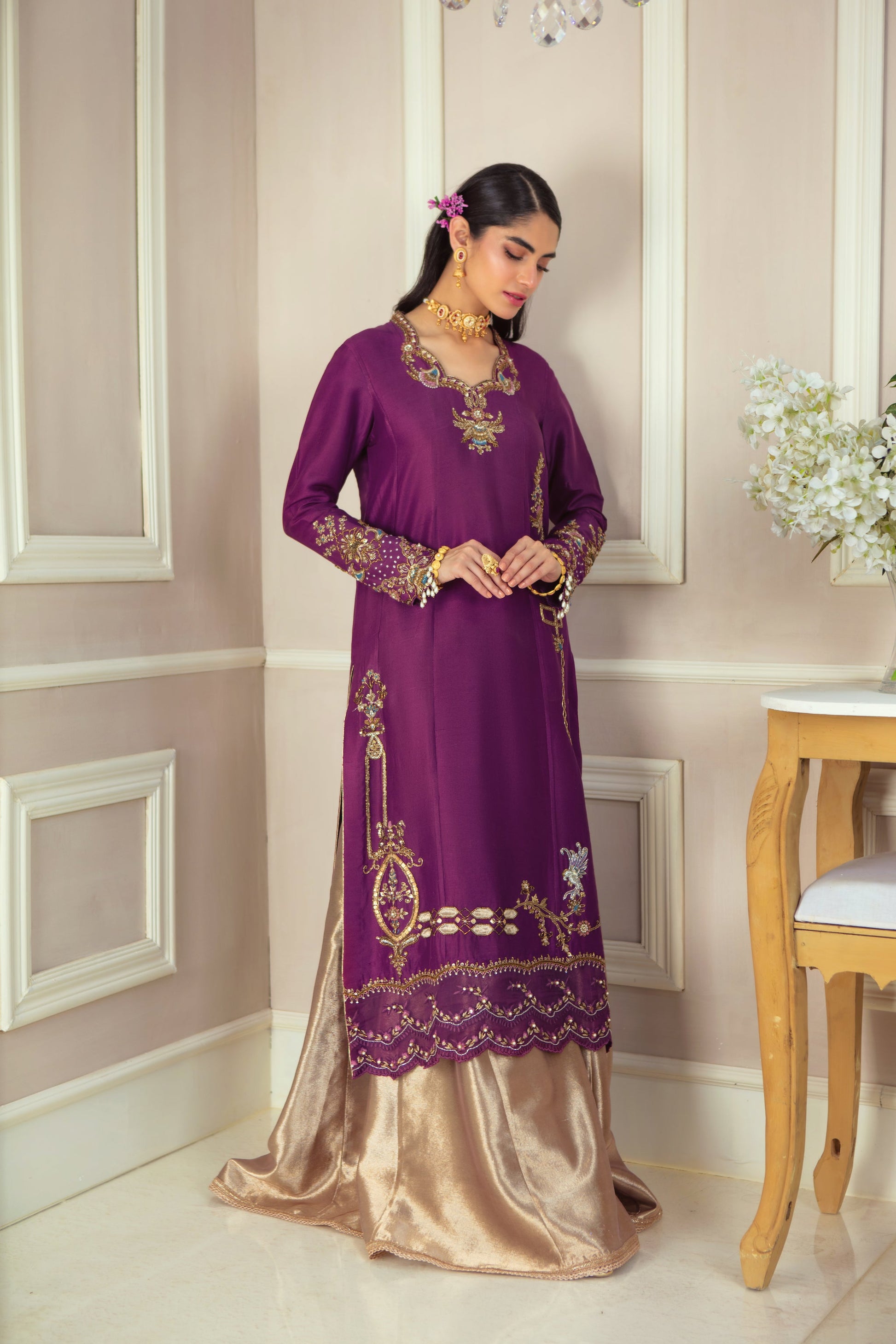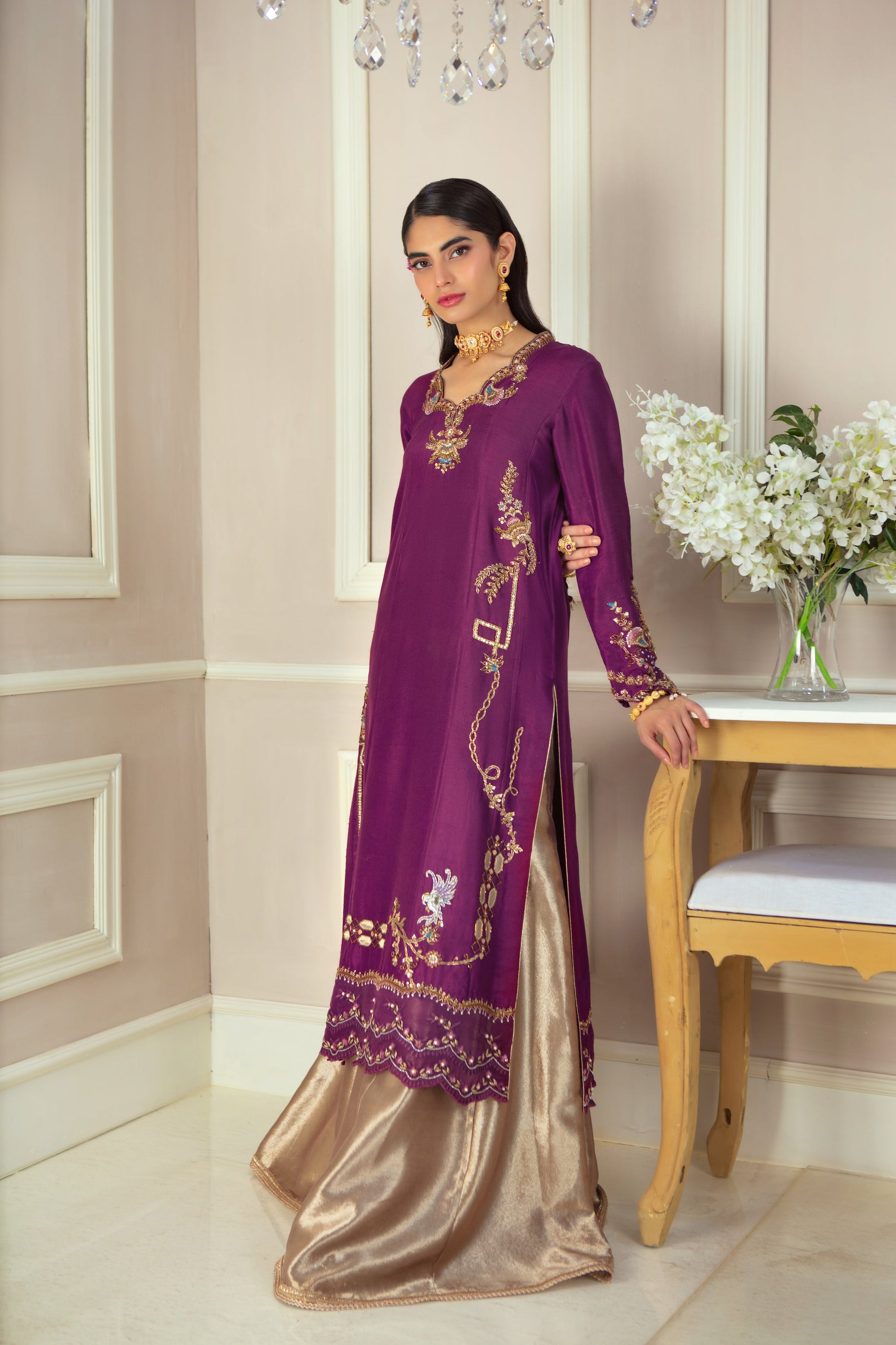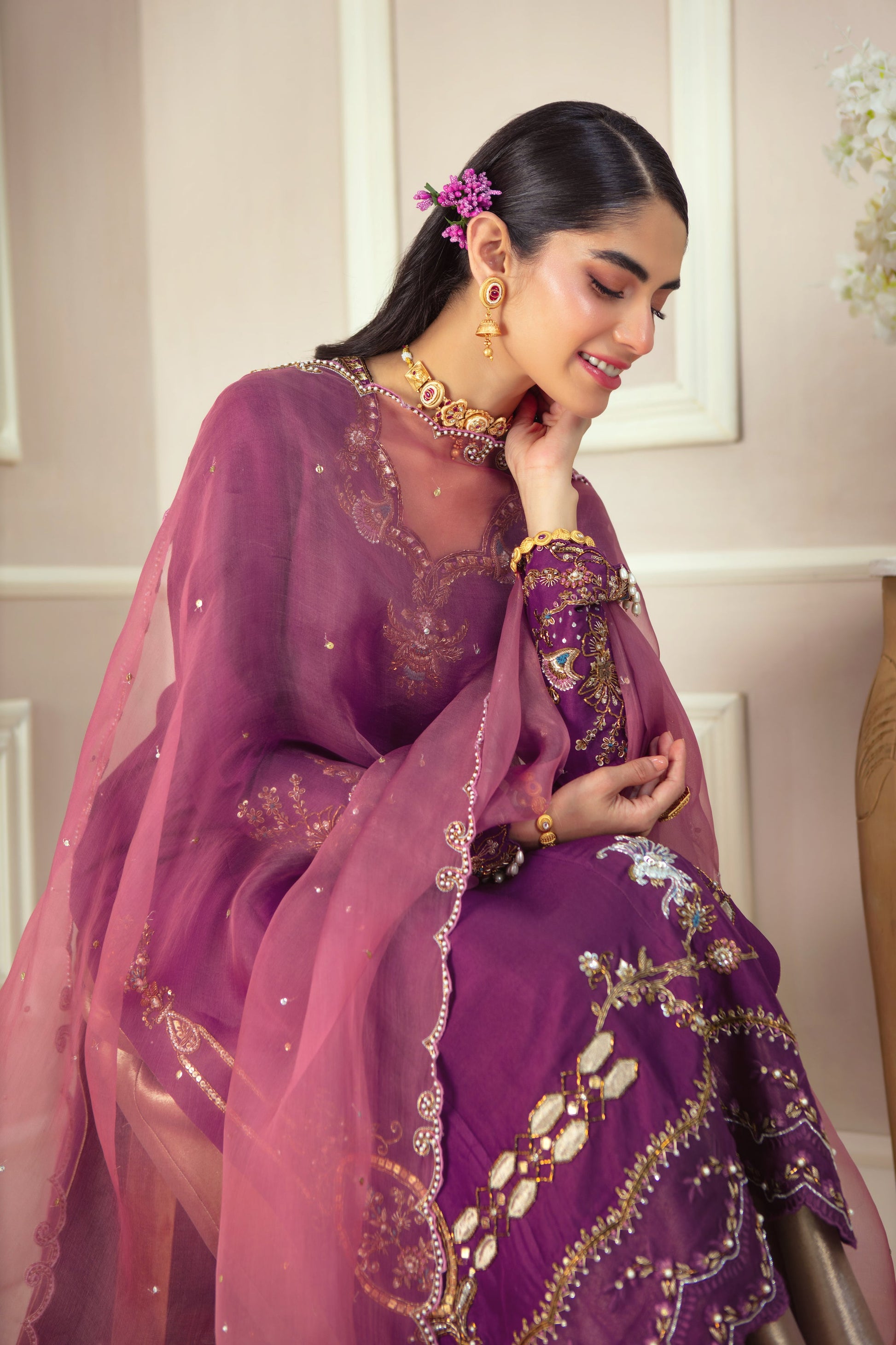 This stunning eggplant raw silk paneled shirt features exquisite antique zardozi and resham embroidery, creating a perfect blend of traditional artistry and contemporary elegance. Paired with a breathtaking rosewood statement dupatta, intricately adorned with cutwork borders, applique work, sequin and pearl embellishments, it adds an ethereal touch to the ensemble. The antique gold lama dhaka pants, finished with delicate tassels, complete the look, while the captivating color combination is truly unforgettable.