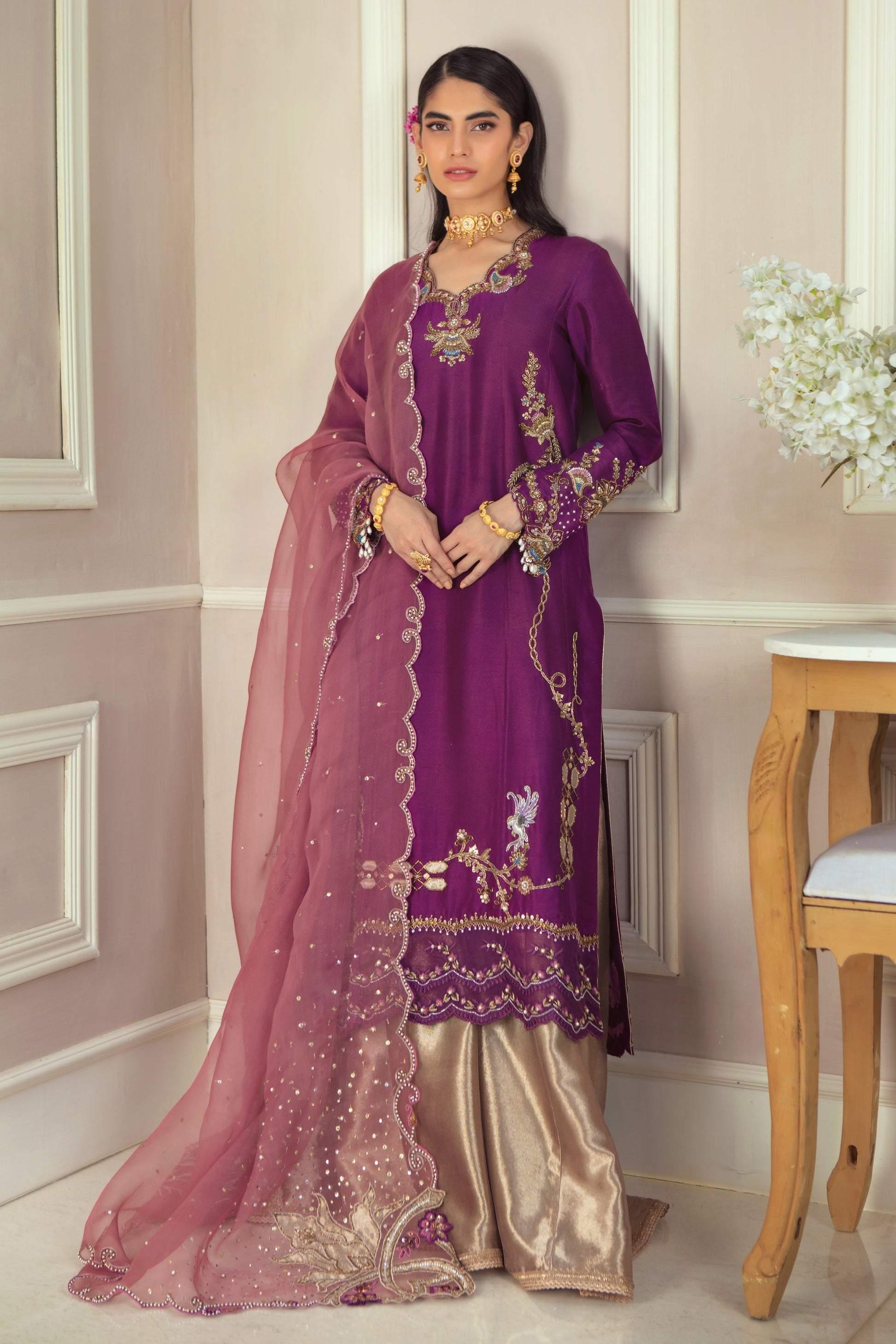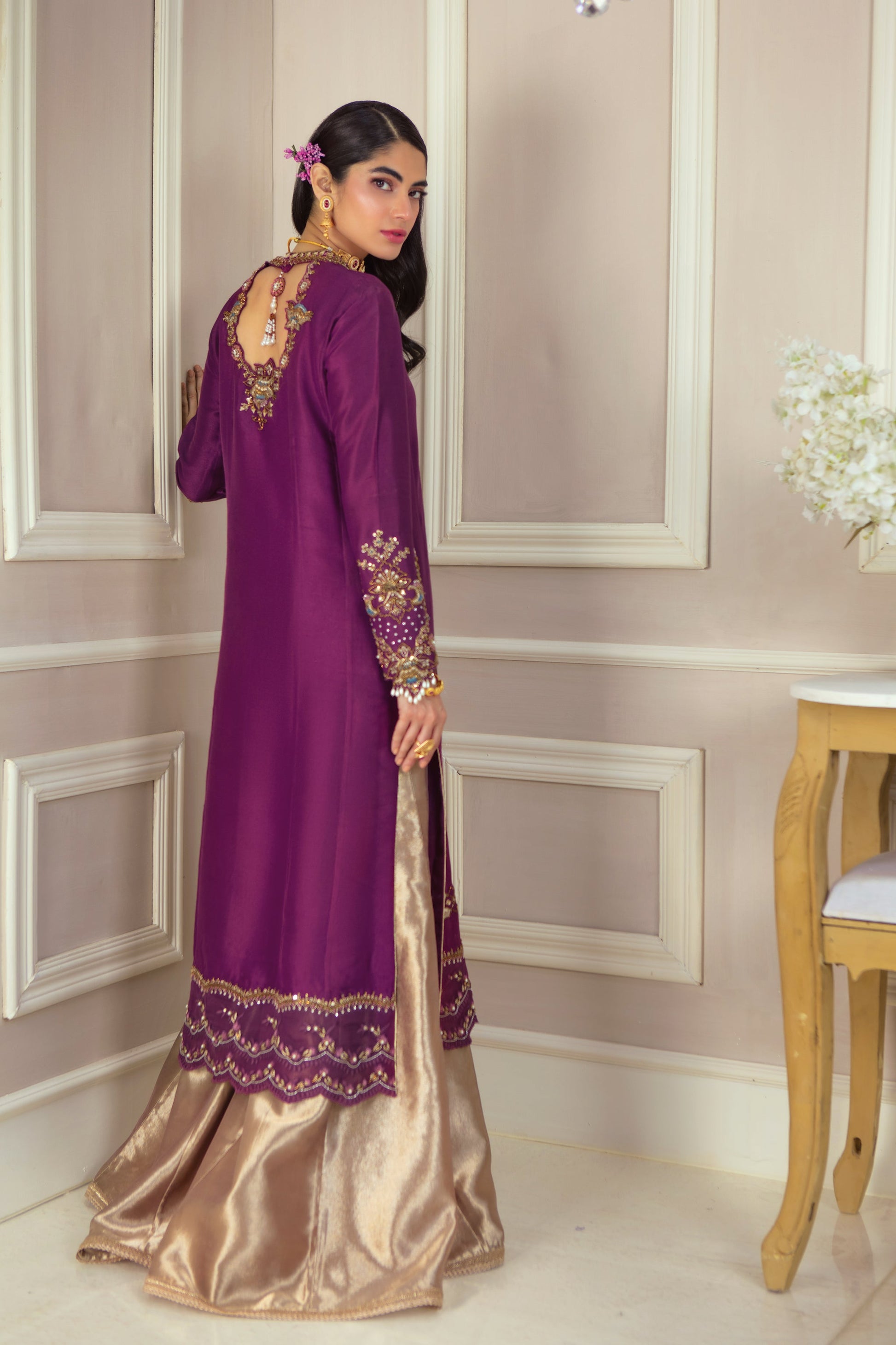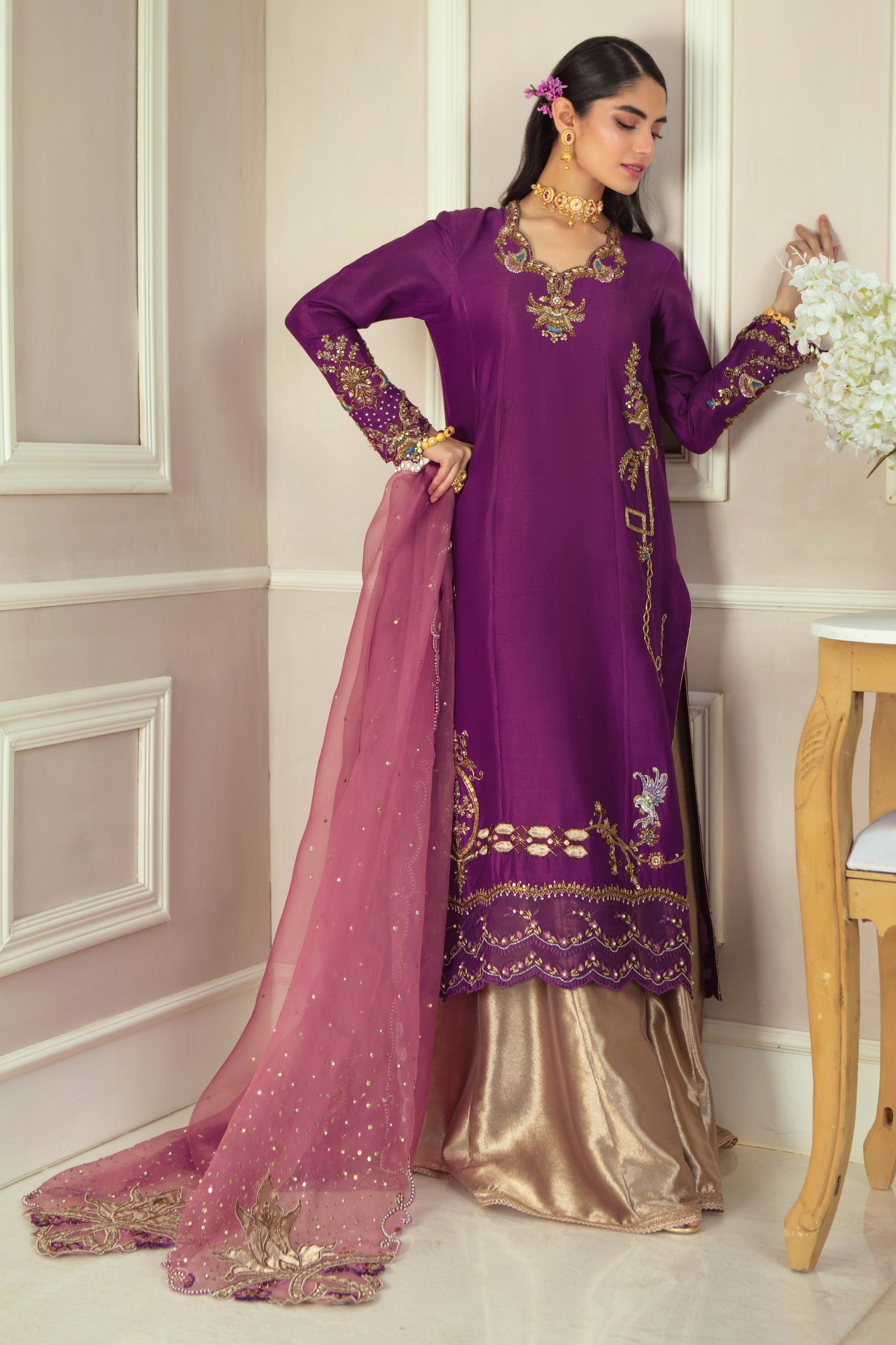 This stunning eggplant raw silk paneled shirt features exquisite antique zardozi and resham embroidery, creating a perfect blend of traditional artistry and contemporary elegance. Paired with a breathtaking rosewood statement dupatta, intricately adorned with cutwork borders, applique work, sequin and pearl embellishments, it adds an ethereal touch to the ensemble. The antique gold lama dhaka pants, finished with delicate tassels, complete the look, while the captivating color combination is truly unforgettable.