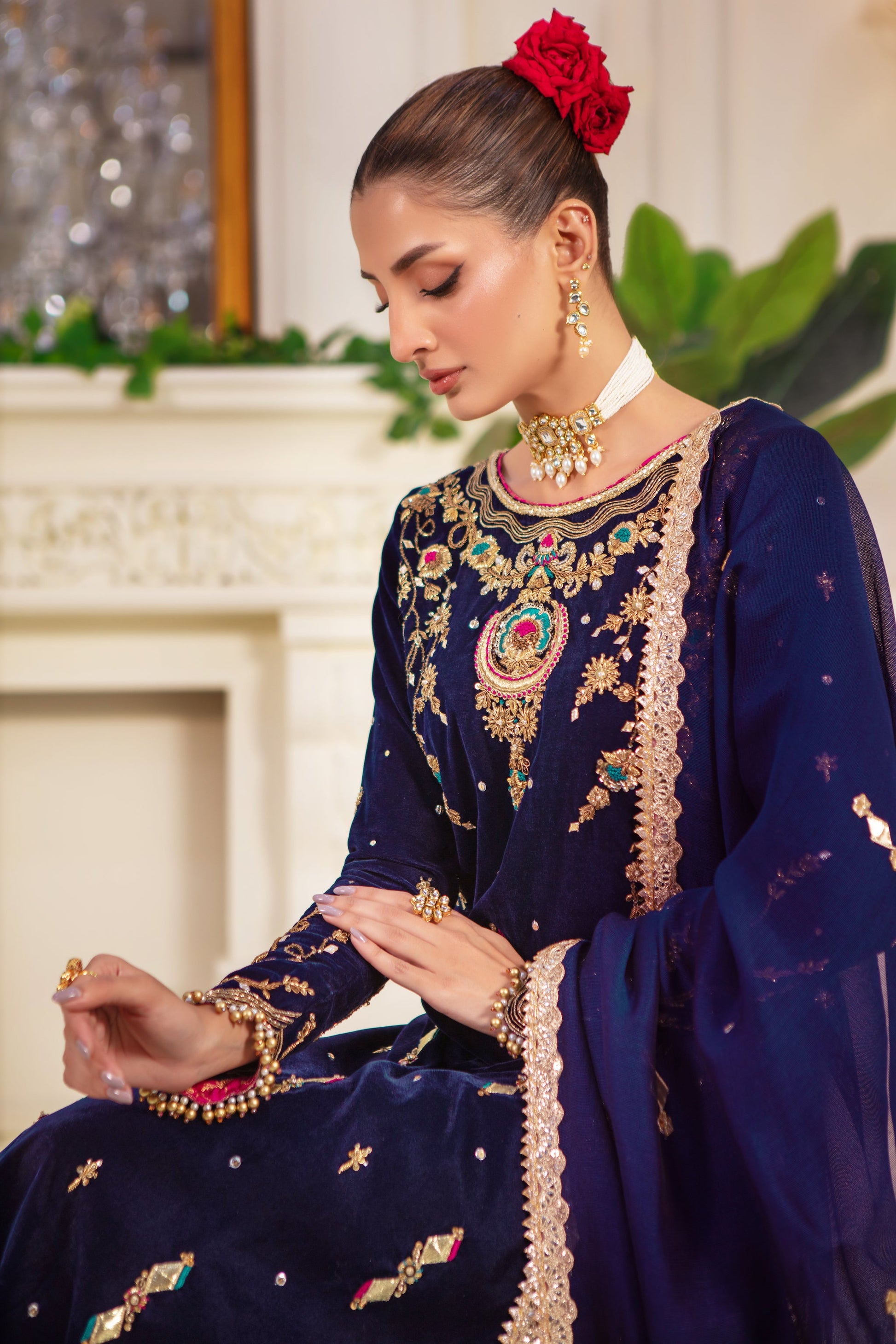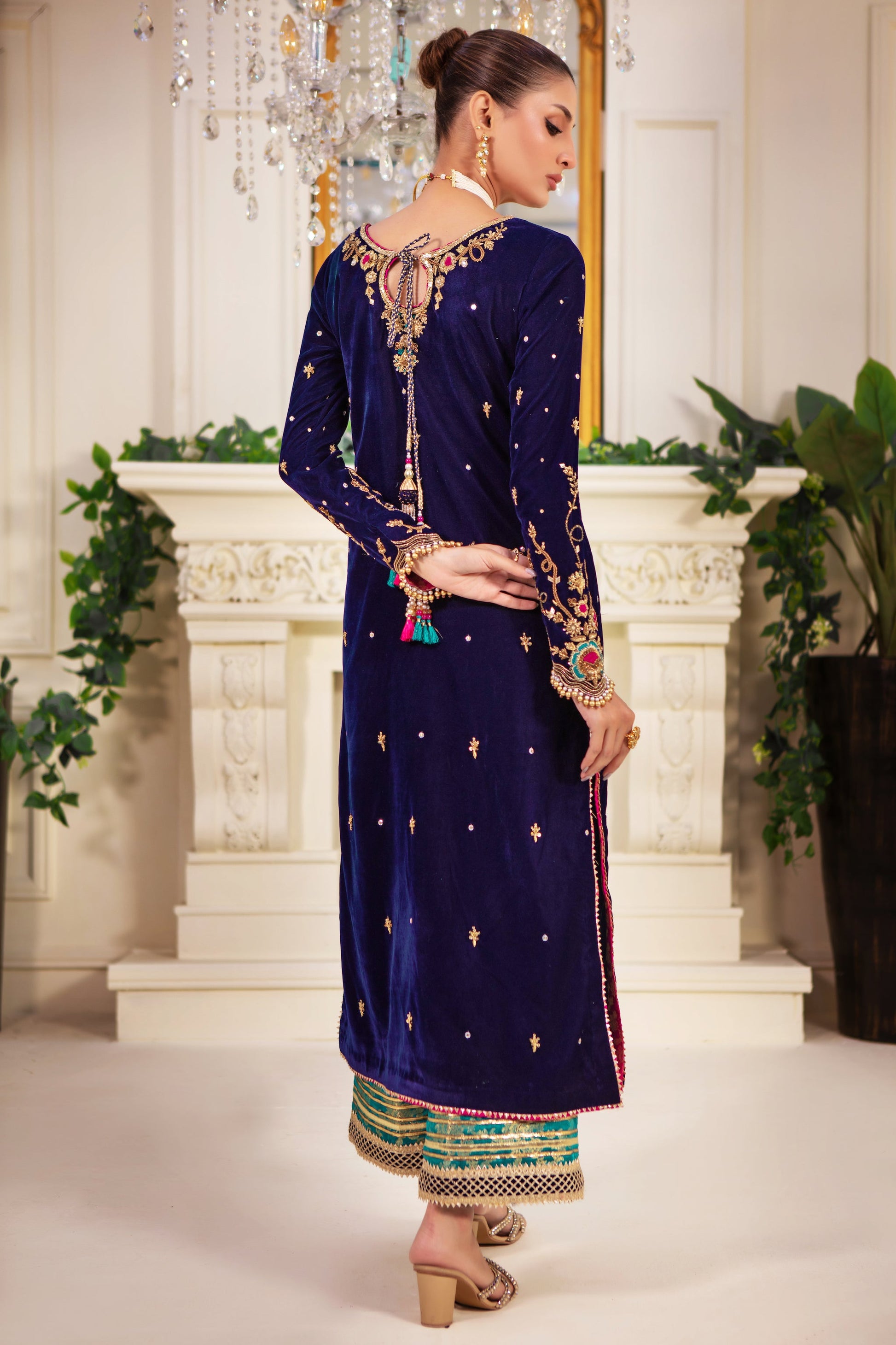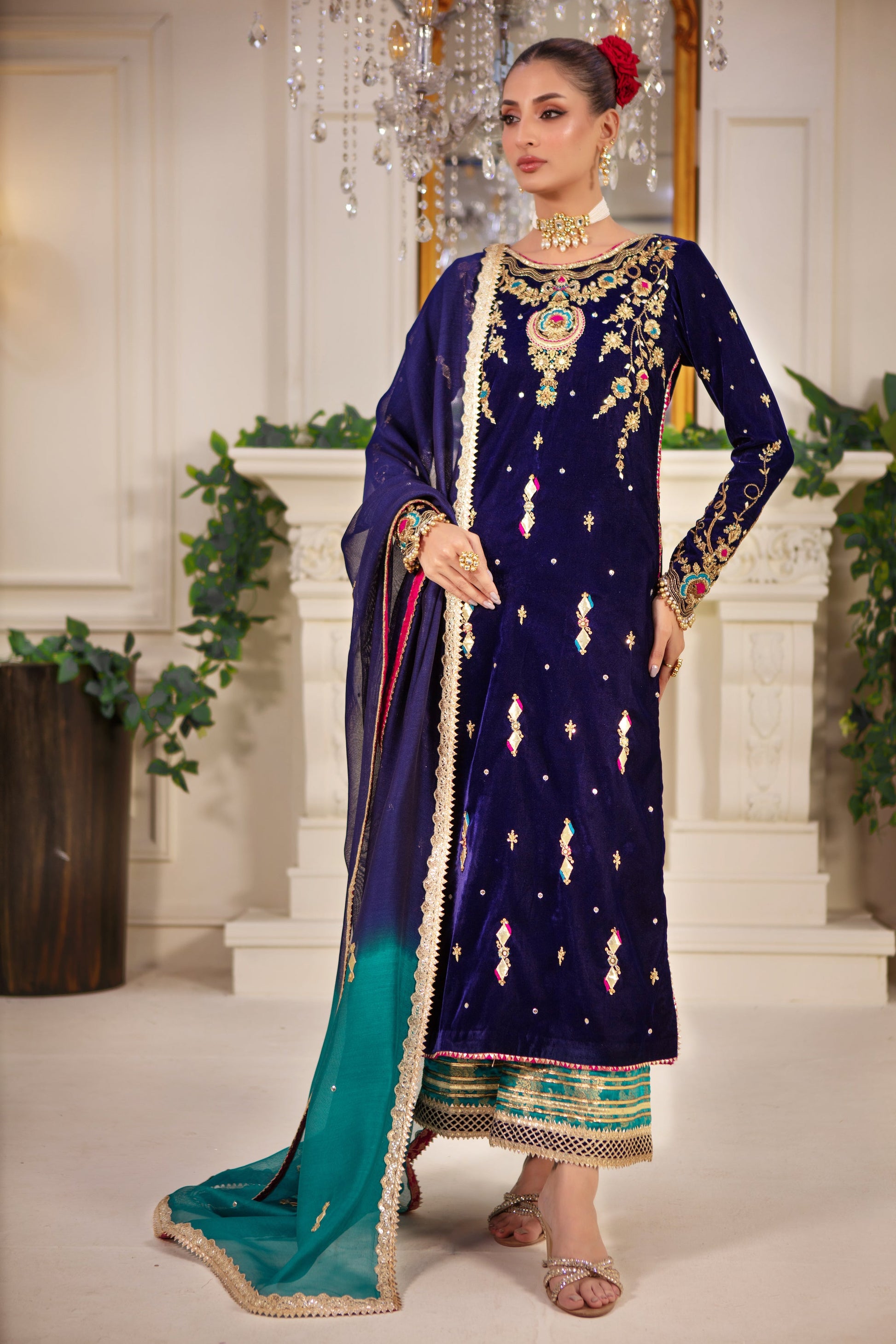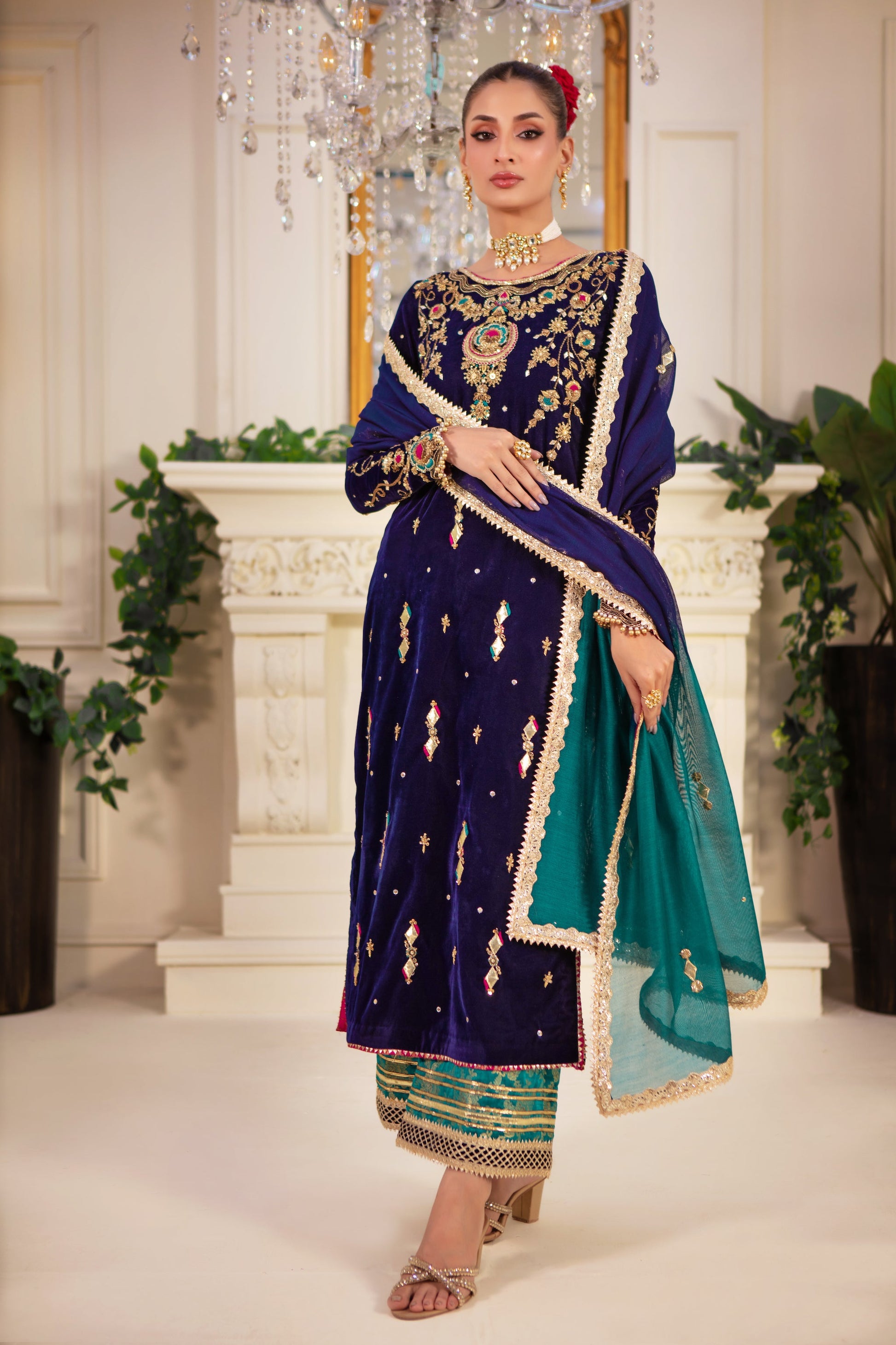 A perfect blend of traditional elegance and trendy style, this velvet shirt features zardozi and gota embroidery with vibrant pops of pink and Teal. Stylized gota motifs embellish the shirt, adding a contemporary flair, while handcrafted tassels at the back bring a festive charm. Paired with sea green jamawar izaar pants, adorned with gota embellishments, and a two-tone dupatta with pink finishing, this ensemble strikes a beautiful color balance, making it a fun and festive choice for celebratory occasions.