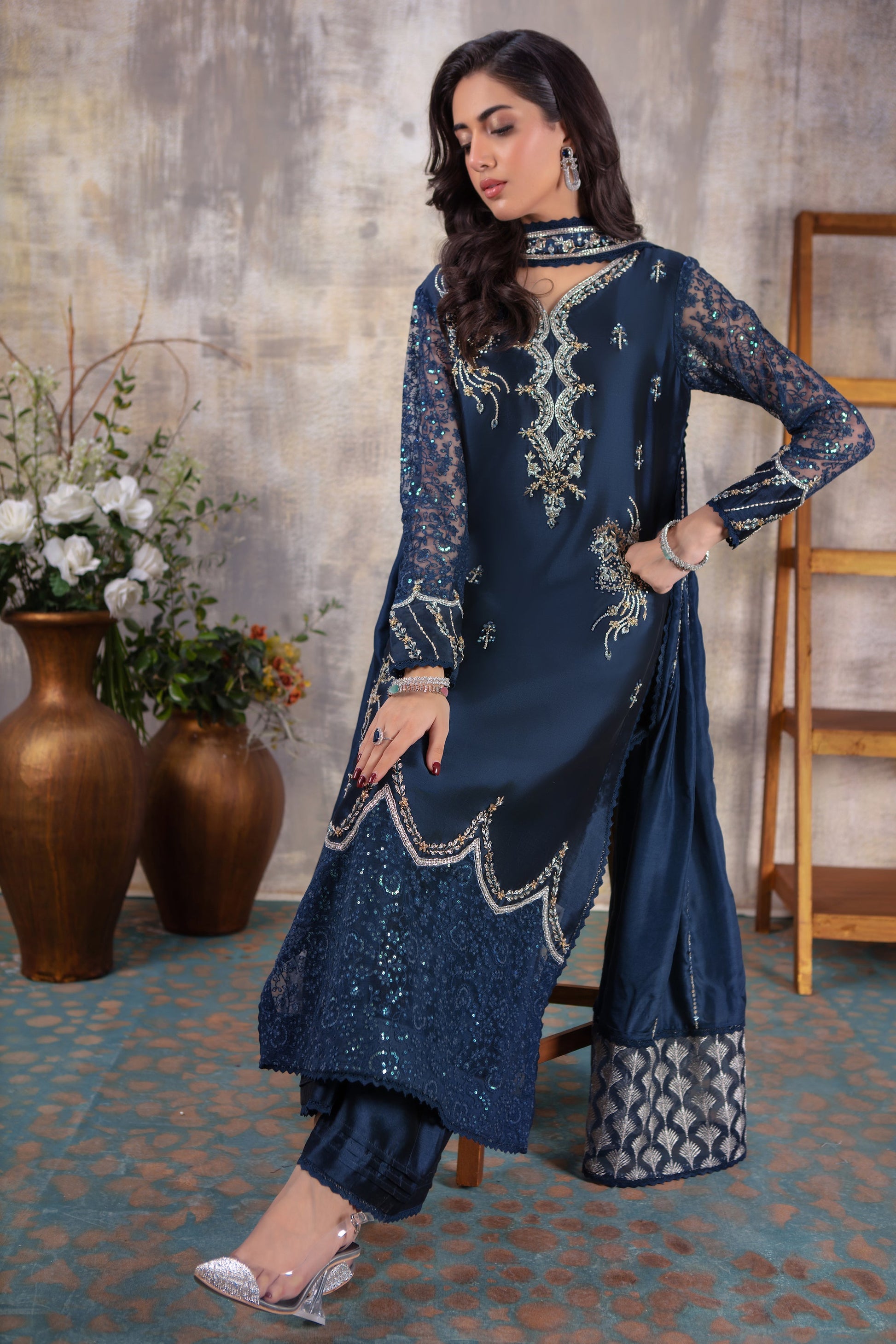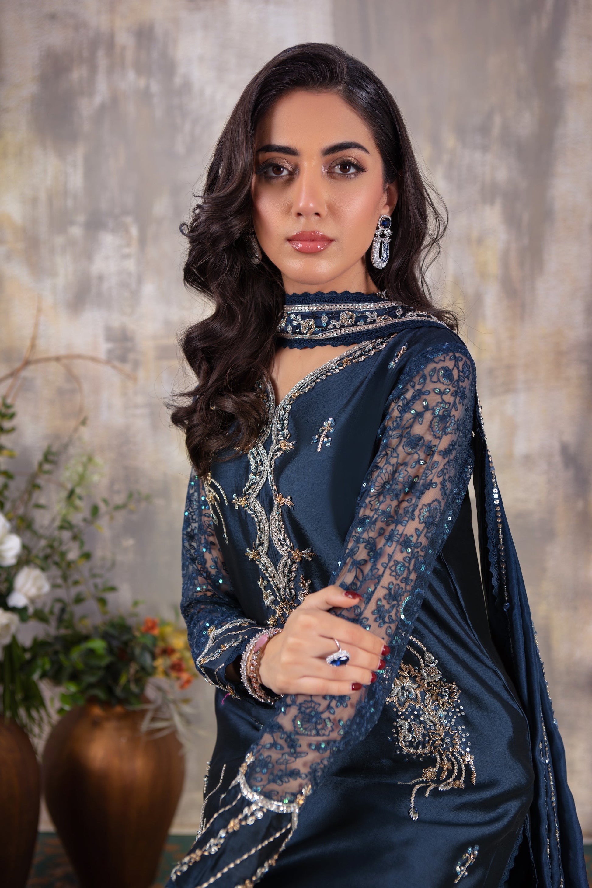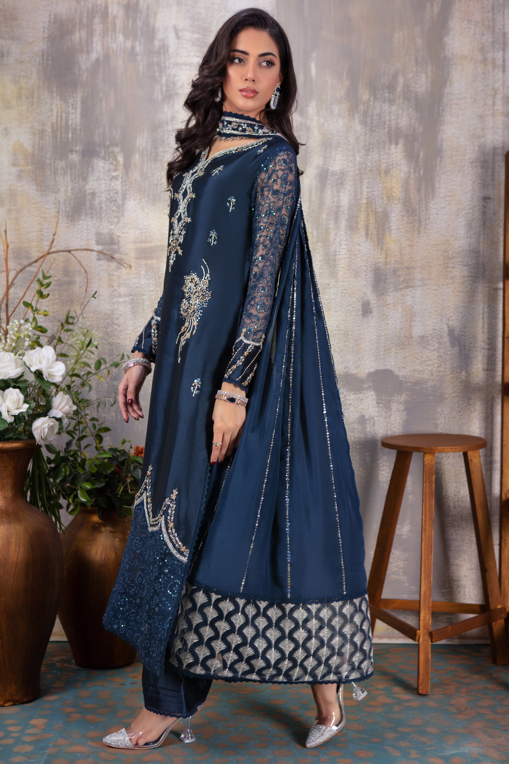 Make a statement in this stylish silk outfit, highlighted by exquisite silver and rose gold zardozi work. The look is completed with a chic dupatta featuring intricate sequin trellises for a touch of glamour.