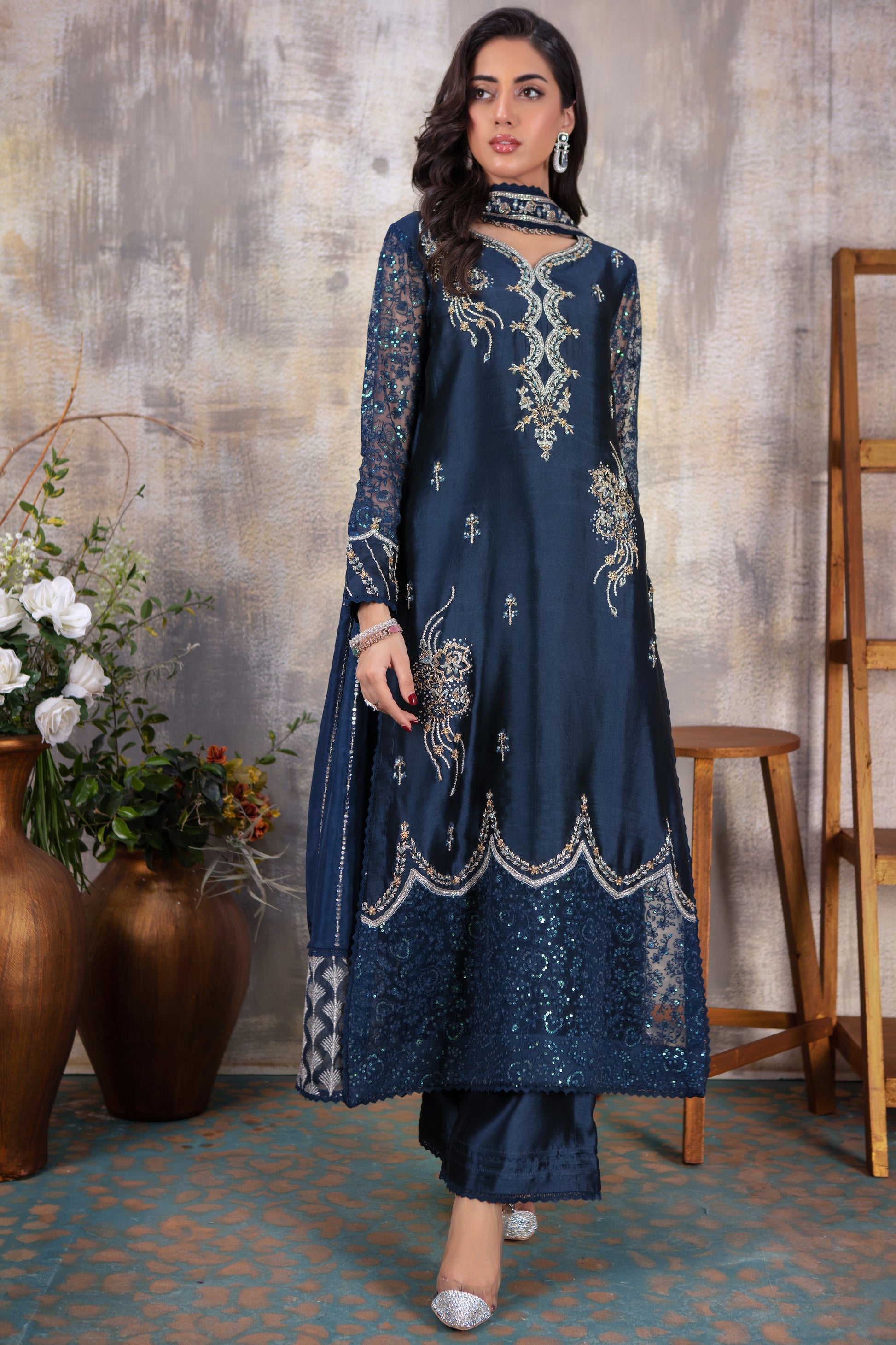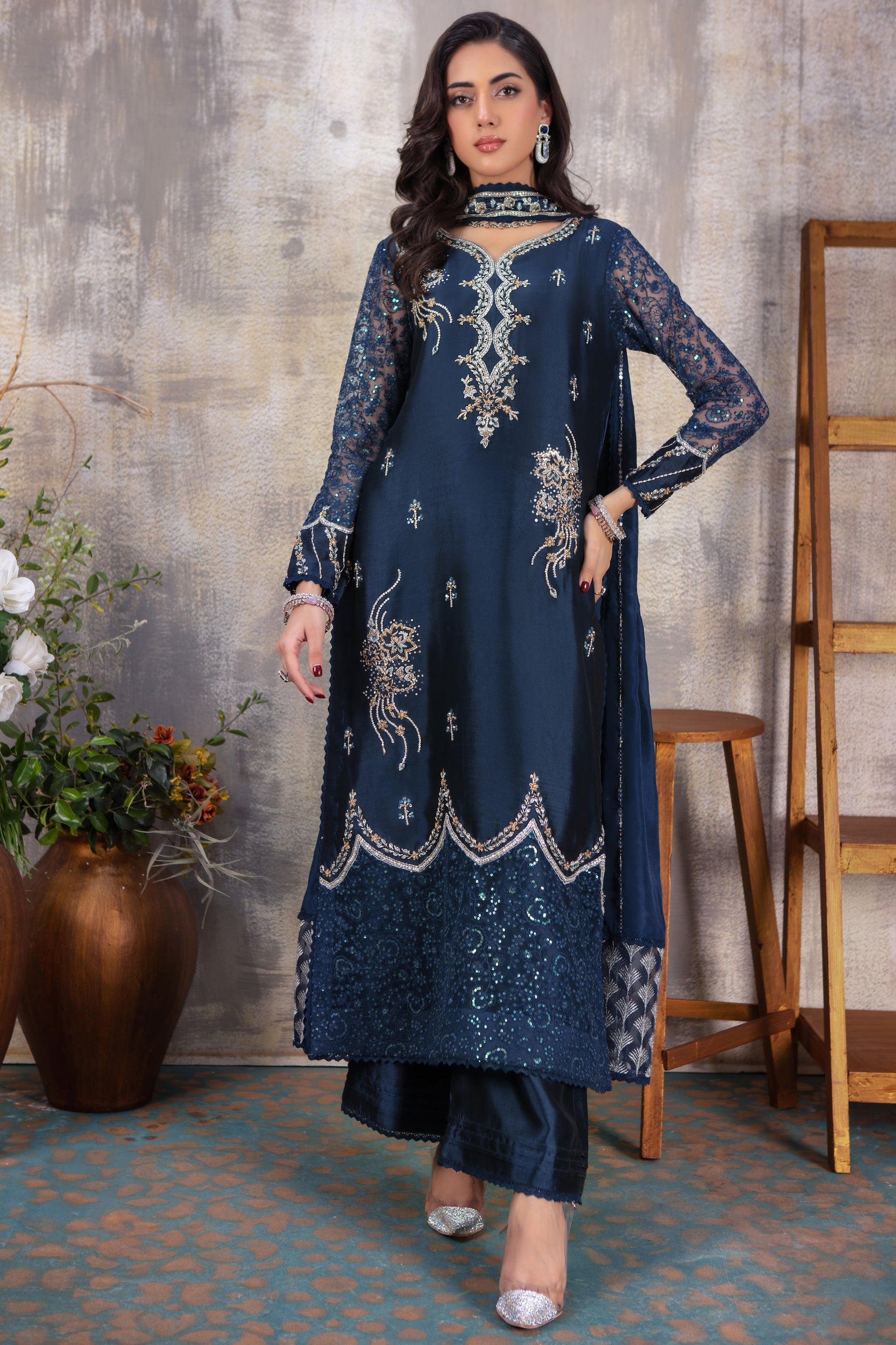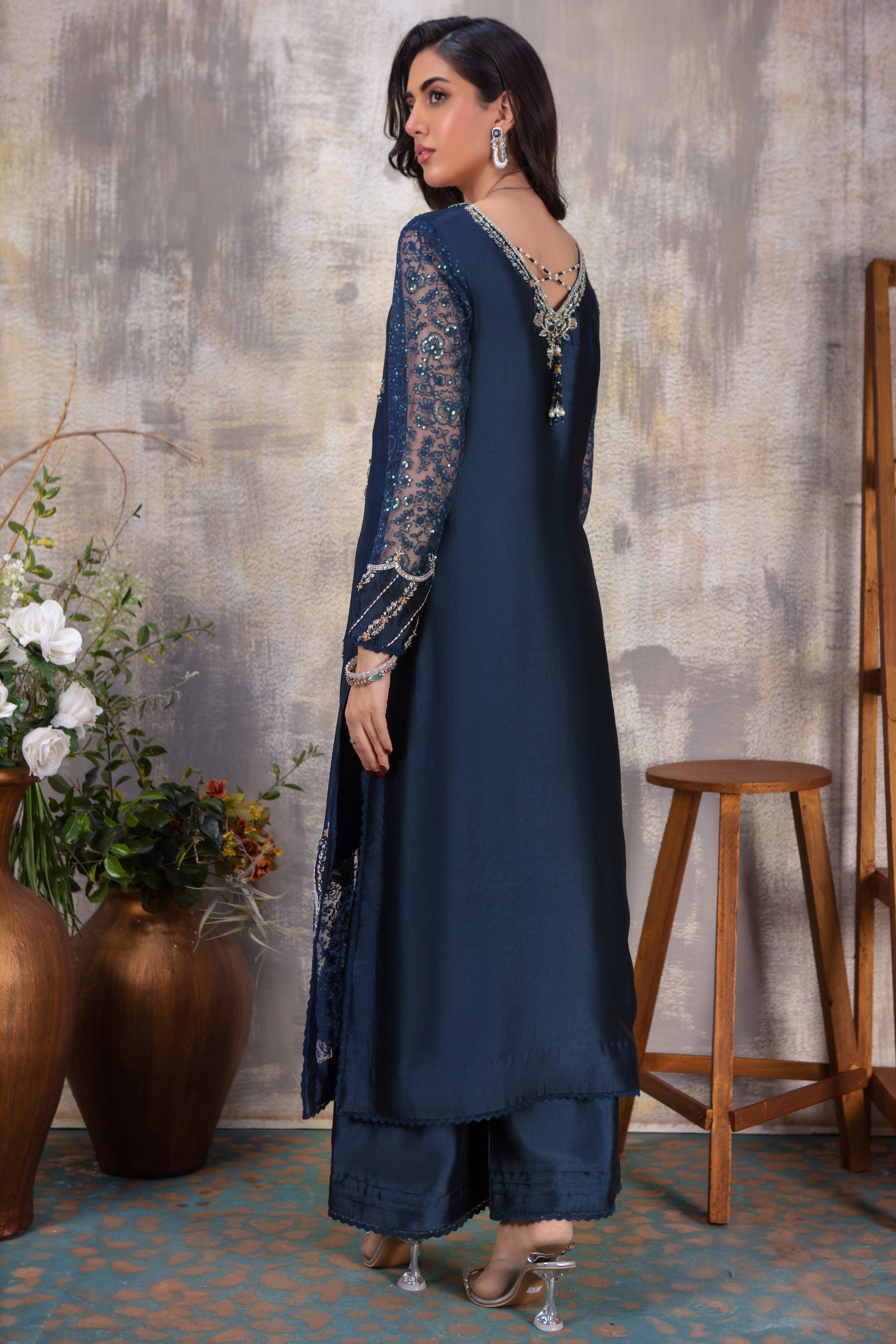 Make a statement in this stylish silk outfit, highlighted by exquisite silver and rose gold zardozi work. The look is completed with a chic dupatta featuring intricate sequin trellises for a touch of glamour.