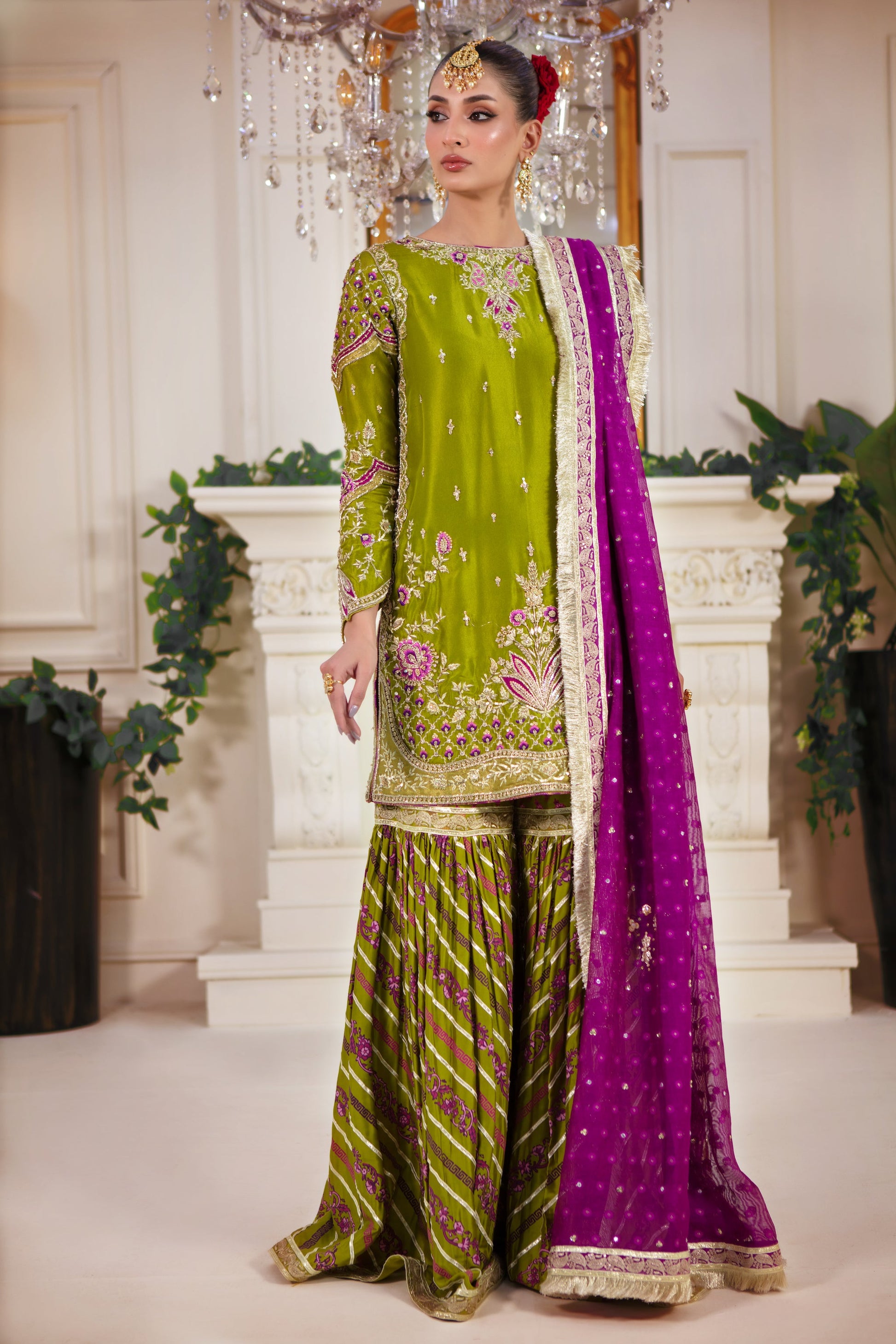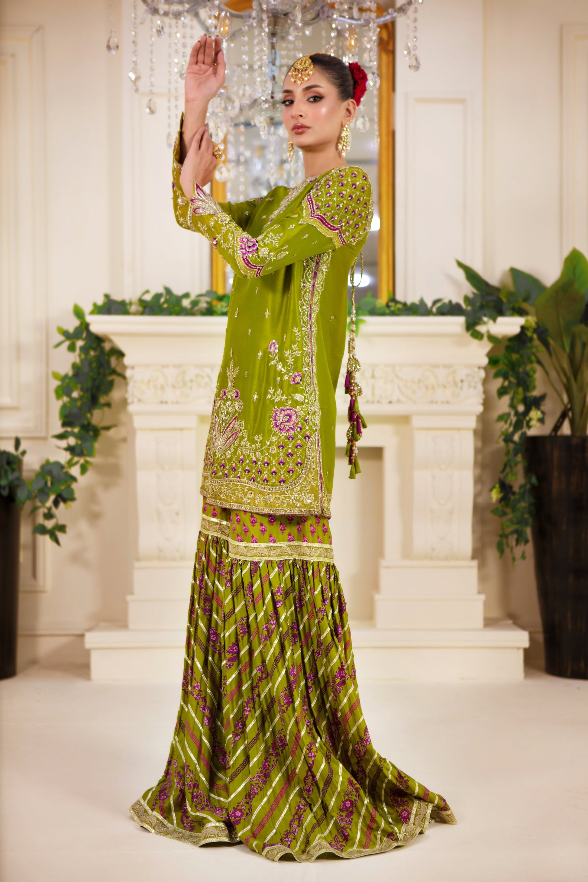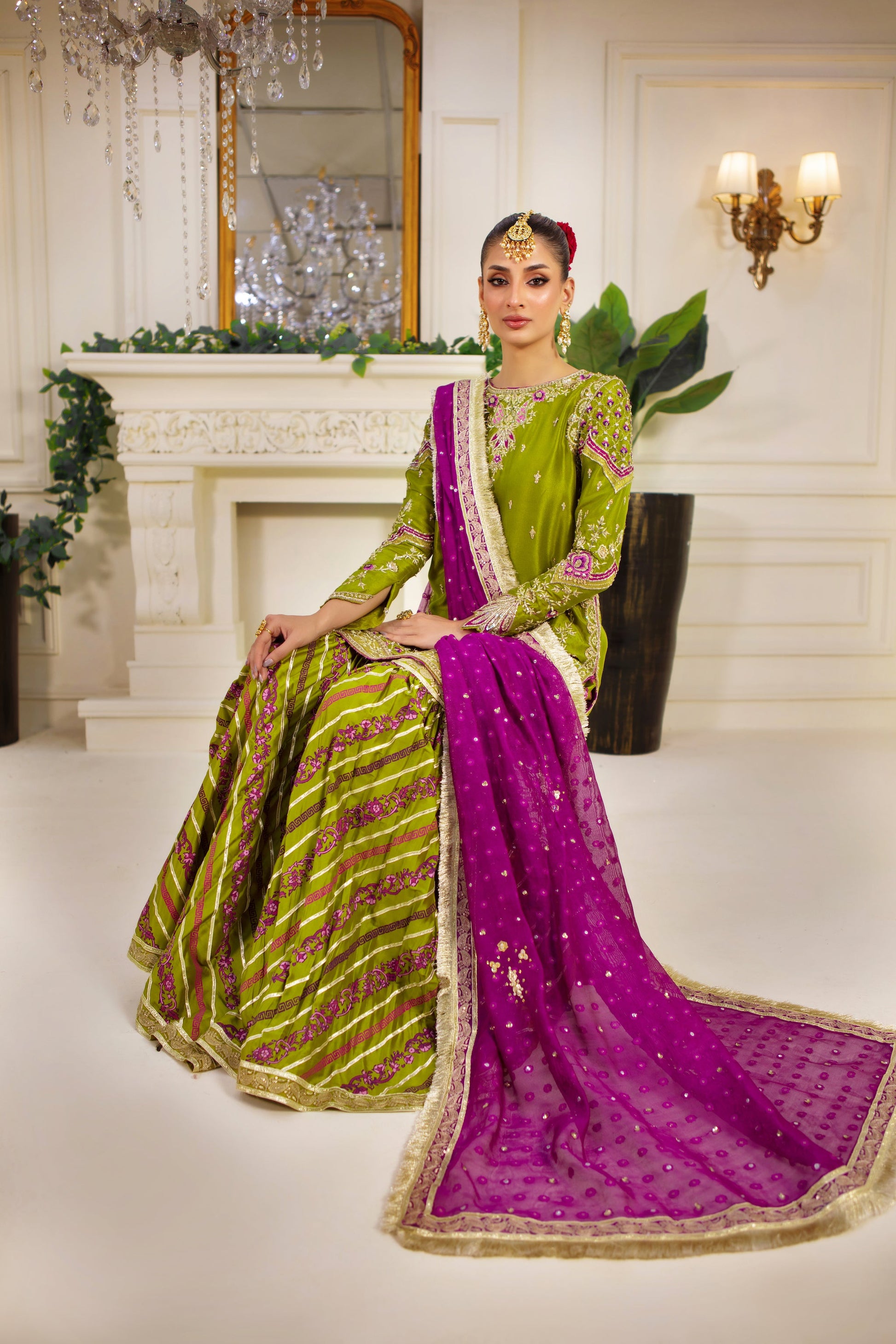 Cut from pure Raw silk this festive and traditional olive-green outfit is a beautiful blend of classic charm and vibrant details. It features intricate gota and zardozi work, with striking magenta and purple resham and applique accents adding a pop of color. The back neckline is adorned with stunning handcrafted tassel details, enhancing the outfit's elegance. Paired with a Hand block-printed gharara and a magenta embellished dupatta, this ensemble is perfect for mayun, mehndi, and other lively wedding festivities, making it a must-have for the occasion.