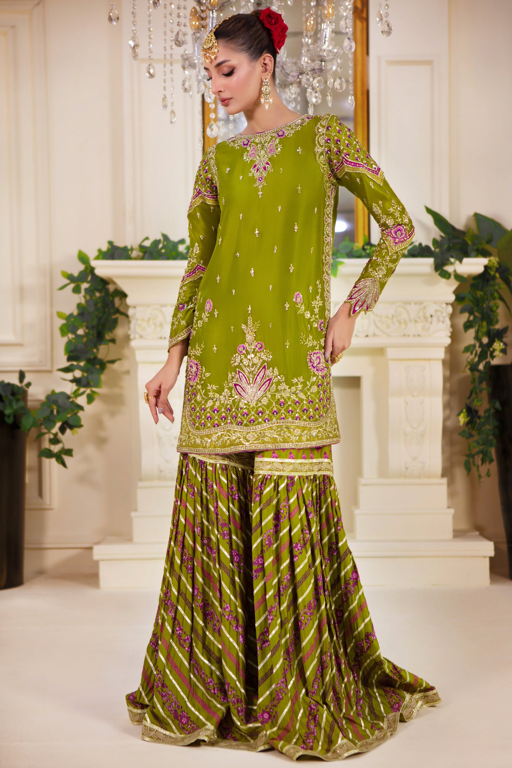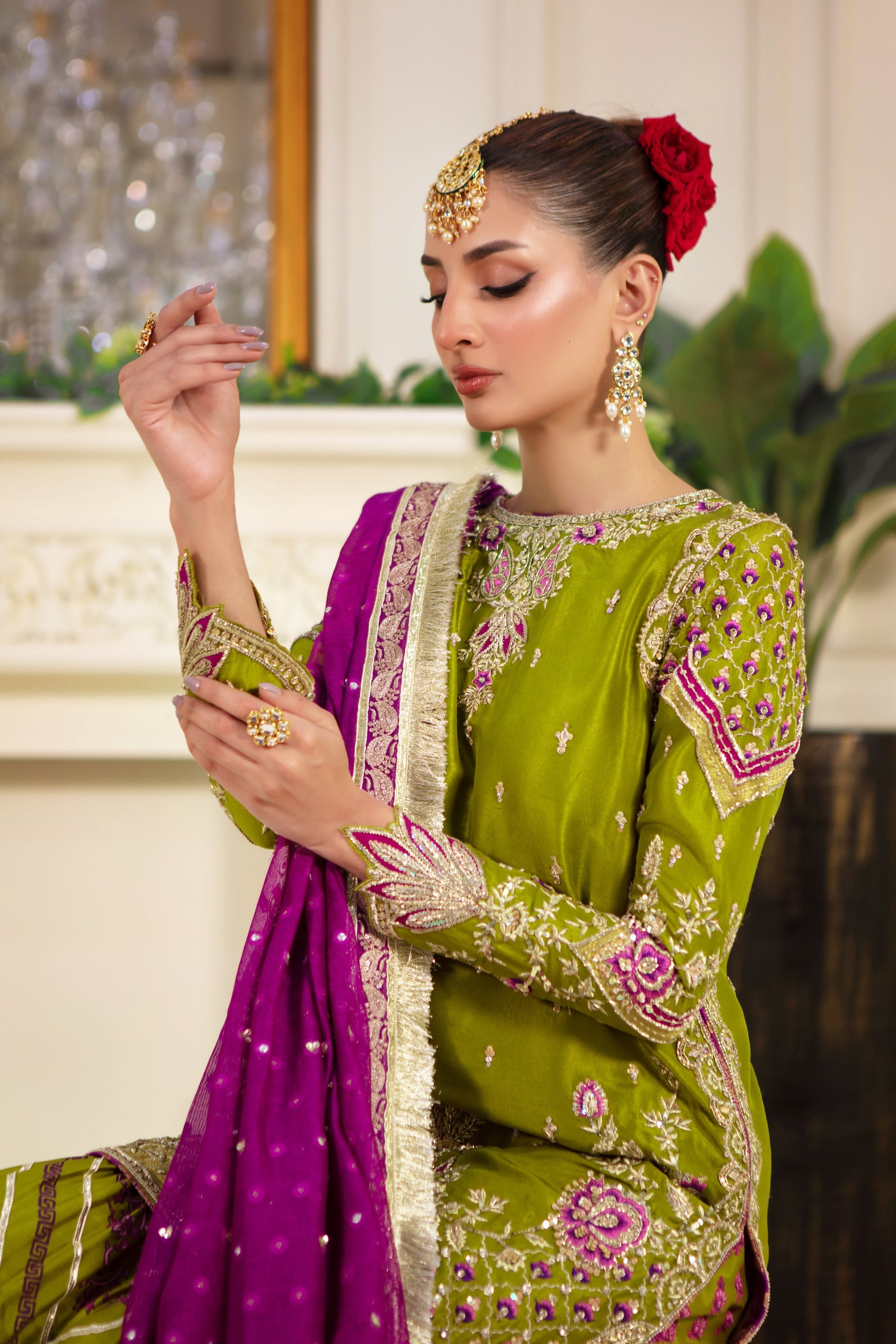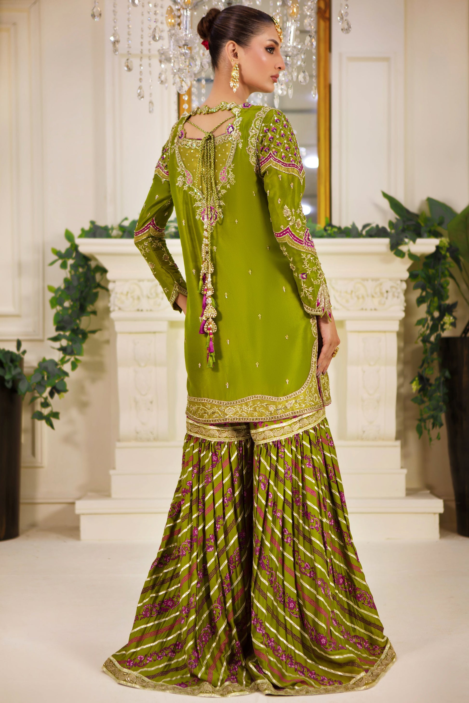 Cut from pure Raw silk this festive and traditional olive-green outfit is a beautiful blend of classic charm and vibrant details. It features intricate gota and zardozi work, with striking magenta and purple resham and applique accents adding a pop of color. The back neckline is adorned with stunning handcrafted tassel details, enhancing the outfit's elegance. Paired with a Hand block-printed gharara and a magenta embellished dupatta, this ensemble is perfect for mayun, mehndi, and other lively wedding festivities, making it a must-have for the occasion.