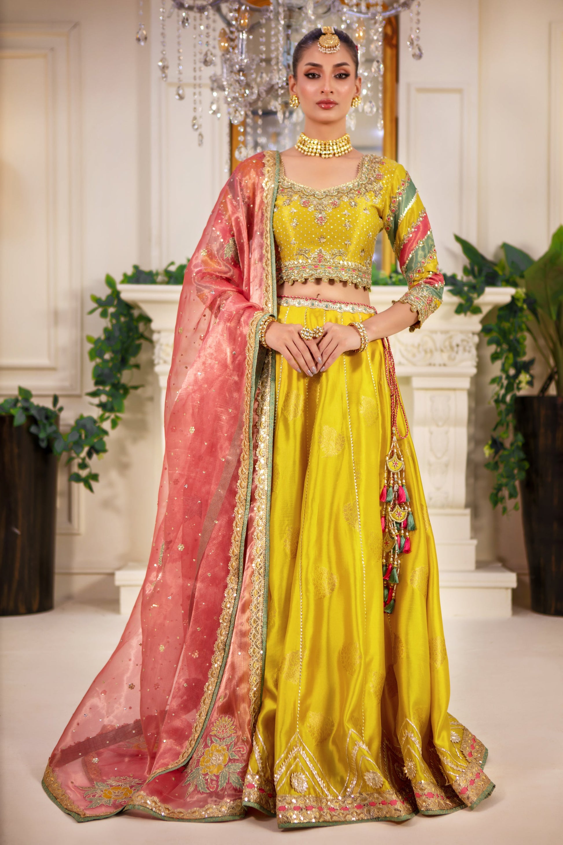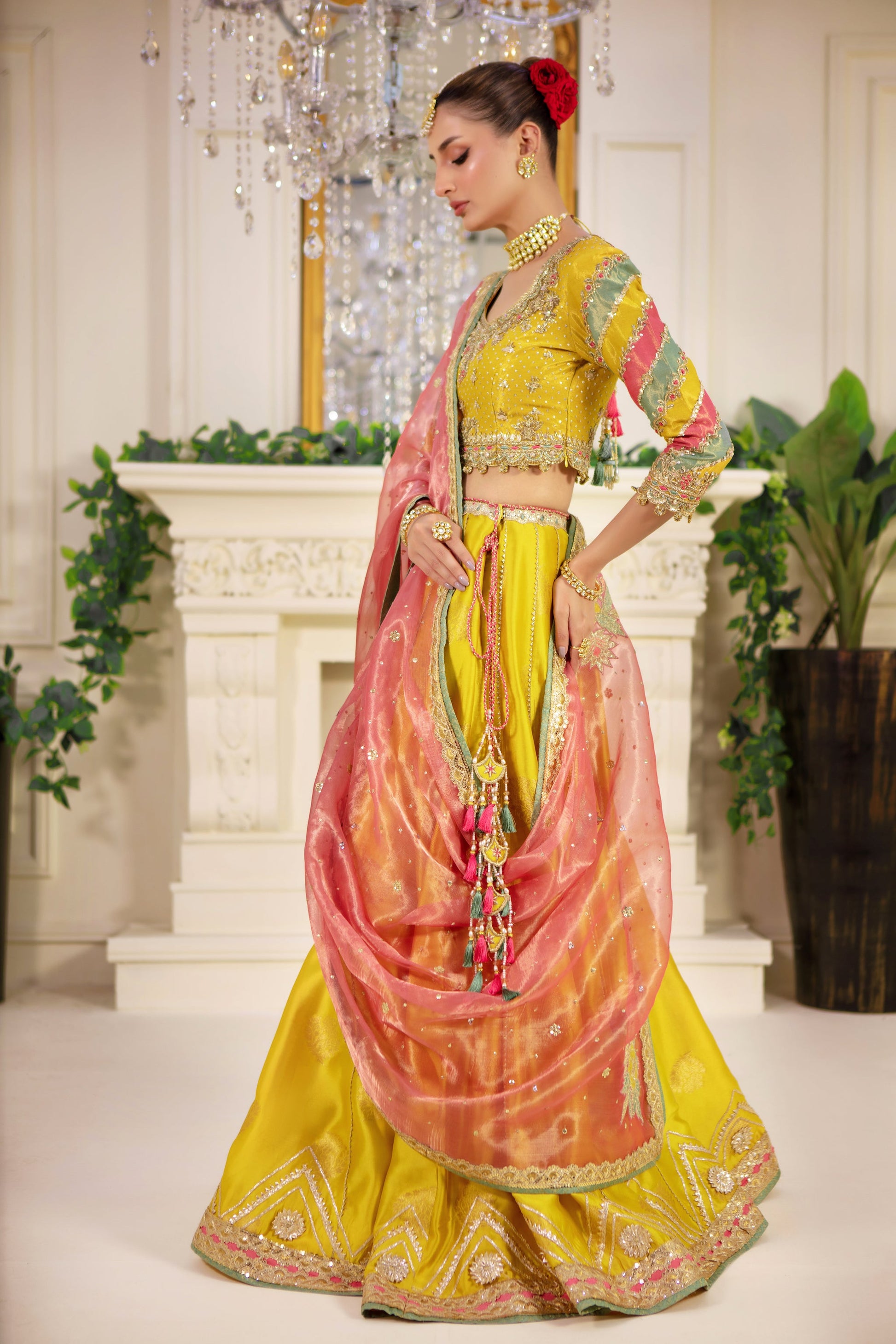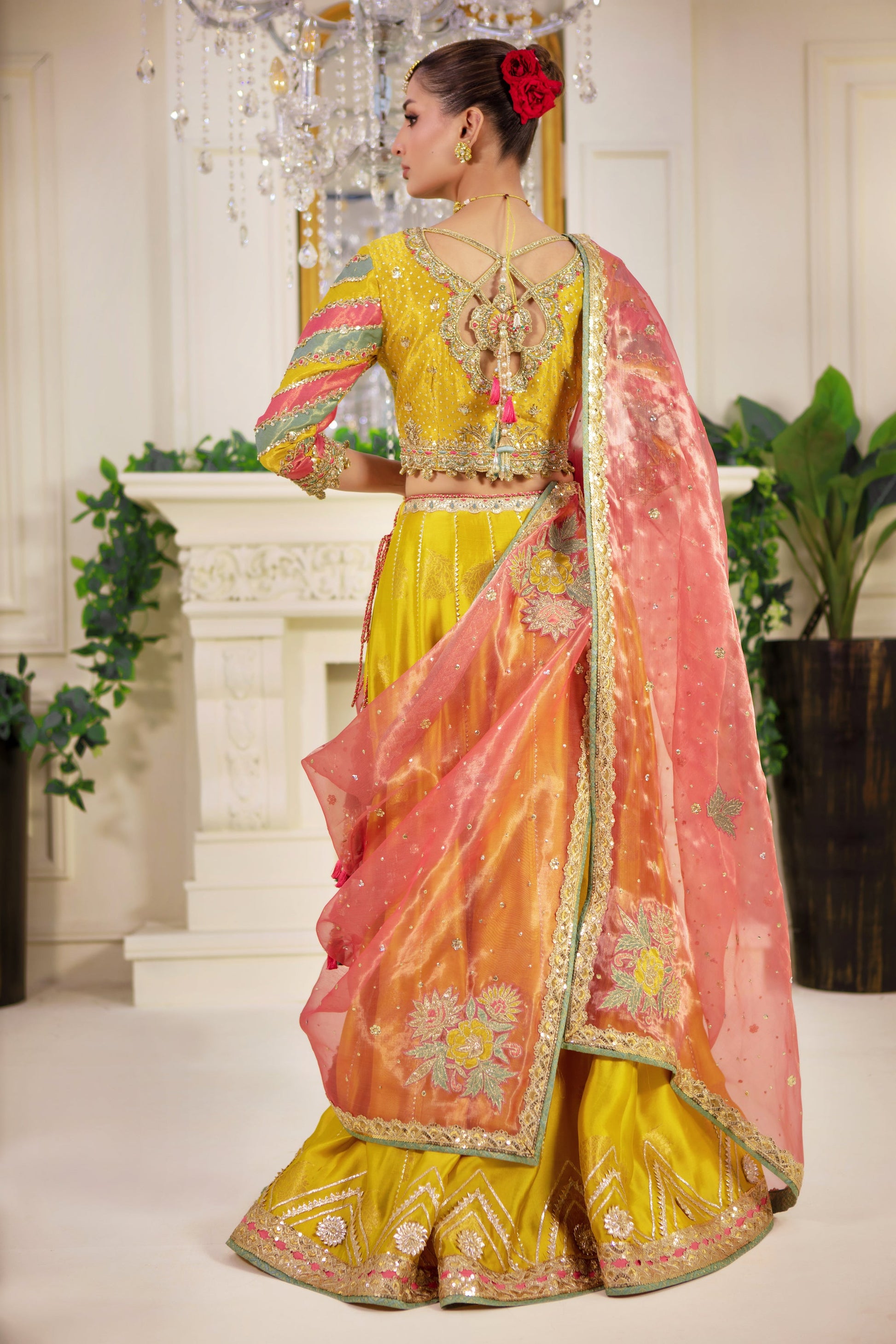 This festive and vibrant Lehenga choli is a celebration of color and craftsmanship, featuring intricate zardozi work and bold color-blocked sleeves. The stylish cut-out back neckline is adorned with handcrafted tassels and gota floral hangings, adding a playful yet elegant touch. Paired with a jacquard silk lehenga, the ensemble showcases stunning gota ribbon and floral detailing that enhance its festive charm. A heavily embellished pink dupatta with applique work motifs and a beautifully finished border completes this lively outfit, making it perfect for mehendi, mayon and other wedding festivities.