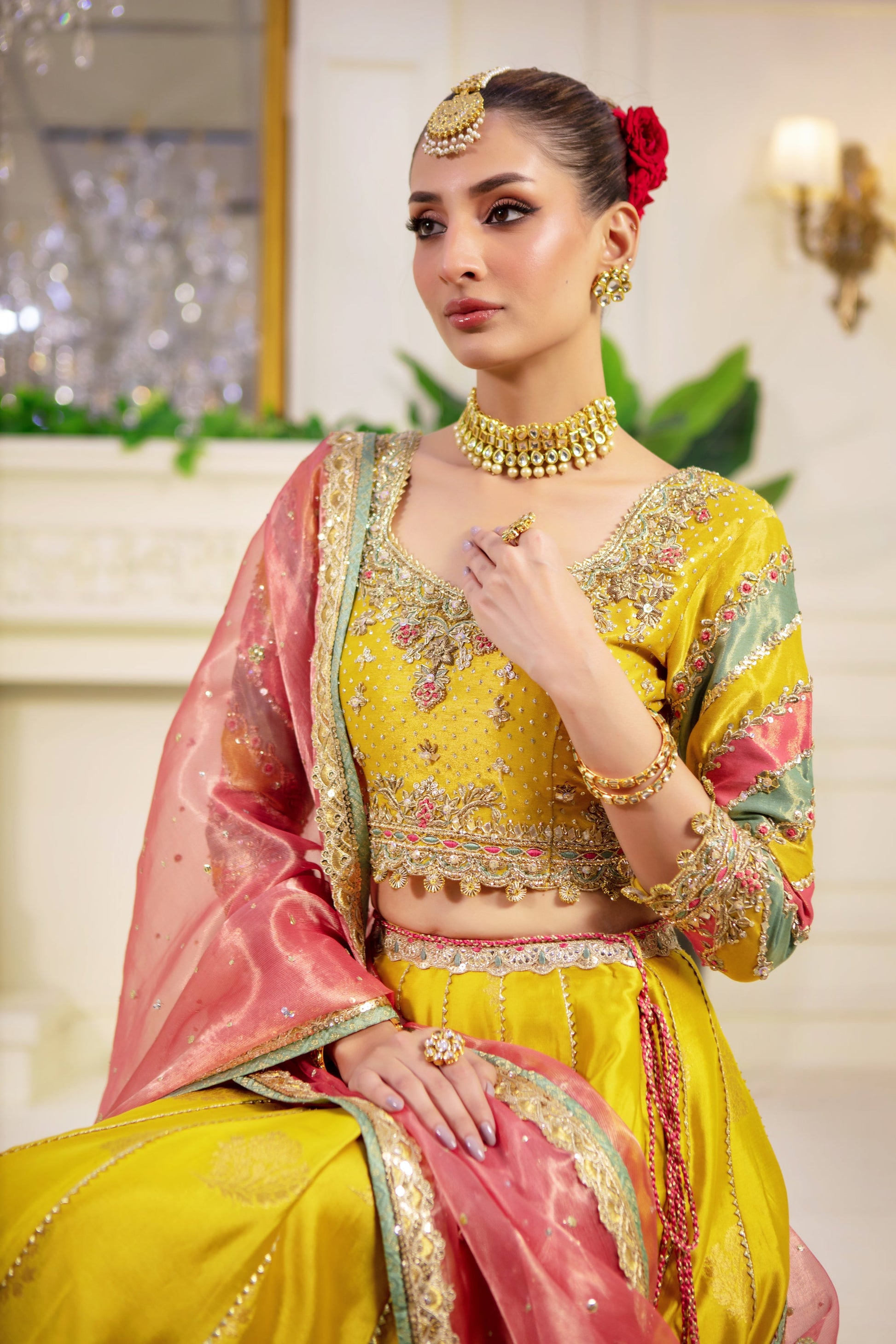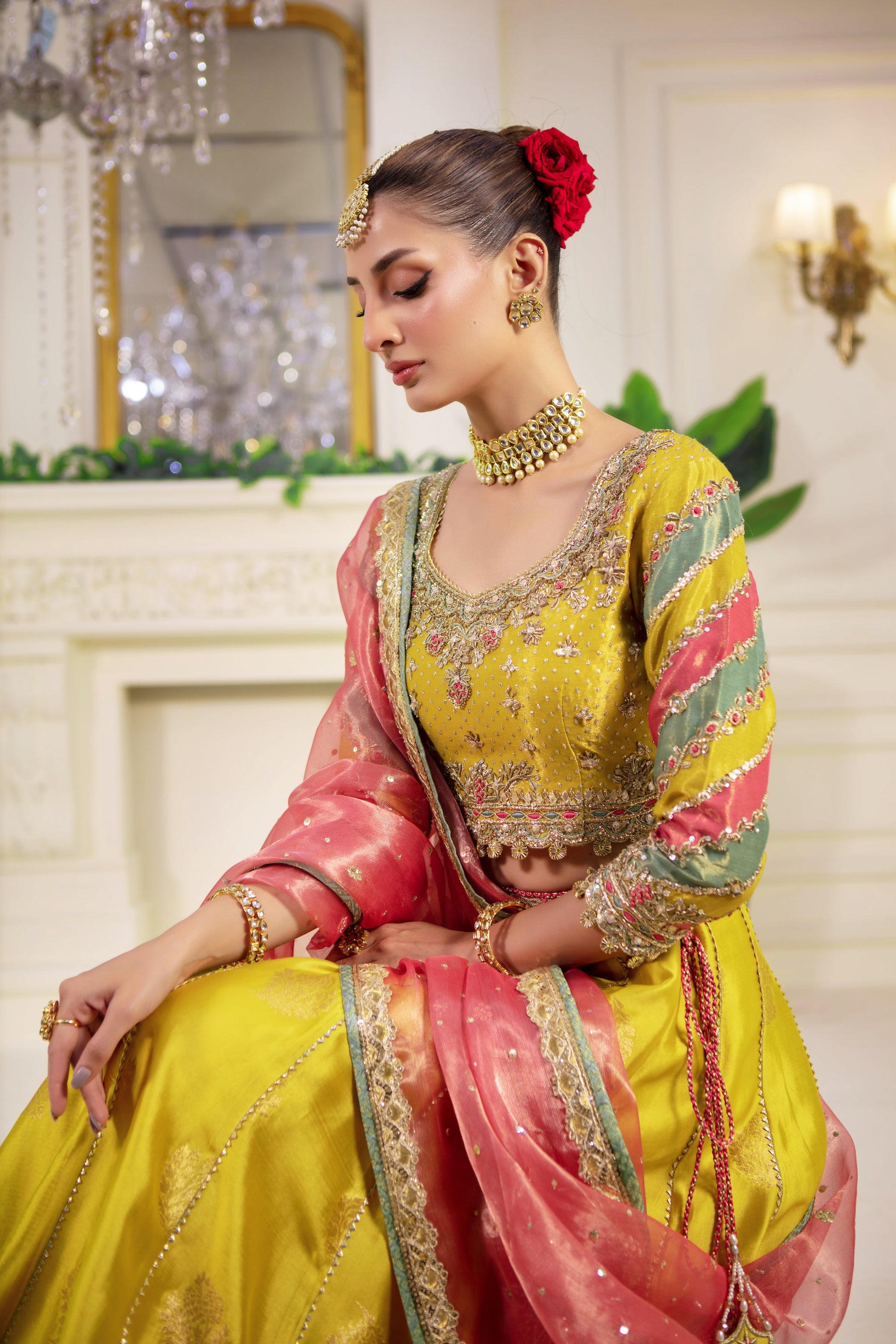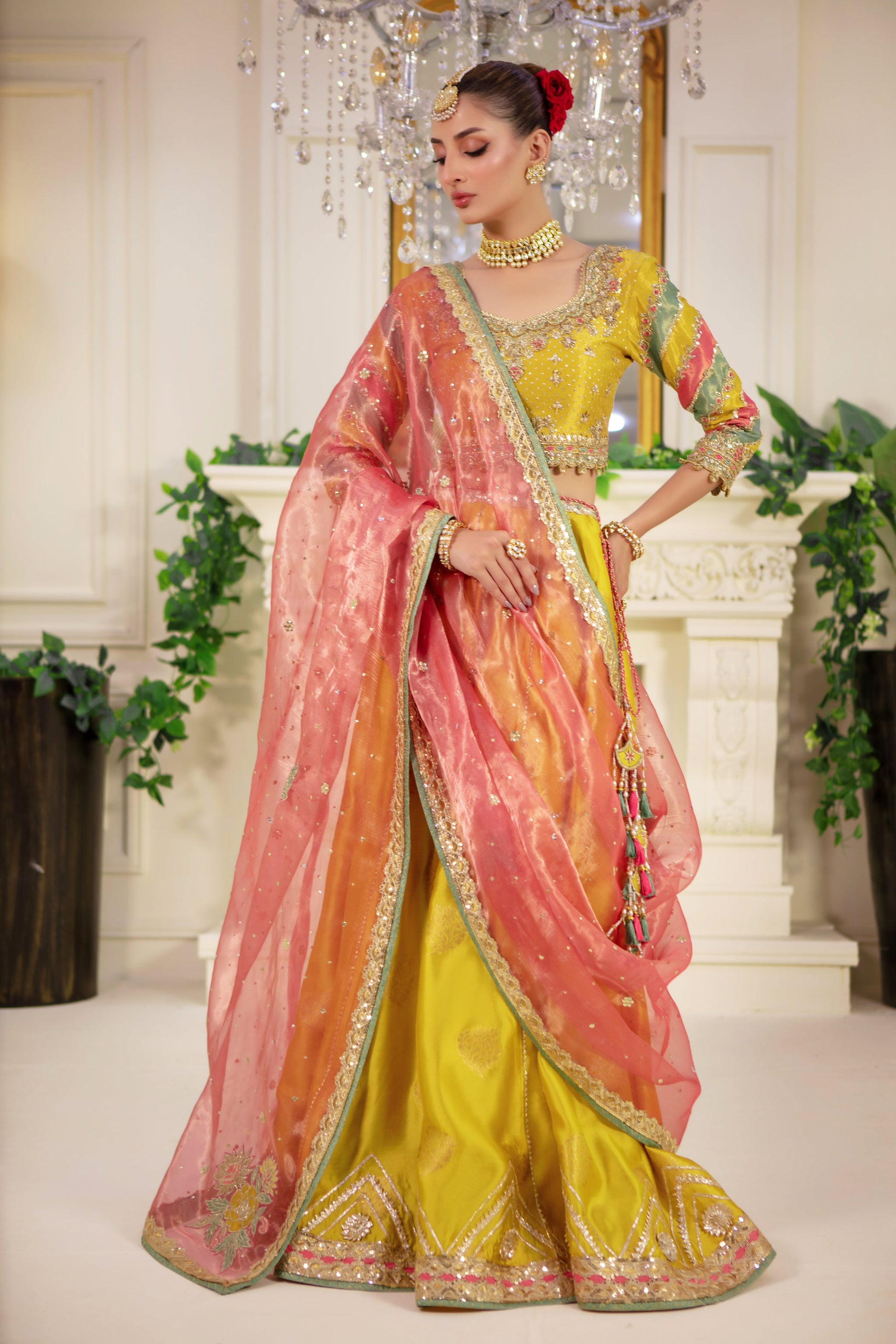 This festive and vibrant Lehenga choli is a celebration of color and craftsmanship, featuring intricate zardozi work and bold color-blocked sleeves. The stylish cut-out back neckline is adorned with handcrafted tassels and gota floral hangings, adding a playful yet elegant touch. Paired with a jacquard silk lehenga, the ensemble showcases stunning gota ribbon and floral detailing that enhance its festive charm. A heavily embellished pink dupatta with applique work motifs and a beautifully finished border completes this lively outfit, making it perfect for mehendi, mayon and other wedding festivities.