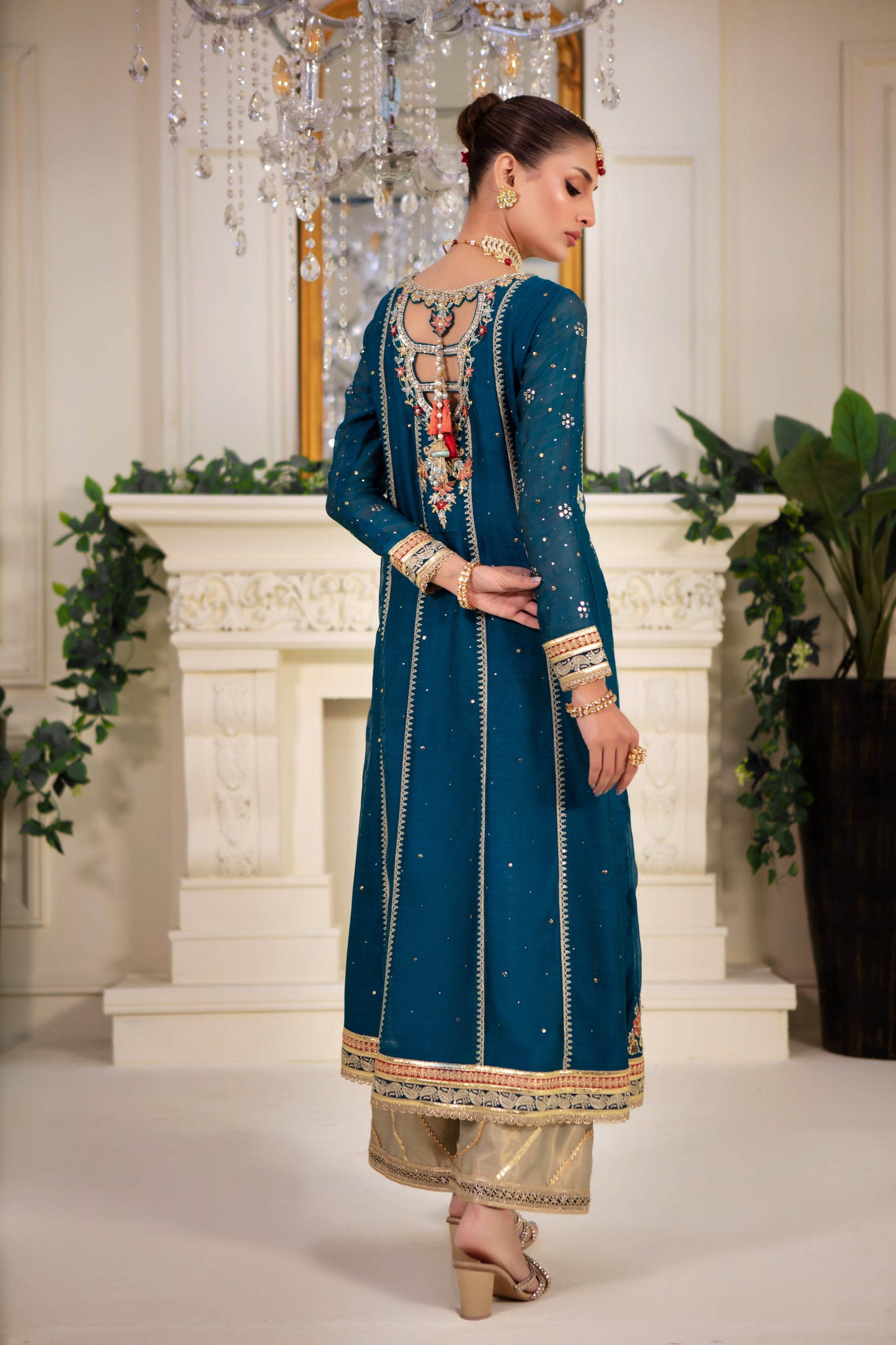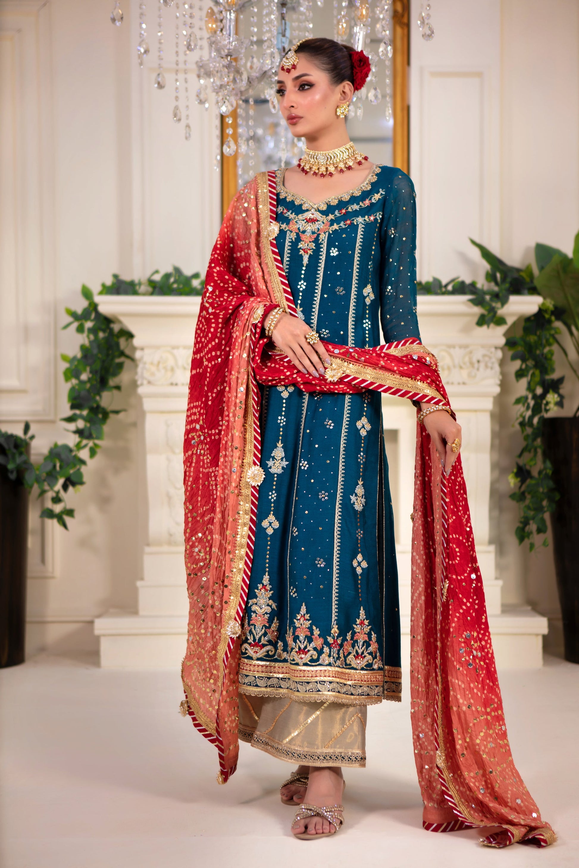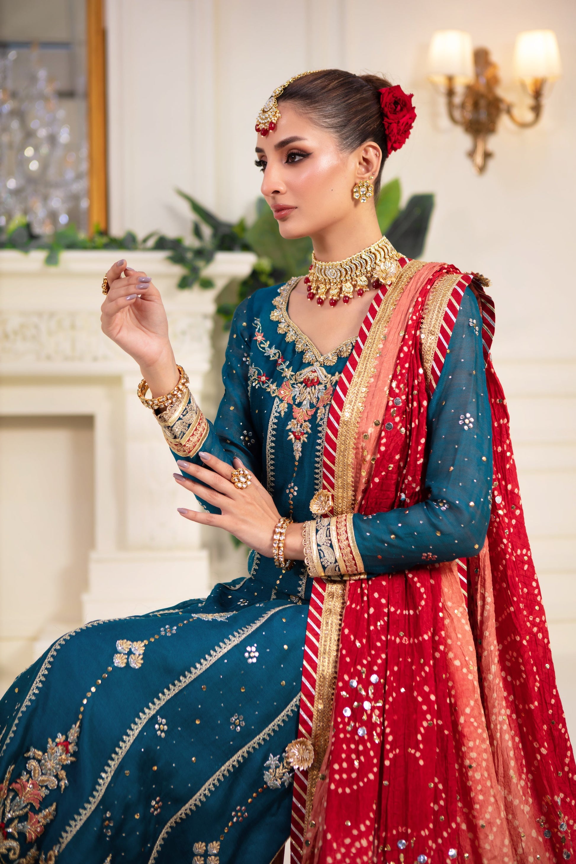 Stunning A-line teal blue shirt is a fusion of tradition and contemporary elegance, featuring intricate botanical embroidery with zardozi and resham work. Pops of rust and coral hues enhance the detailed embroidery, while kamdani work adds a touch of sparkle across the shirt. The cut-out back, adorned with handcrafted tassels, exudes festive charm. Paired with a stunning pure silk chunri dupatta adorned with kamdani work and gota-embellished zari silk izaar pants, this ensemble is a perfect blend of festive allure and modern flair, making it a must-have for wedding celebrations.