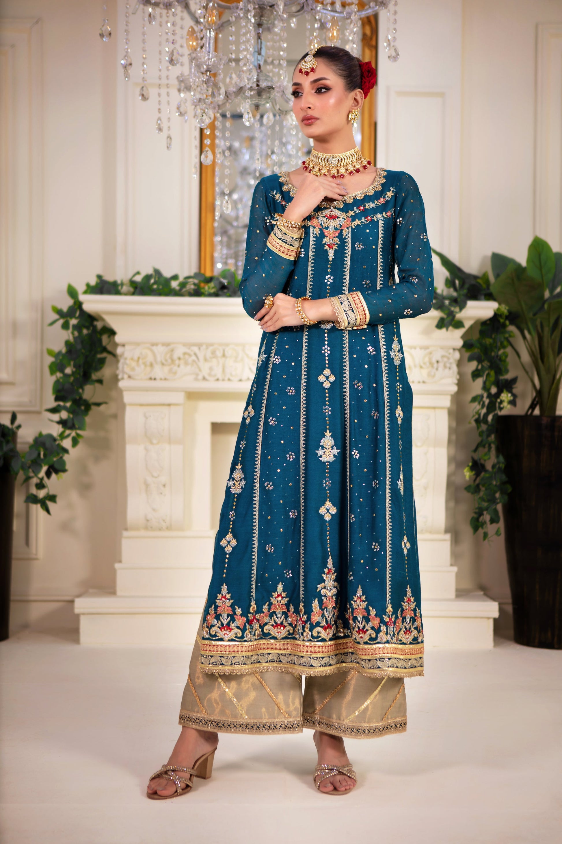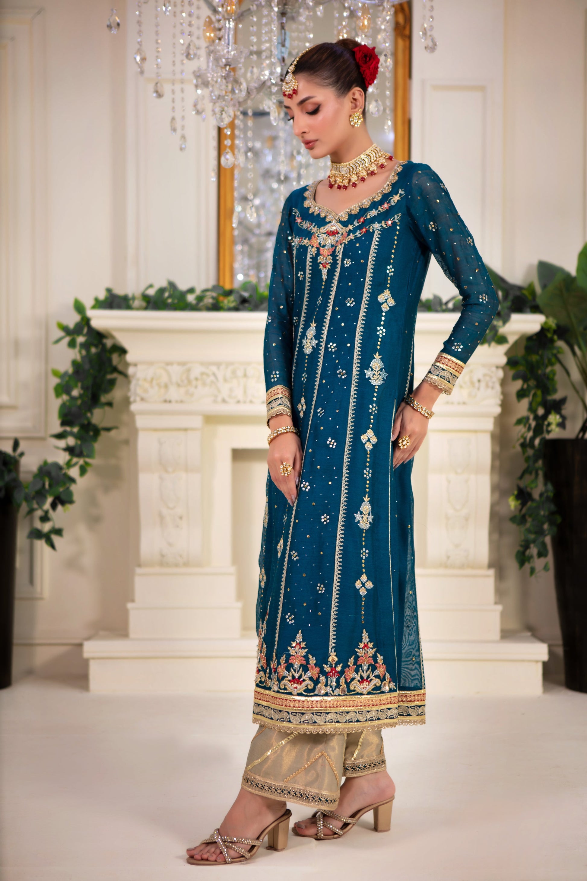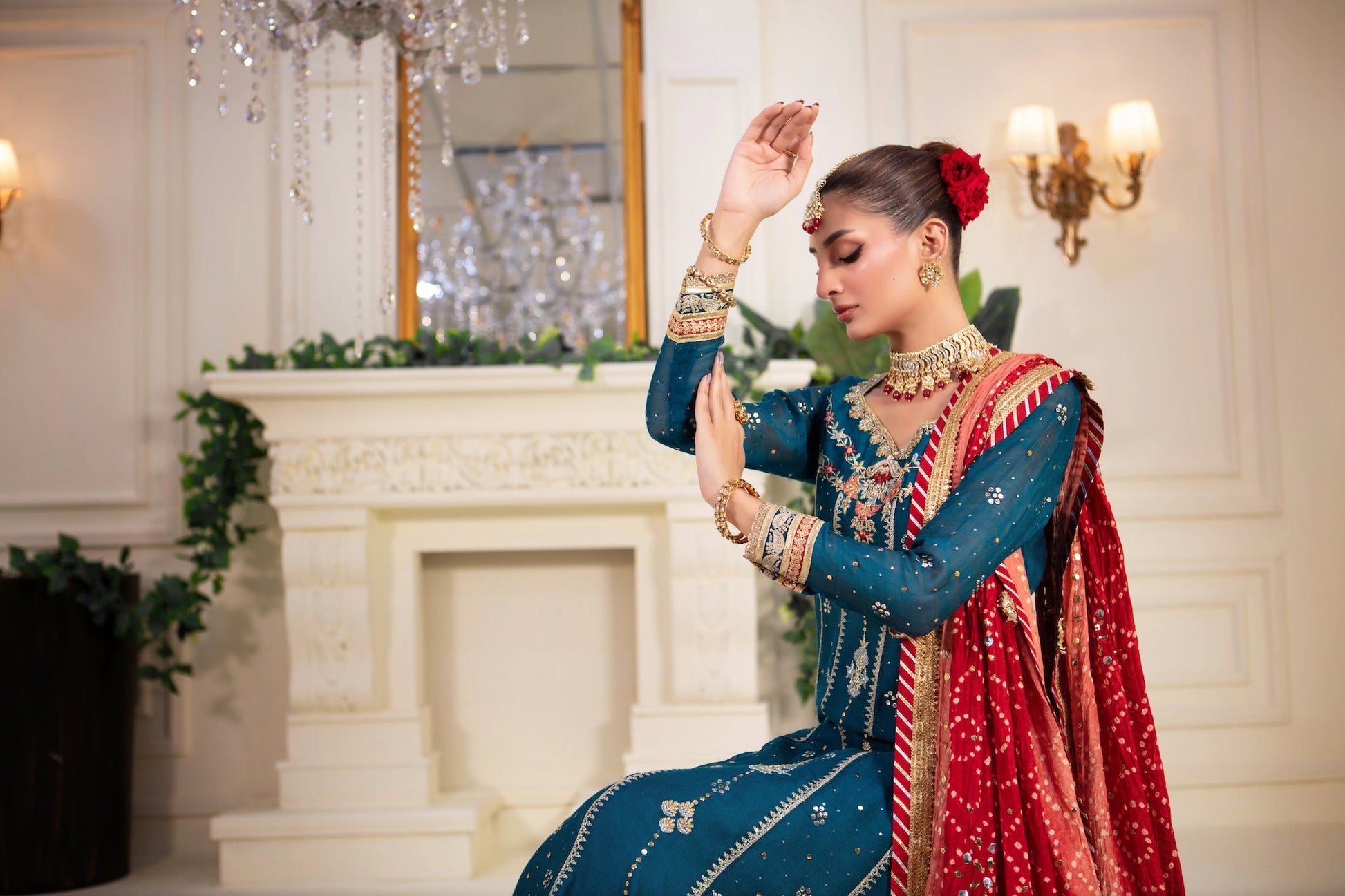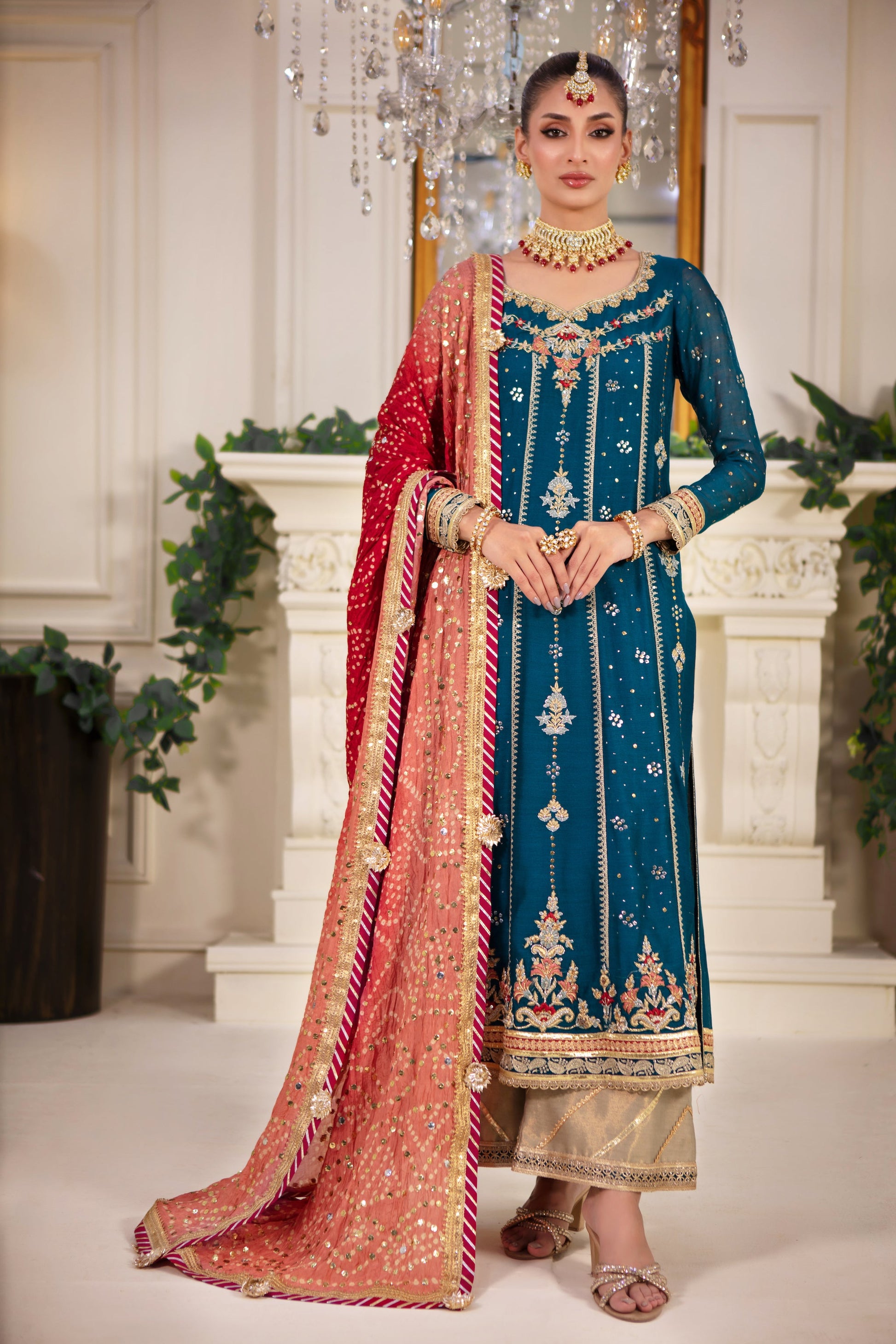 Stunning A-line teal blue shirt is a fusion of tradition and contemporary elegance, featuring intricate botanical embroidery with zardozi and resham work. Pops of rust and coral hues enhance the detailed embroidery, while kamdani work adds a touch of sparkle across the shirt. The cut-out back, adorned with handcrafted tassels, exudes festive charm. Paired with a stunning pure silk chunri dupatta adorned with kamdani work and gota-embellished zari silk izaar pants, this ensemble is a perfect blend of festive allure and modern flair, making it a must-have for wedding celebrations.