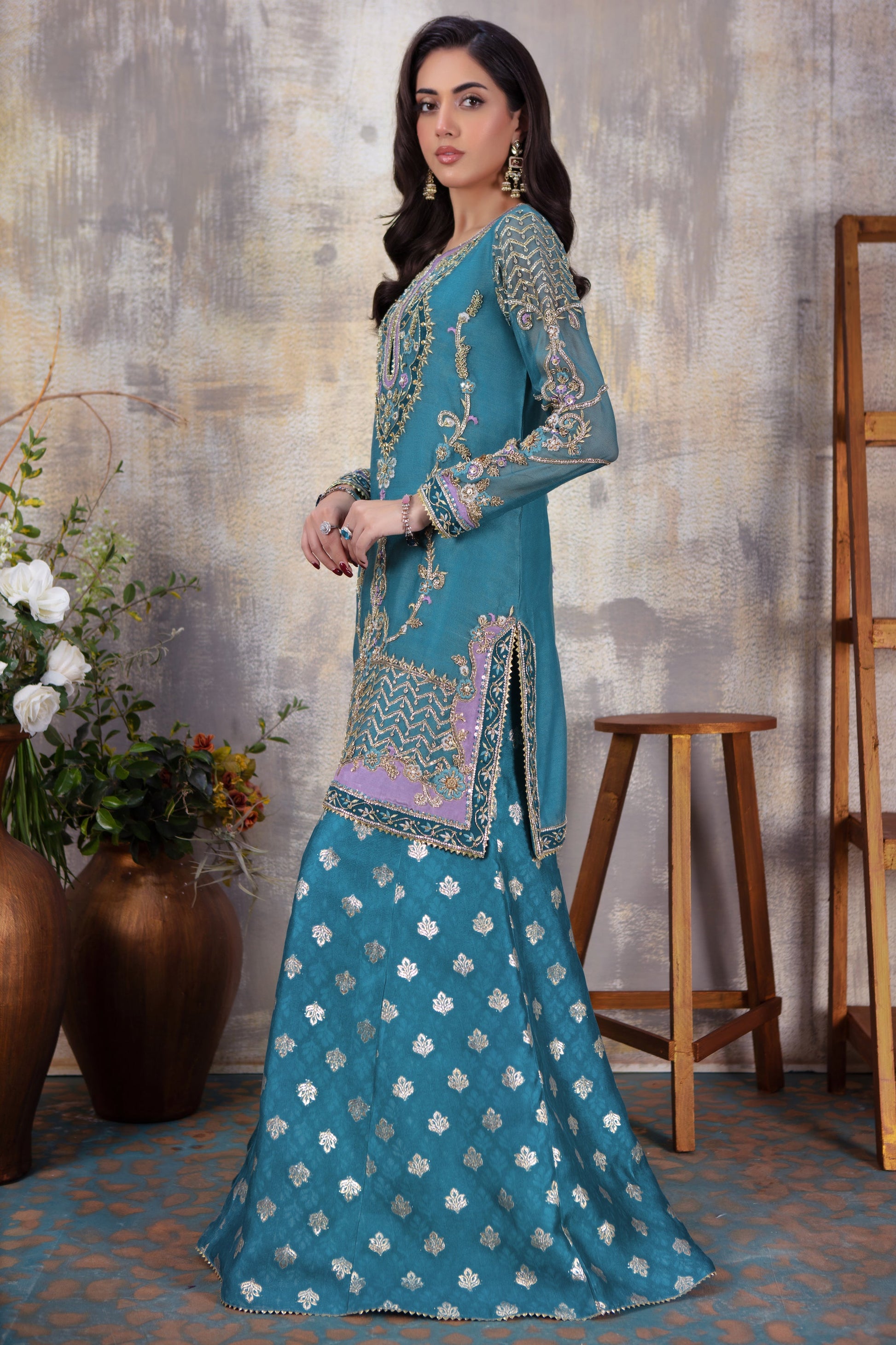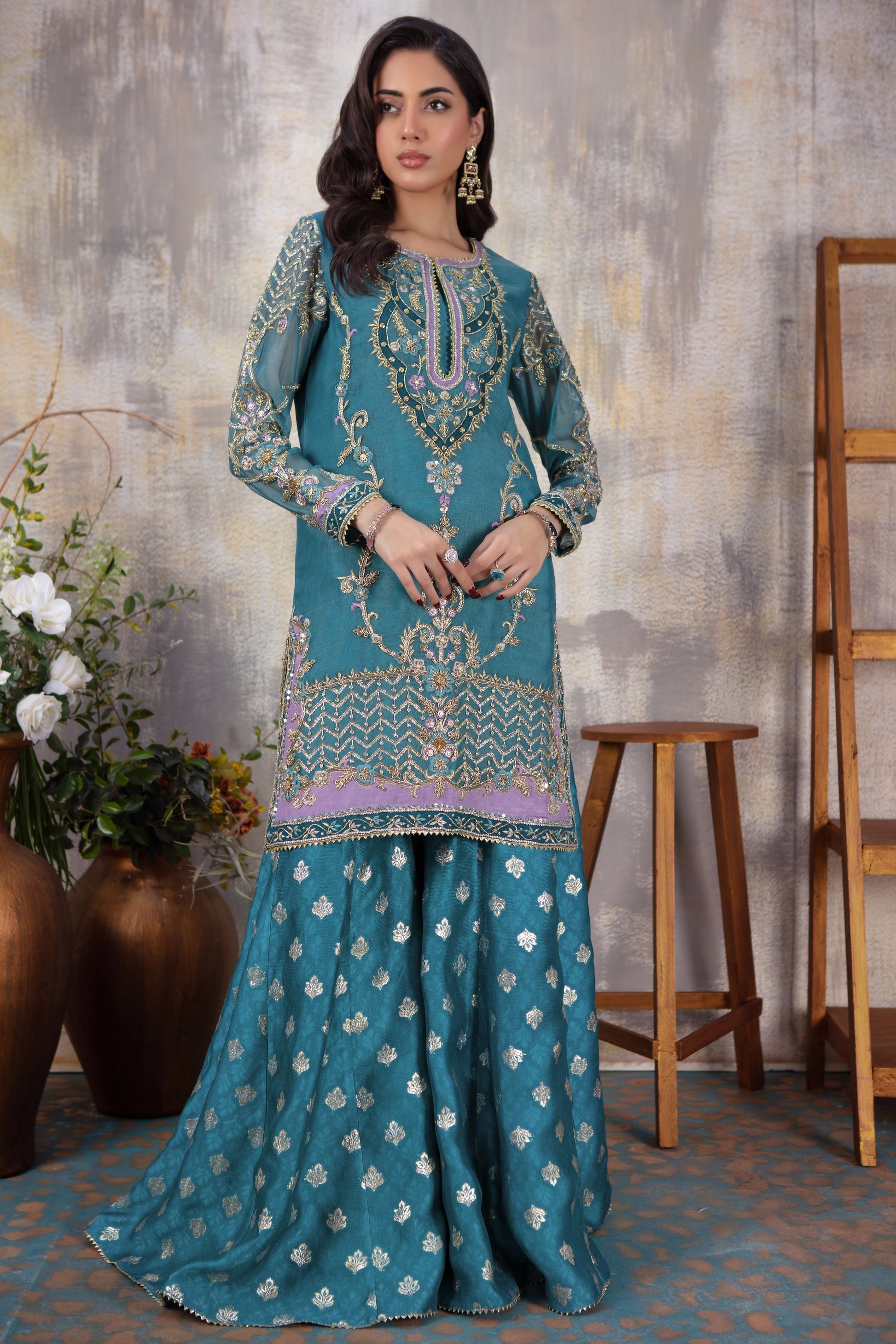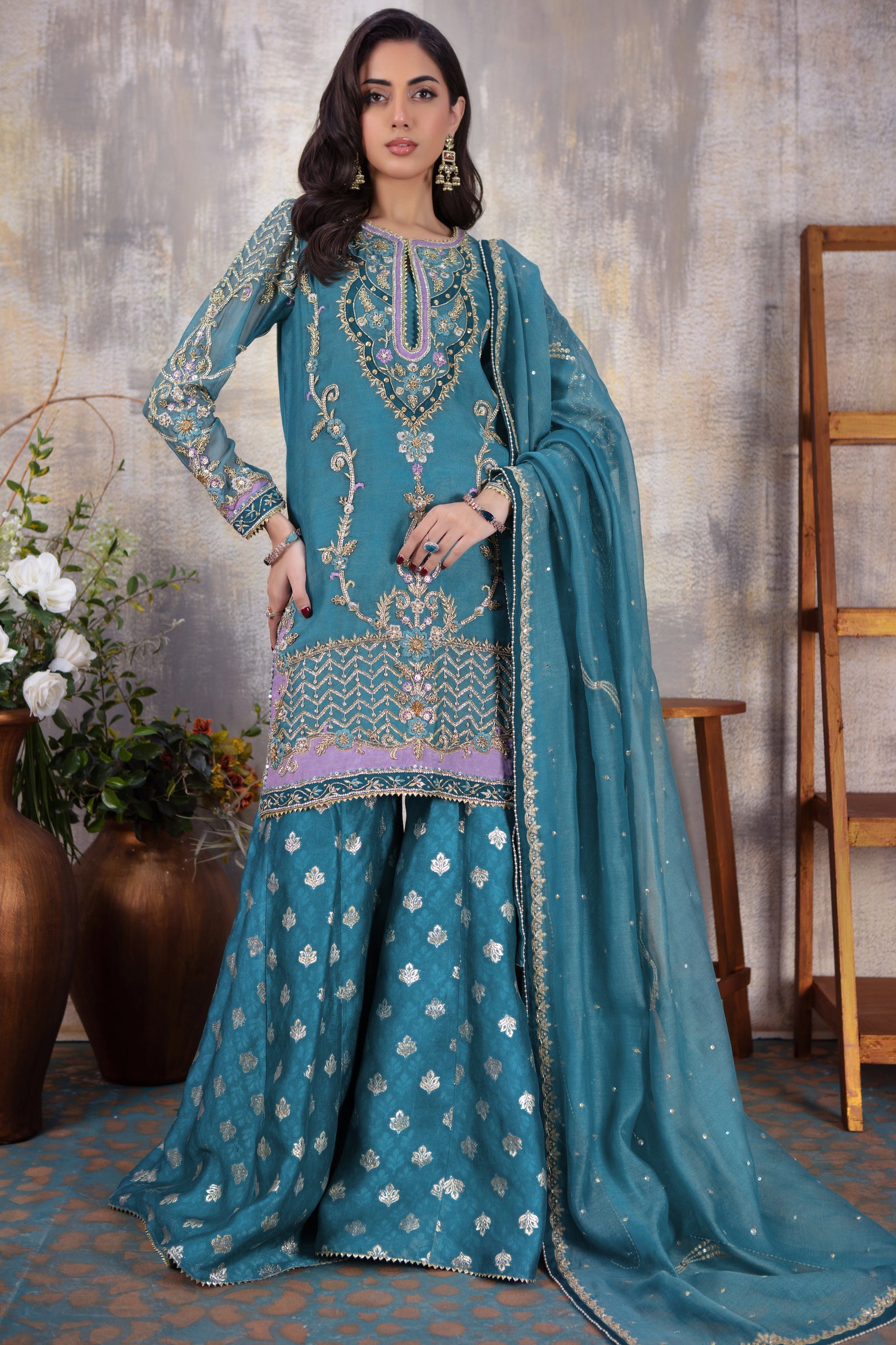 A chic short shirt adorned with gold zardozi and intricate applique work, exuding refined elegance. Paired with panelled Dhaka pants and a hand-embellished dupatta, it creates a timeless, regal ensemble.