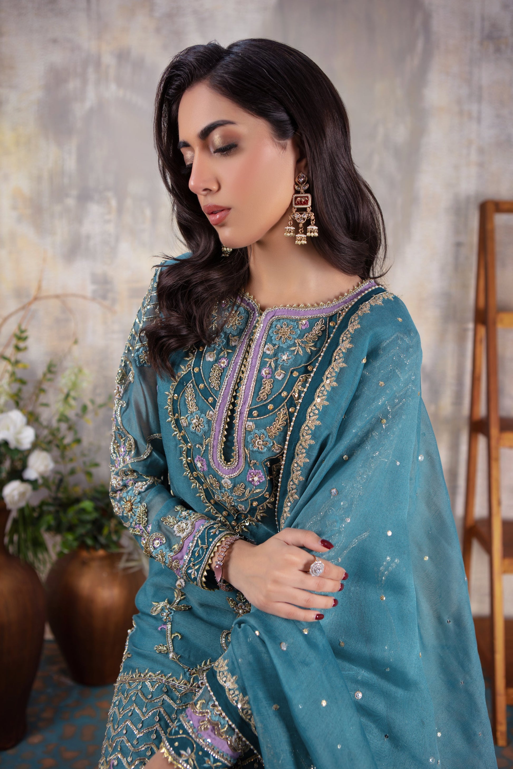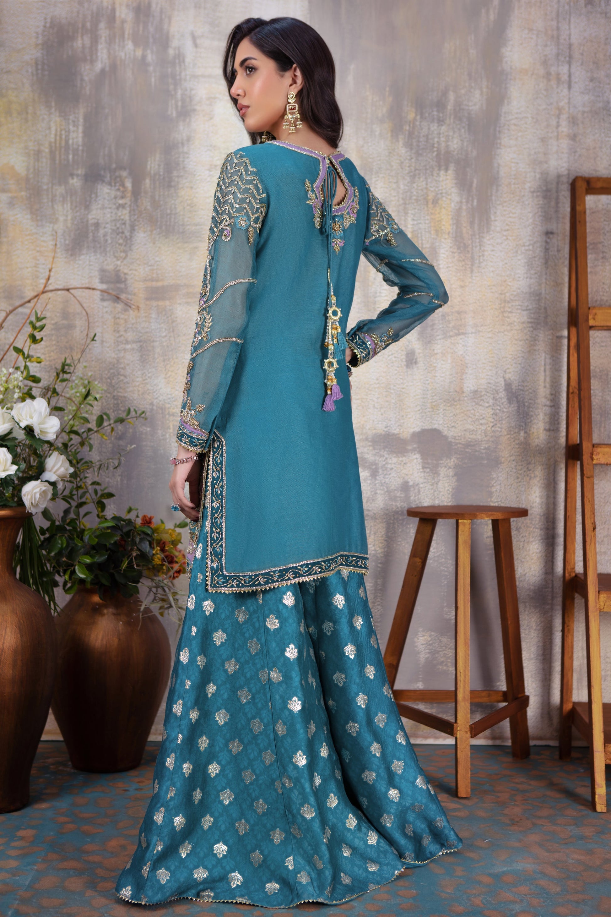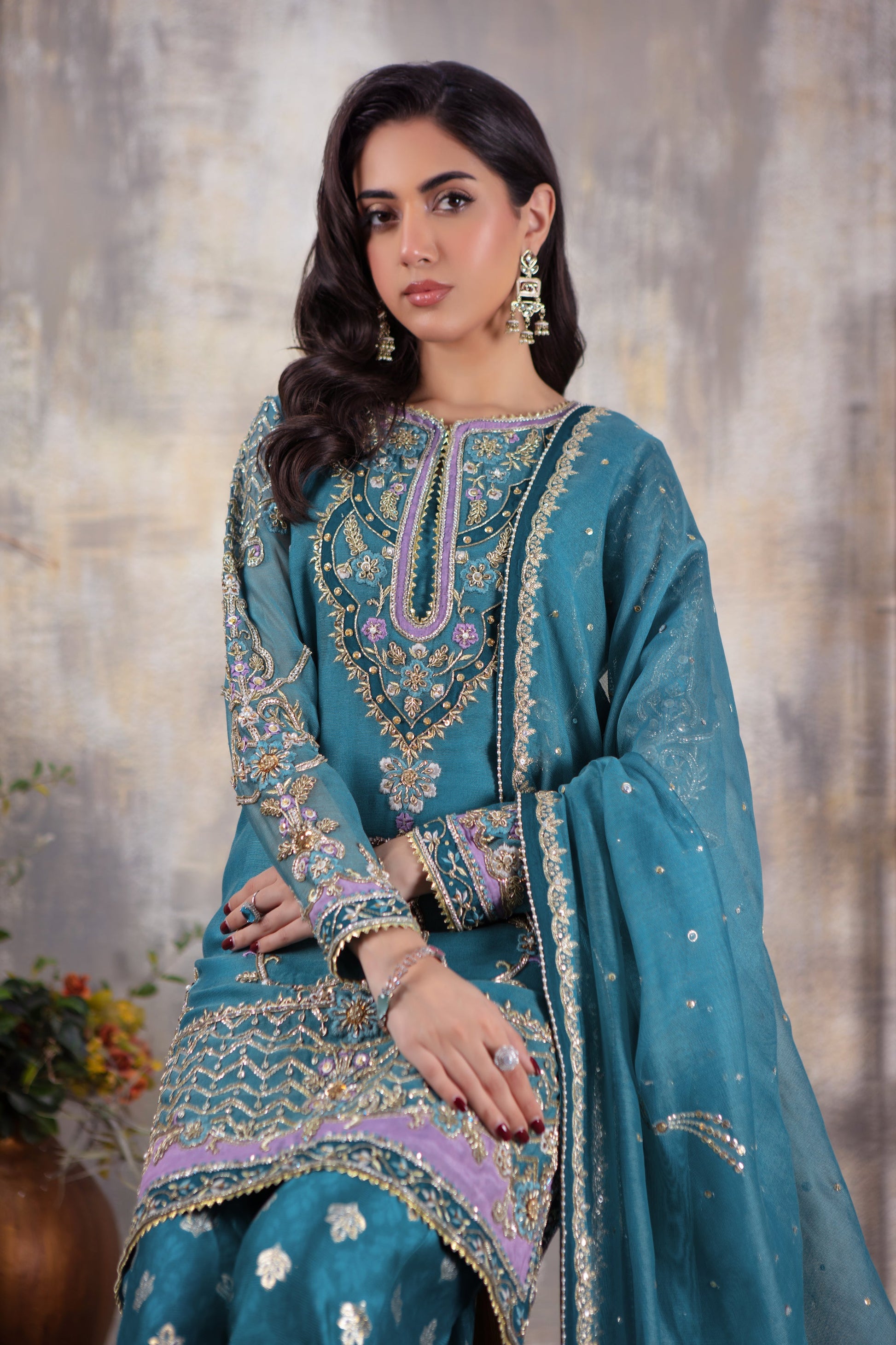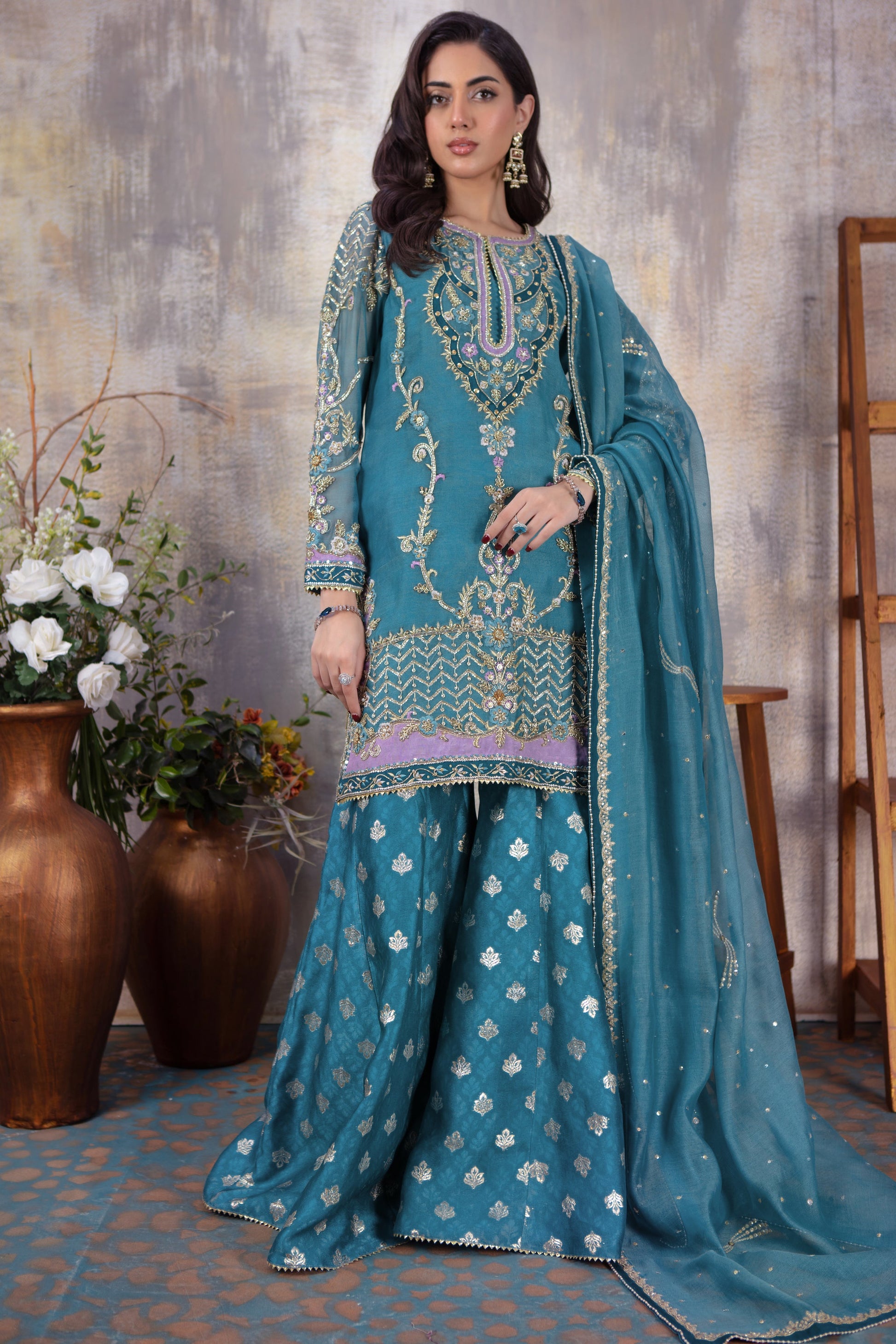 A chic short shirt adorned with gold zardozi and intricate applique work, exuding refined elegance. Paired with panelled Dhaka pants and a hand-embellished dupatta, it creates a timeless, regal ensemble.