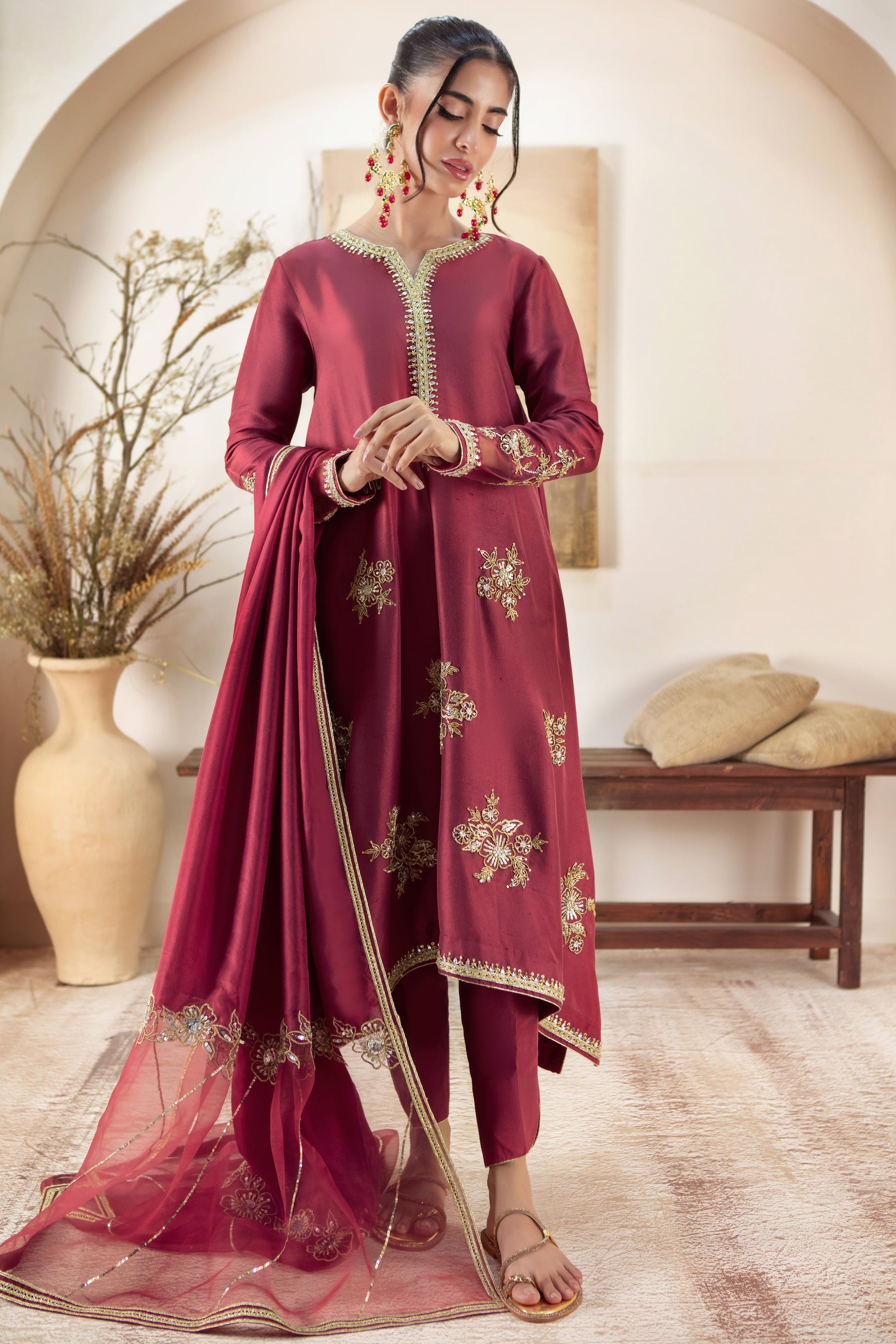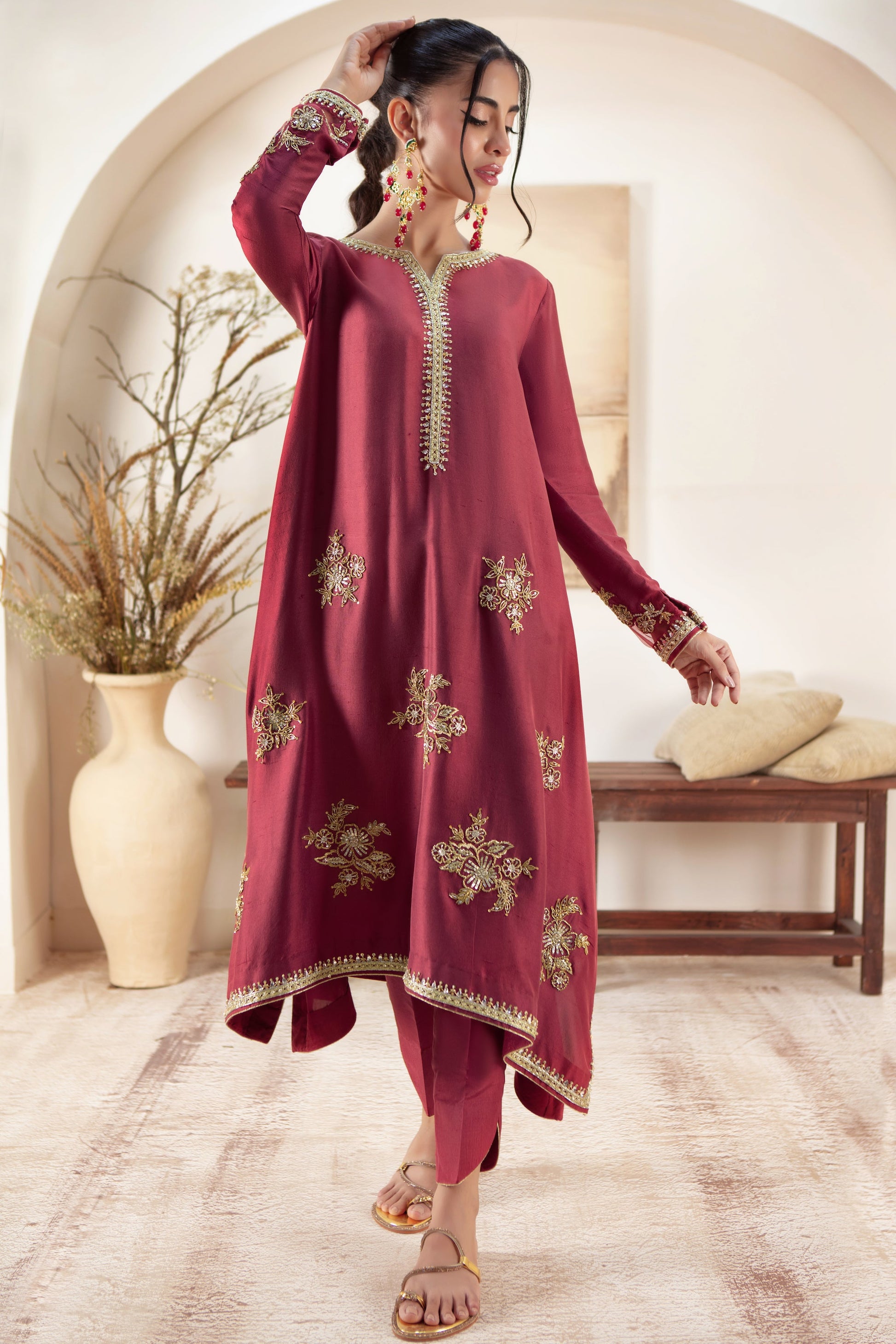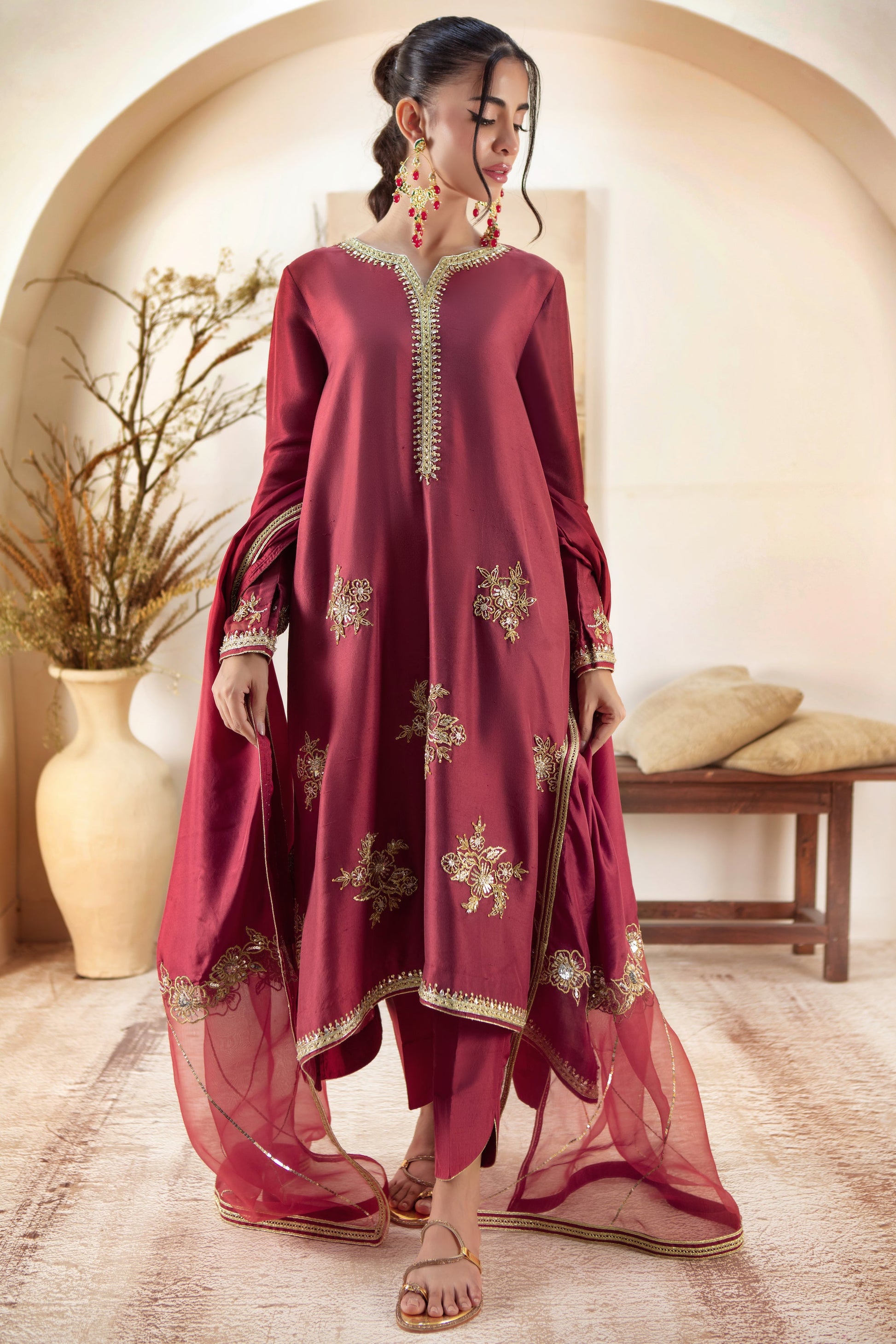 Cut from Pure Raw silk, this box-cut relaxed fit silhouette combines comfort with sophistication. Adorned with delicate zardozi floral motifs on the hem, it adds a touch of intricate elegance to the minimalist design. The luxurious texture of raw silk & stylized Silk dupatta enhances its timeless appeal making it a versatile piece perfect for both casual and formal occasions.