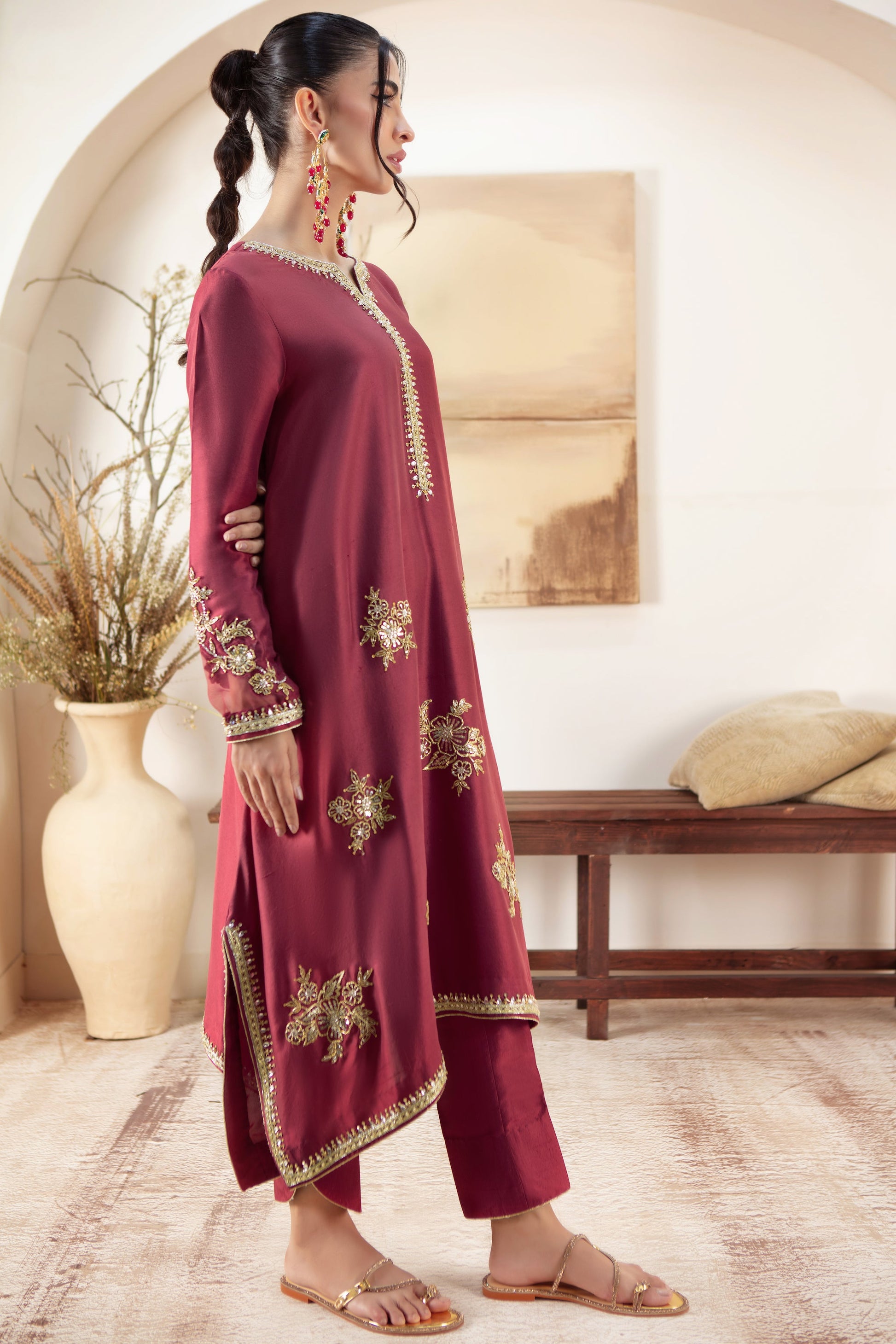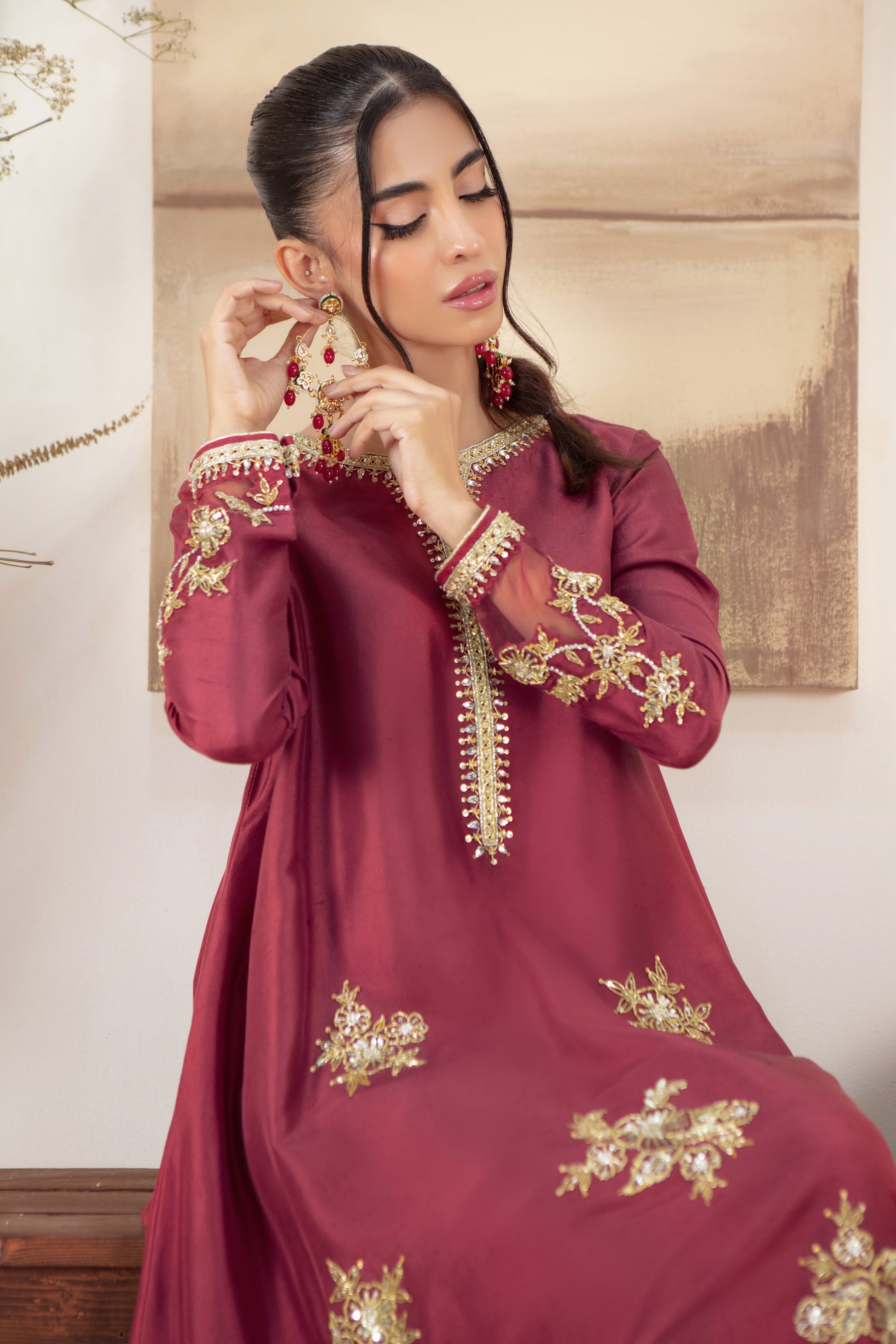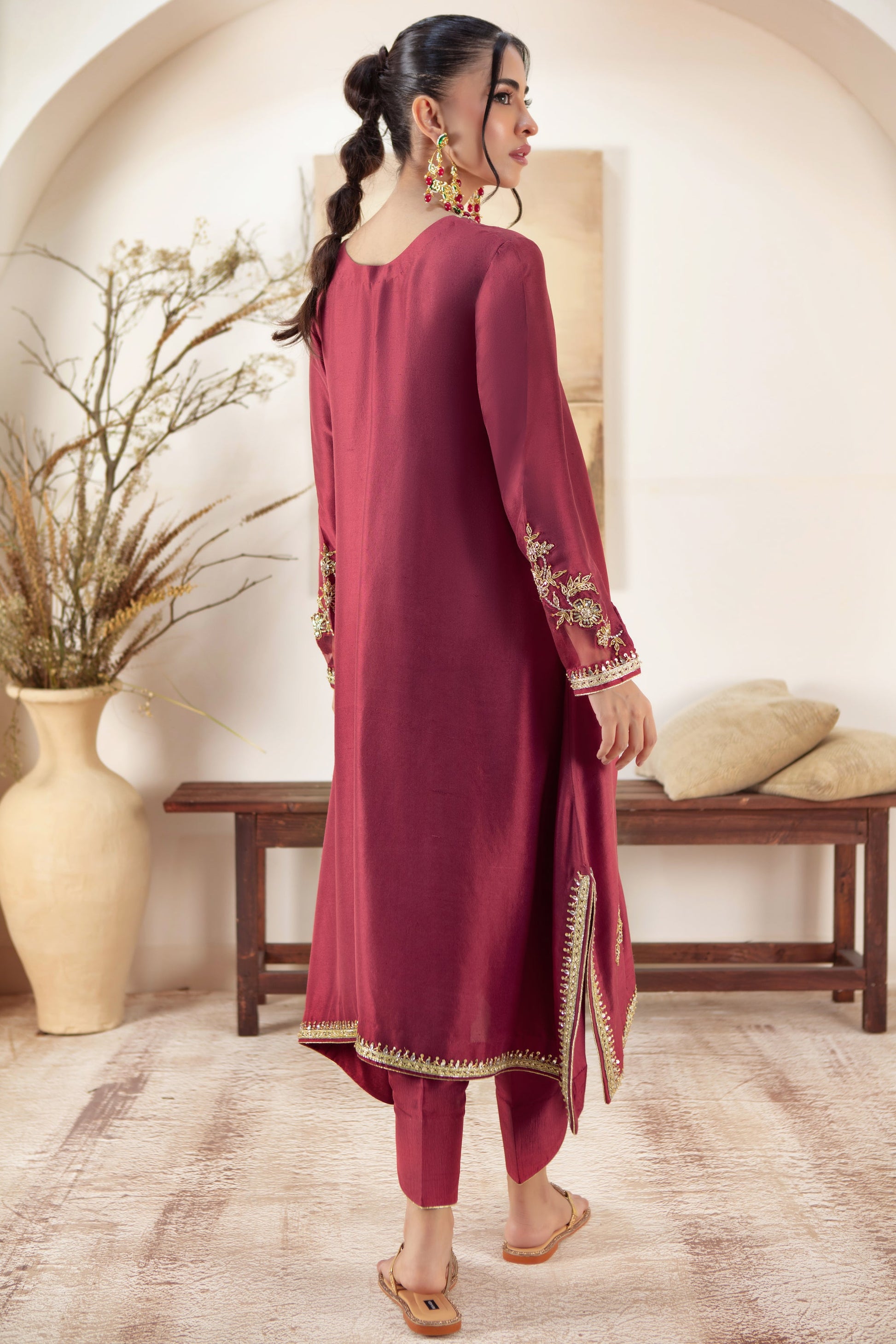 Cut from Pure Raw silk, this box-cut relaxed fit silhouette combines comfort with sophistication. Adorned with delicate zardozi floral motifs on the hem, it adds a touch of intricate elegance to the minimalist design. The luxurious texture of raw silk & stylized Silk dupatta enhances its timeless appeal making it a versatile piece perfect for both casual and formal occasions.