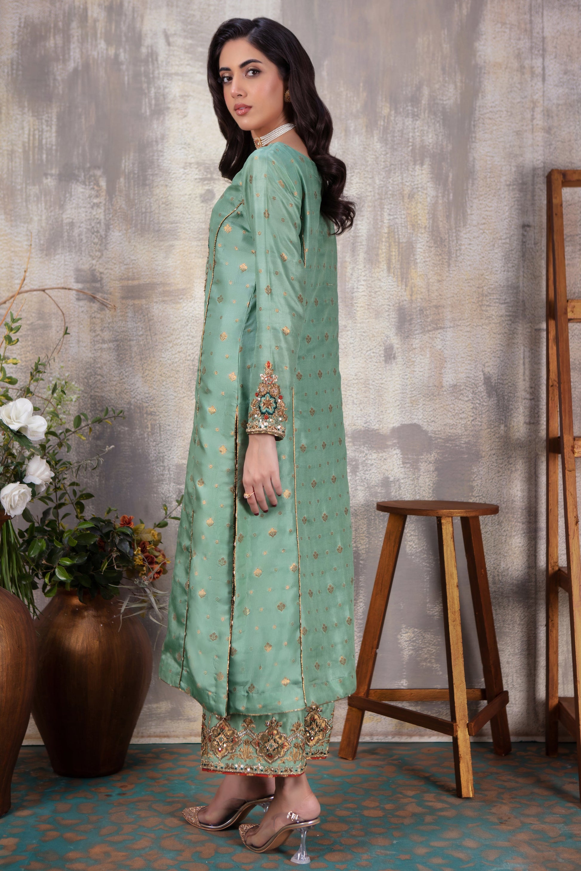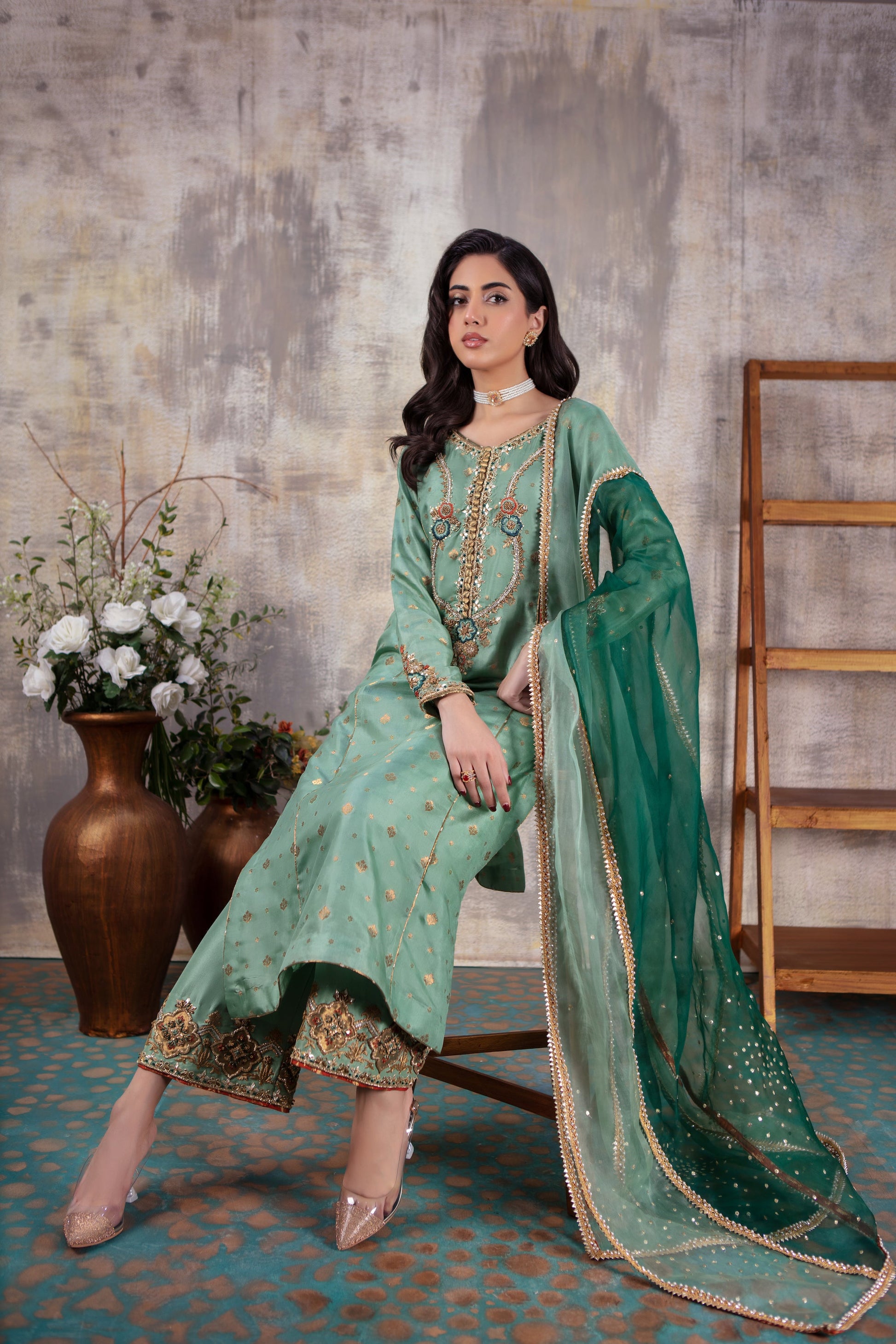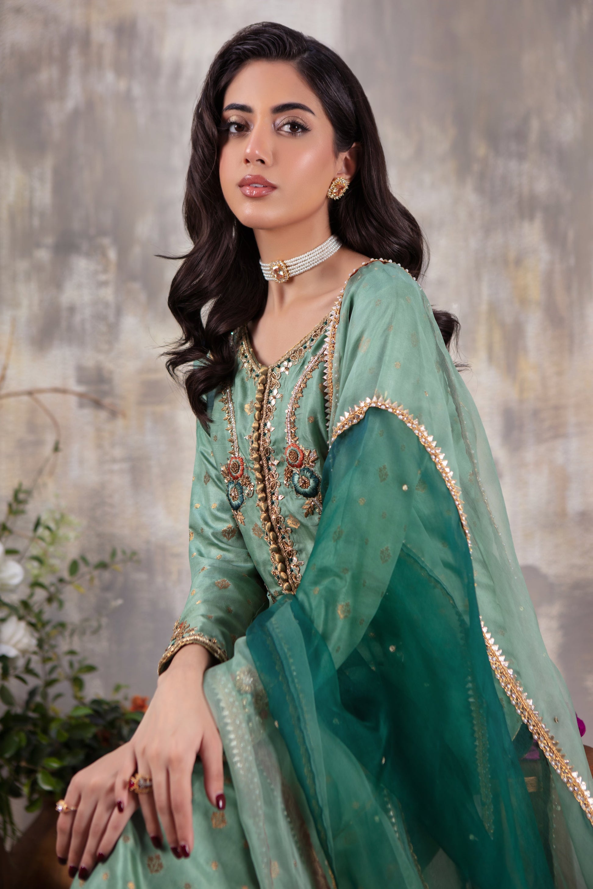 Elevate your wardrobe with this jacquard silk shirt and raw silk izaar , adorned with intricate antique gold zardozi and applique detailing. Paired with a stunning color-blocked dupatta, this ensemble exudes timeless elegance and traditional charm.