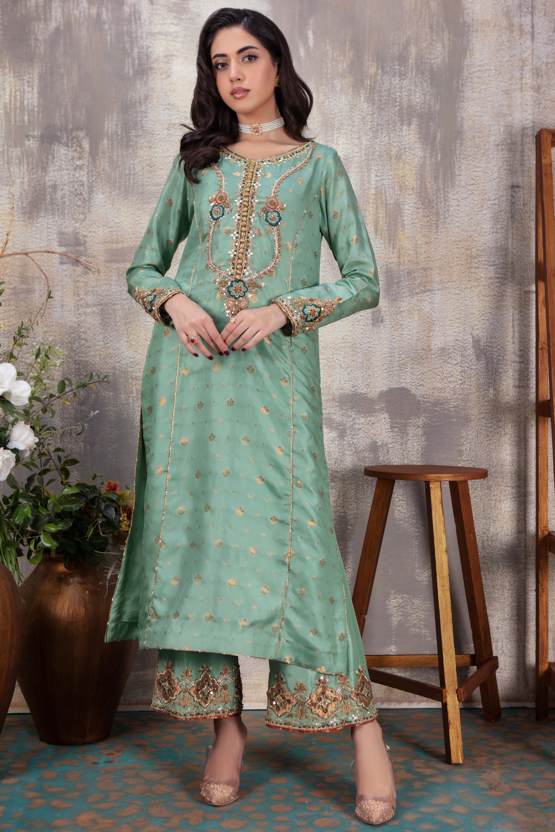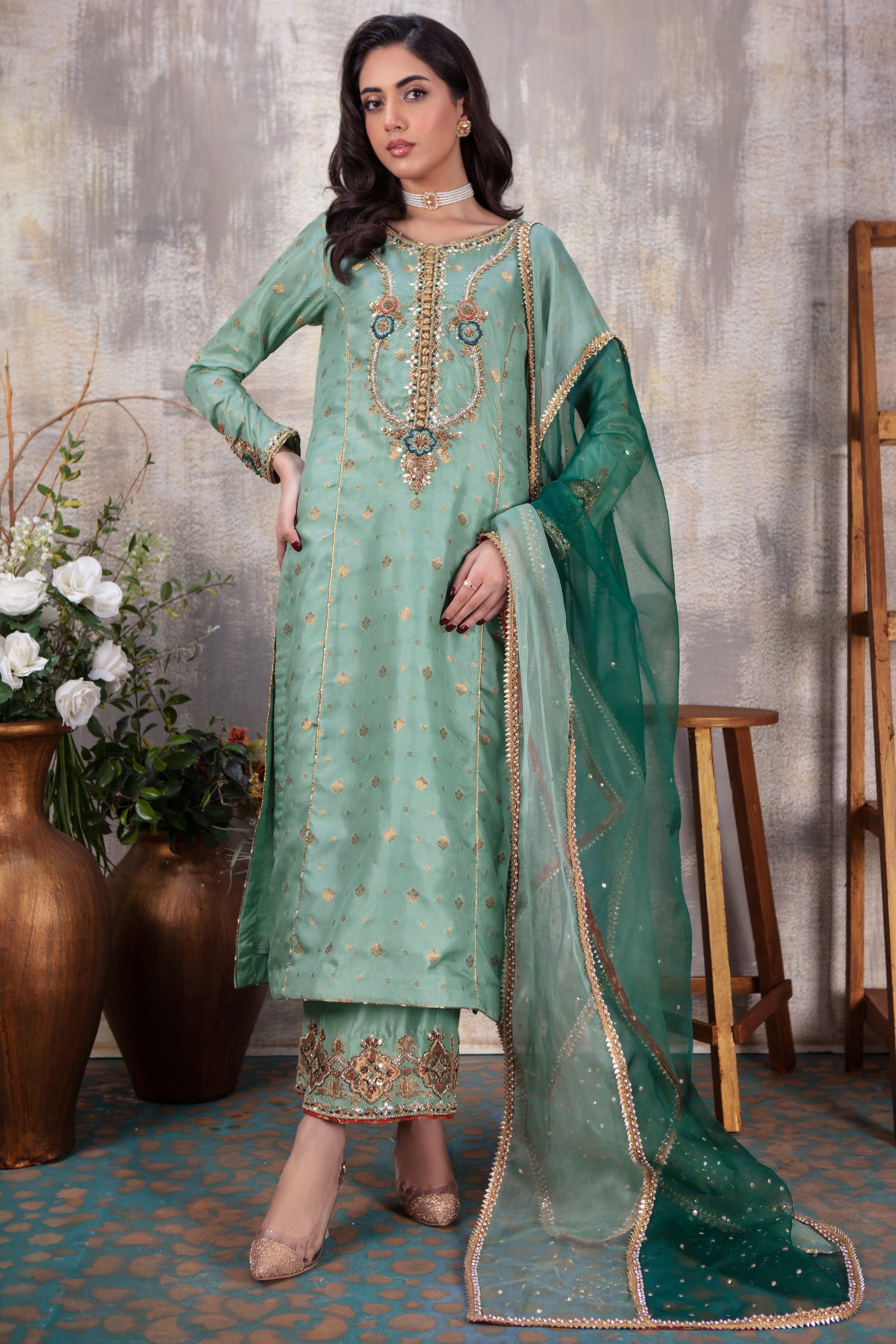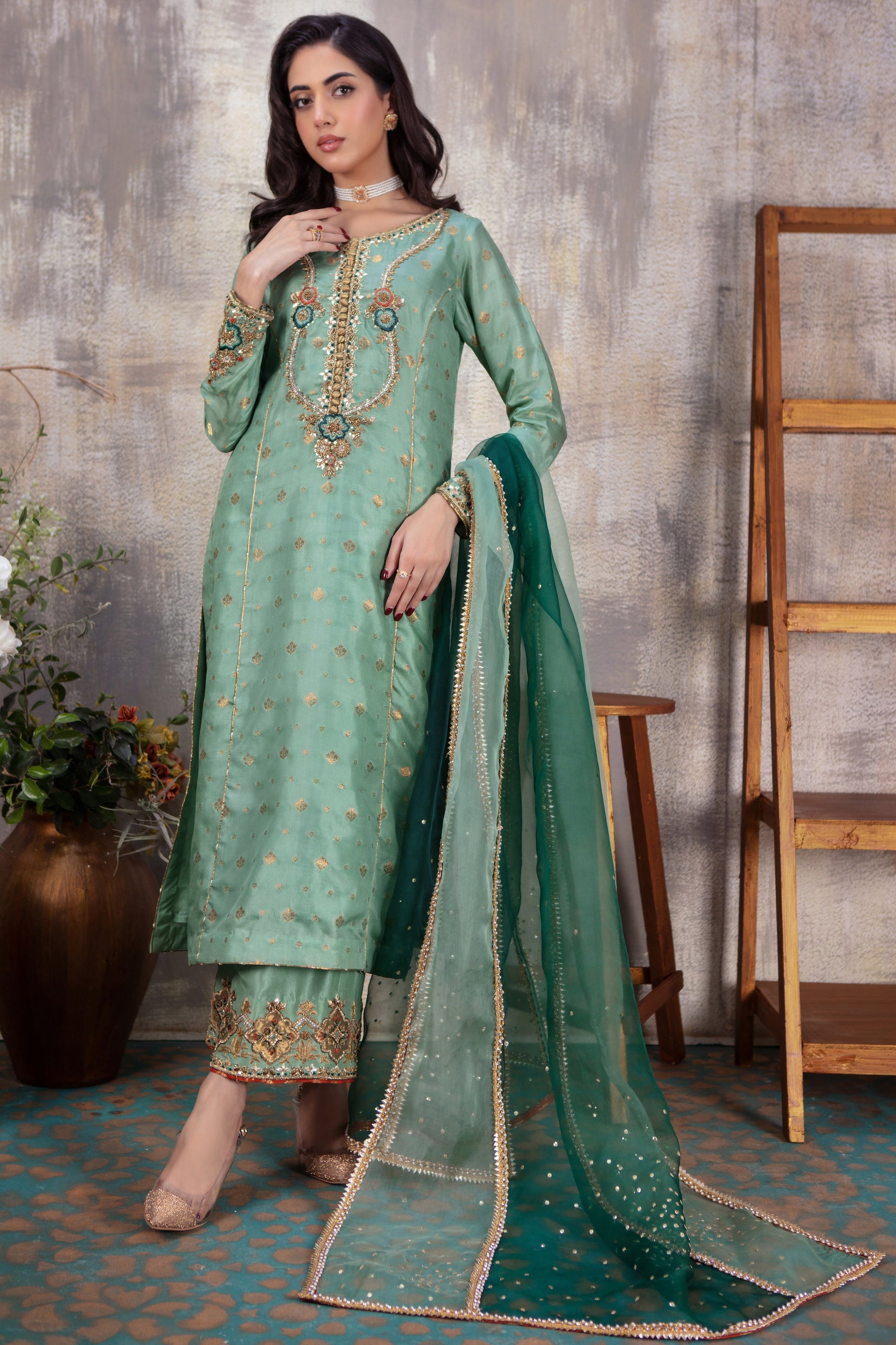 Elevate your wardrobe with this jacquard silk shirt and raw silk izaar , adorned with intricate antique gold zardozi and applique detailing. Paired with a stunning color-blocked dupatta, this ensemble exudes timeless elegance and traditional charm.