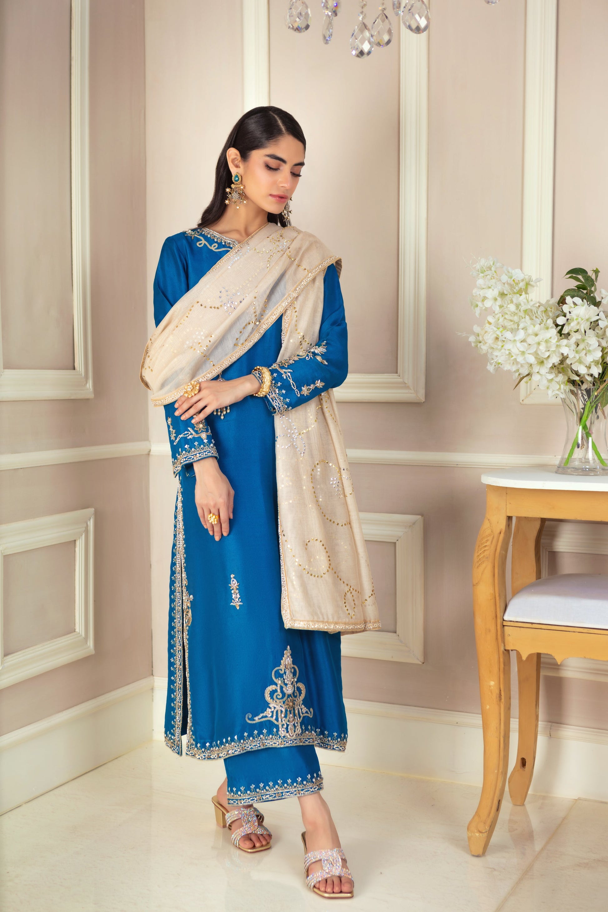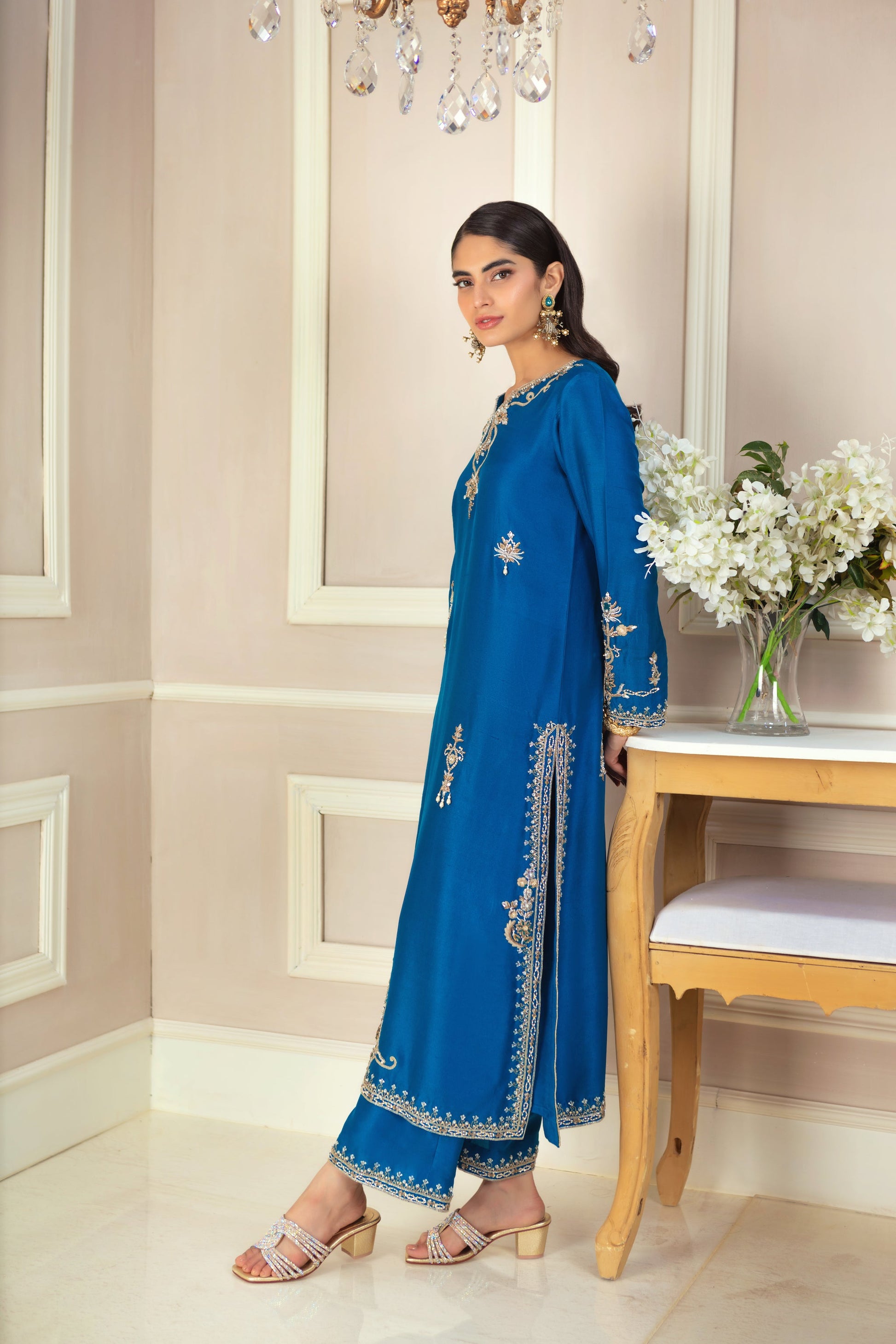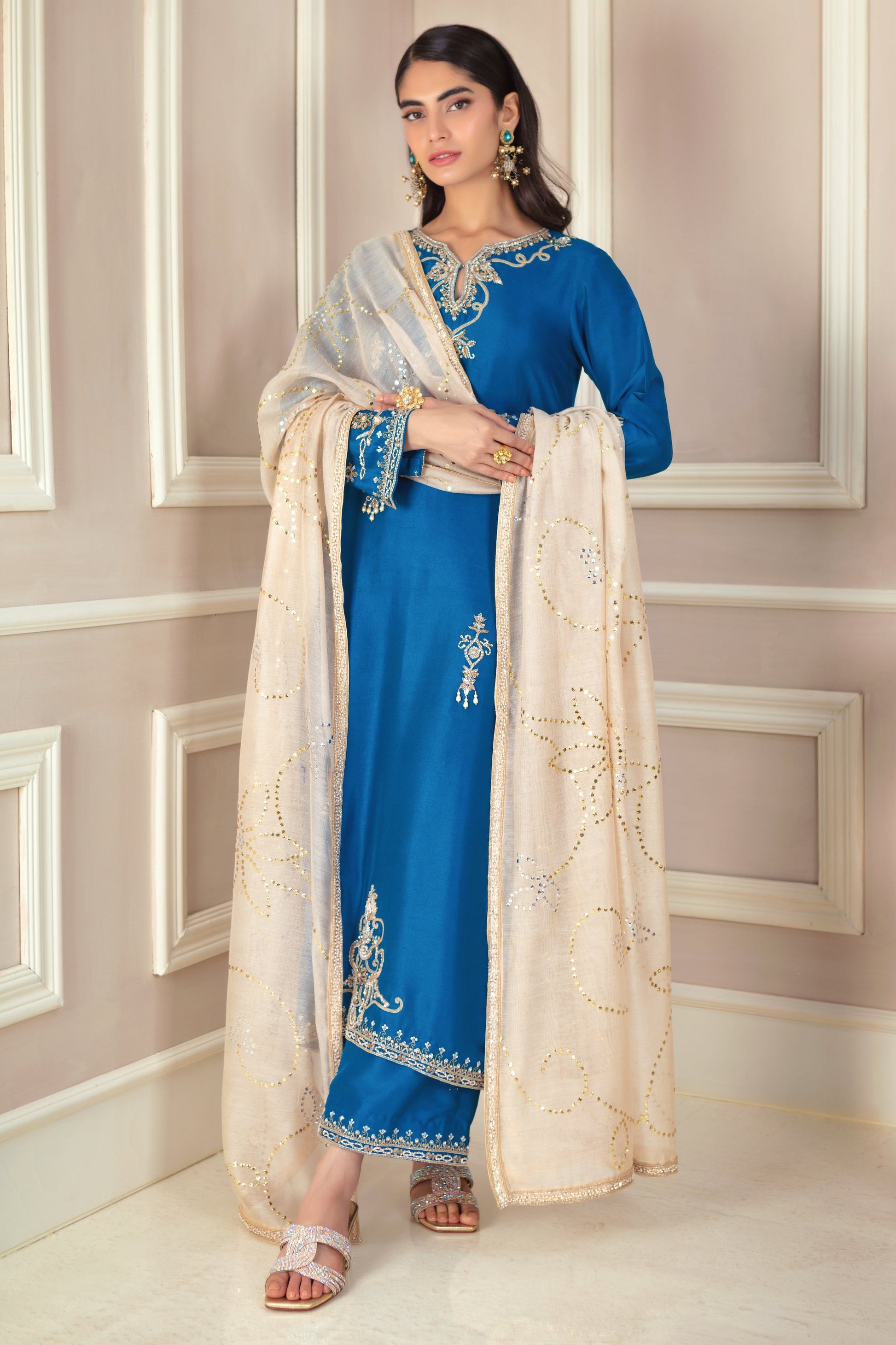 This luxurious teal ensemble features exquisite zardozi ornamental embroidery, creating a rich, textured look. The loose, relaxed silhouette drapes effortlessly over the pure raw silk canvas, offering both comfort and elegance. The striking statement piece is the kamdani dupatta, meticulously hand-embellished with a delicate border, adding a touch of opulence and sophistication to this timeless outfit.