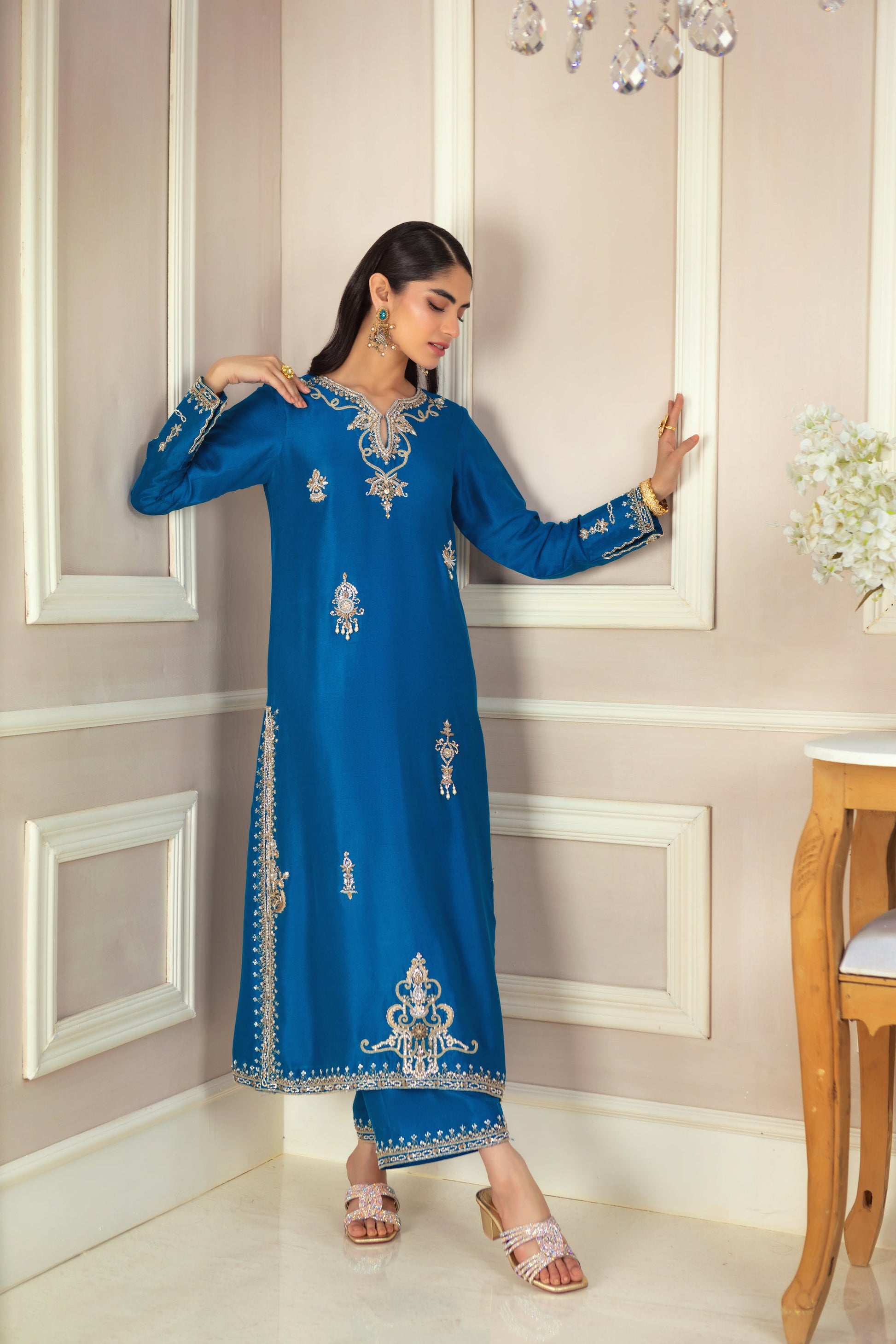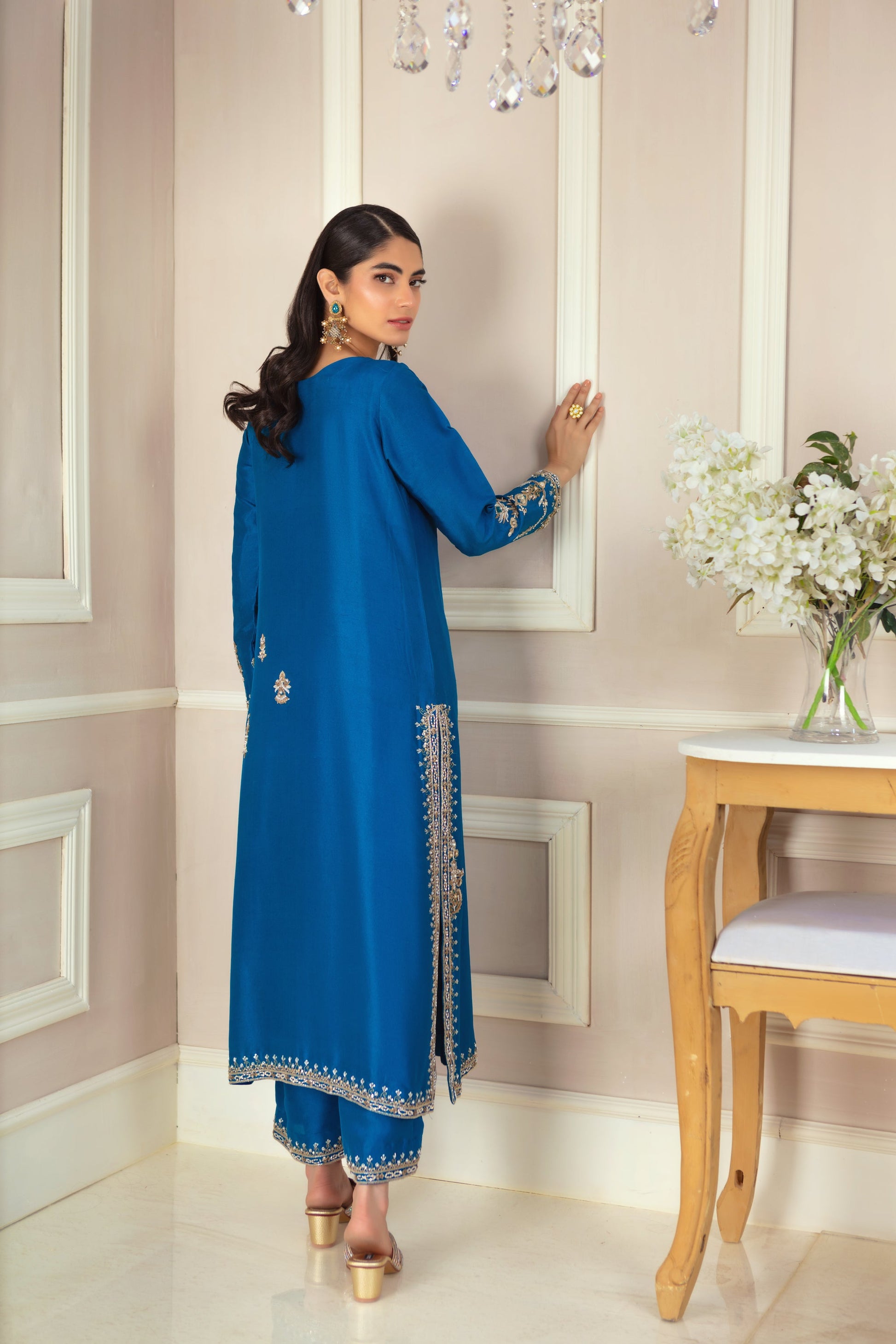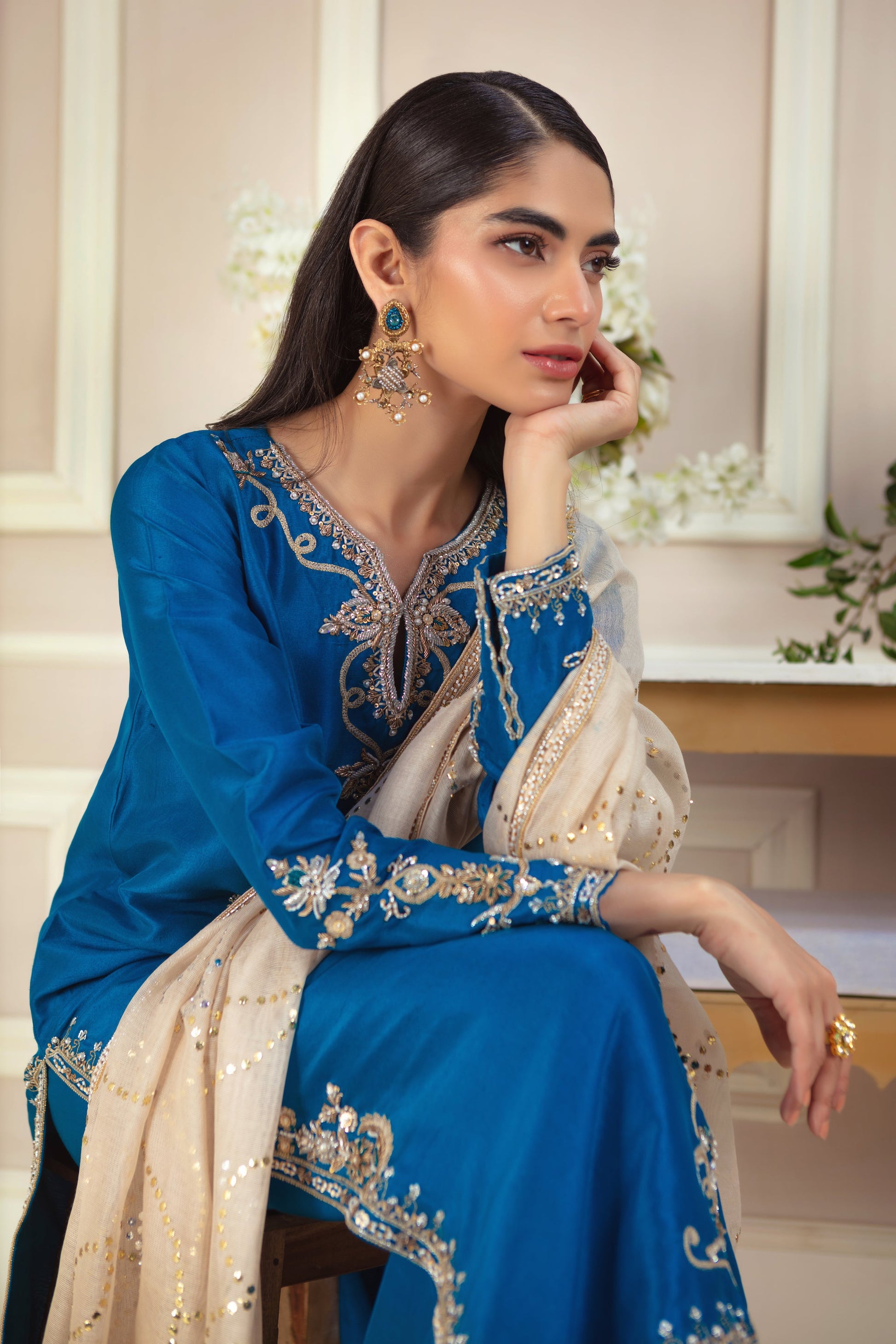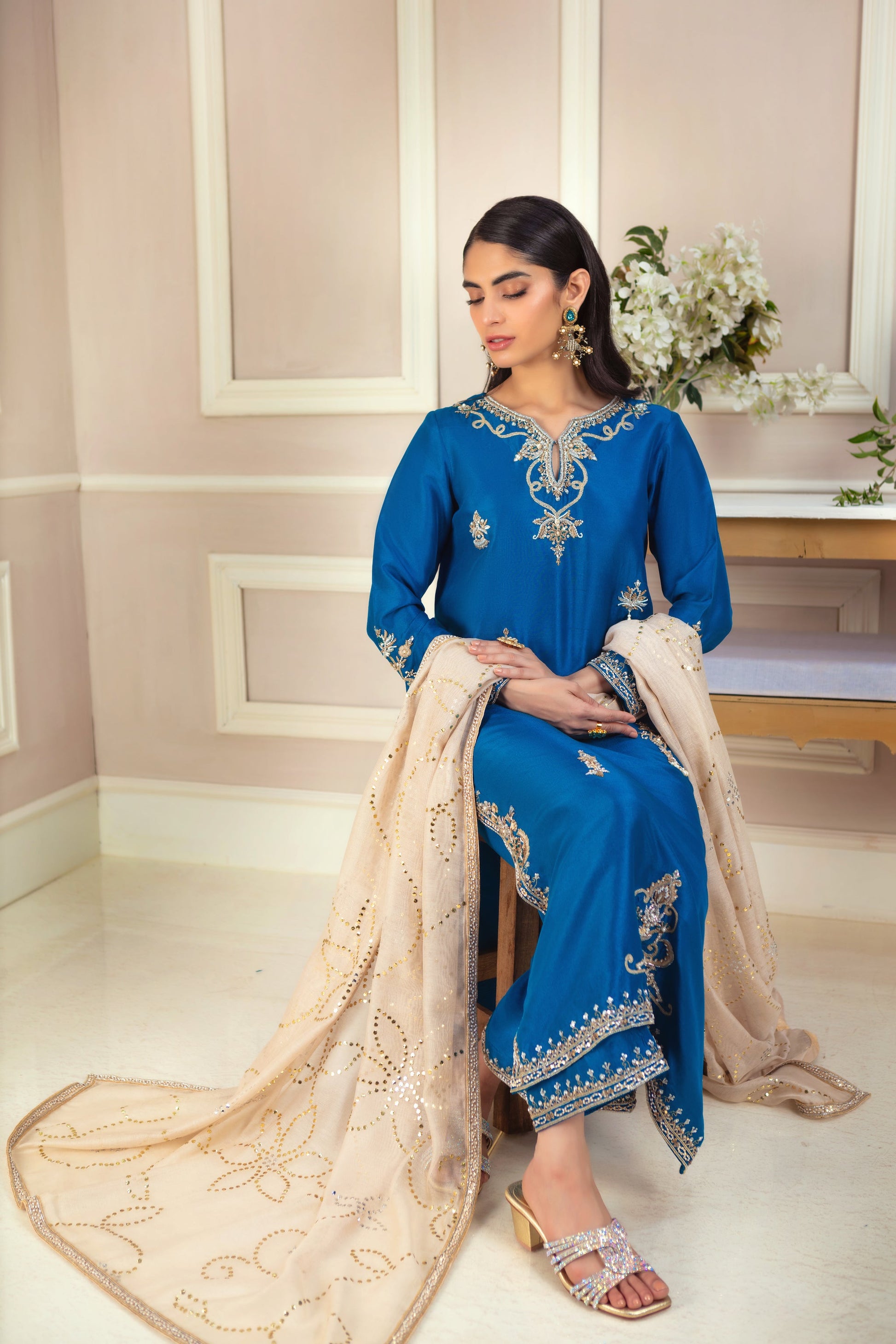 This luxurious teal ensemble features exquisite zardozi ornamental embroidery, creating a rich, textured look. The loose, relaxed silhouette drapes effortlessly over the pure raw silk canvas, offering both comfort and elegance. The striking statement piece is the kamdani dupatta, meticulously hand-embellished with a delicate border, adding a touch of opulence and sophistication to this timeless outfit.