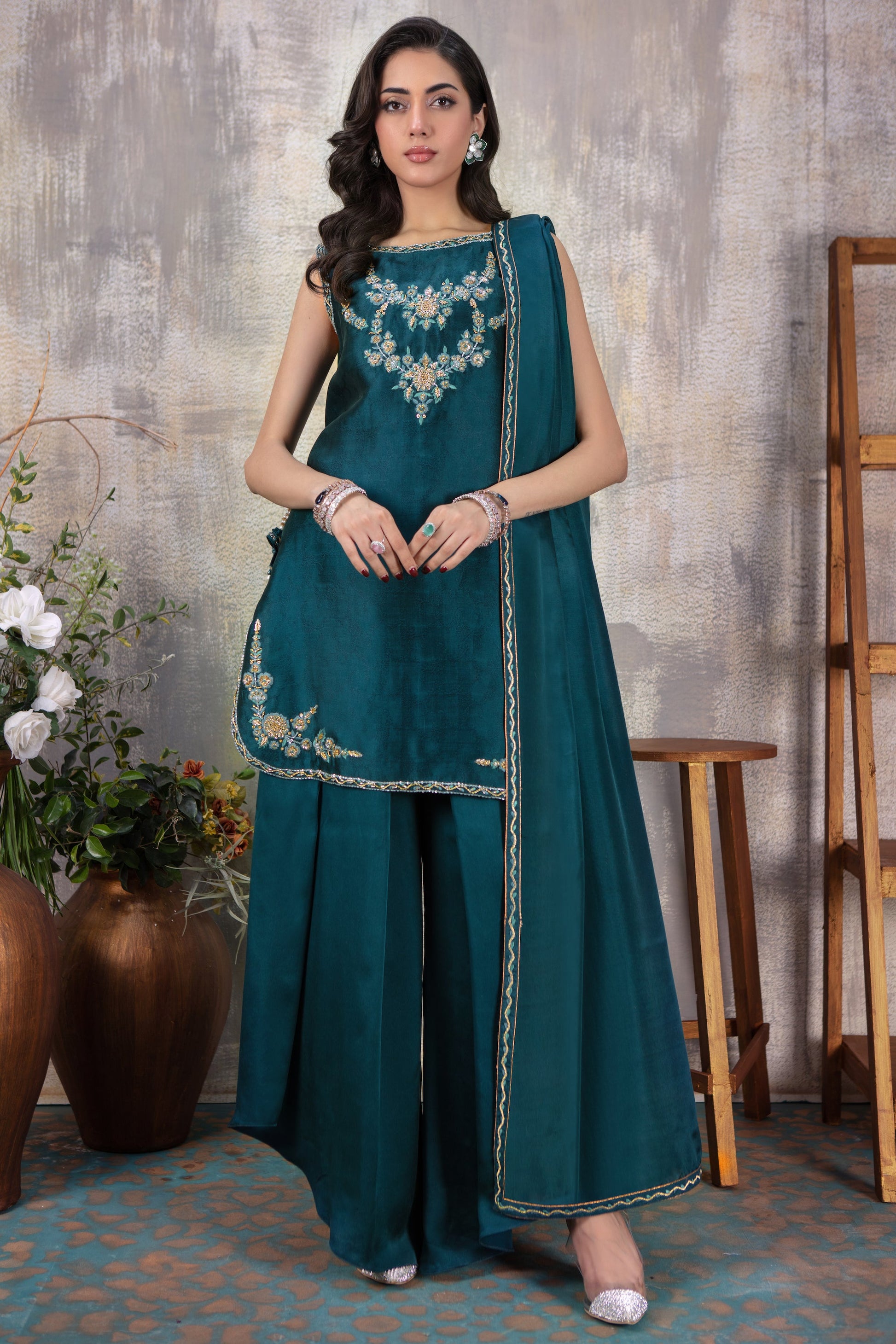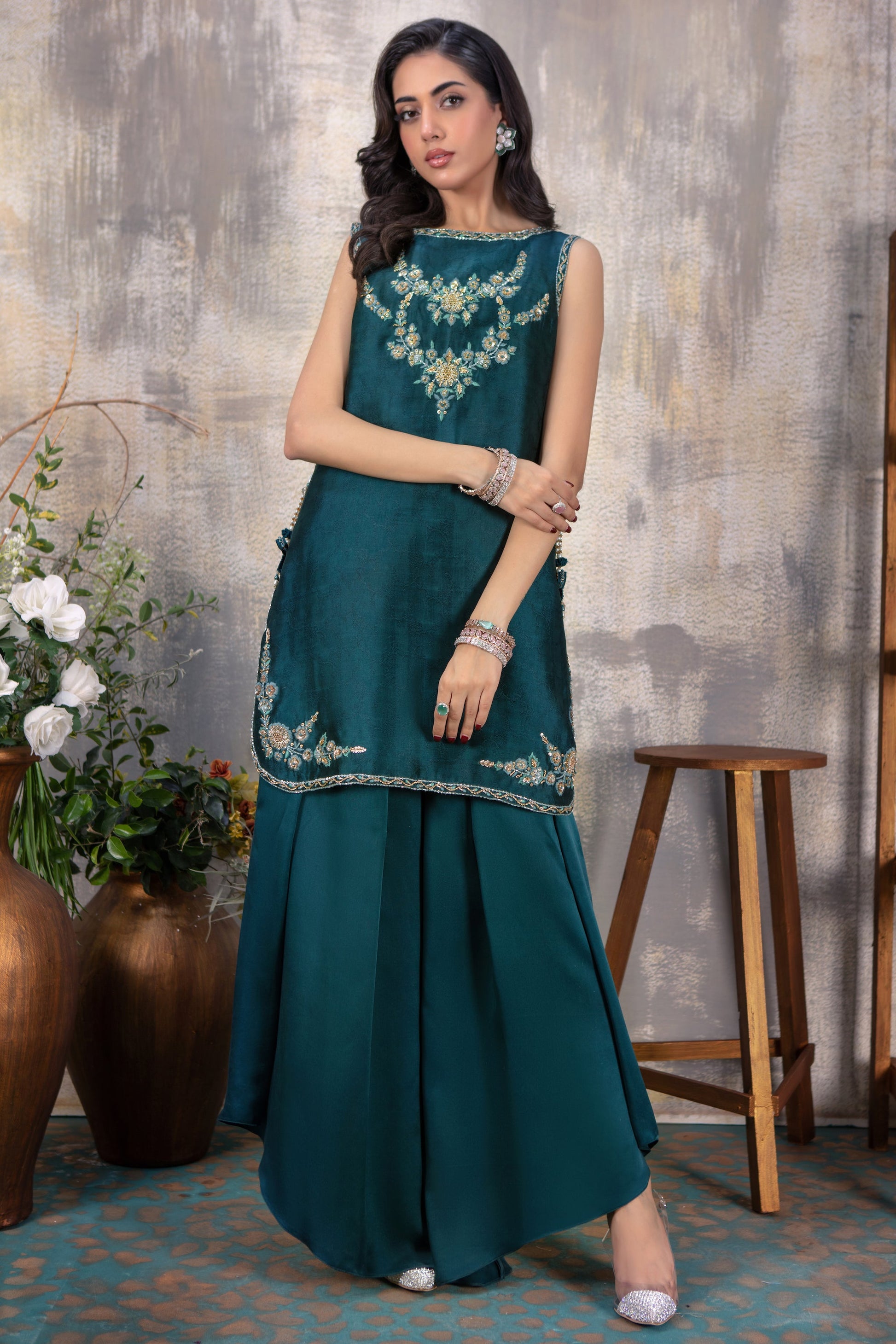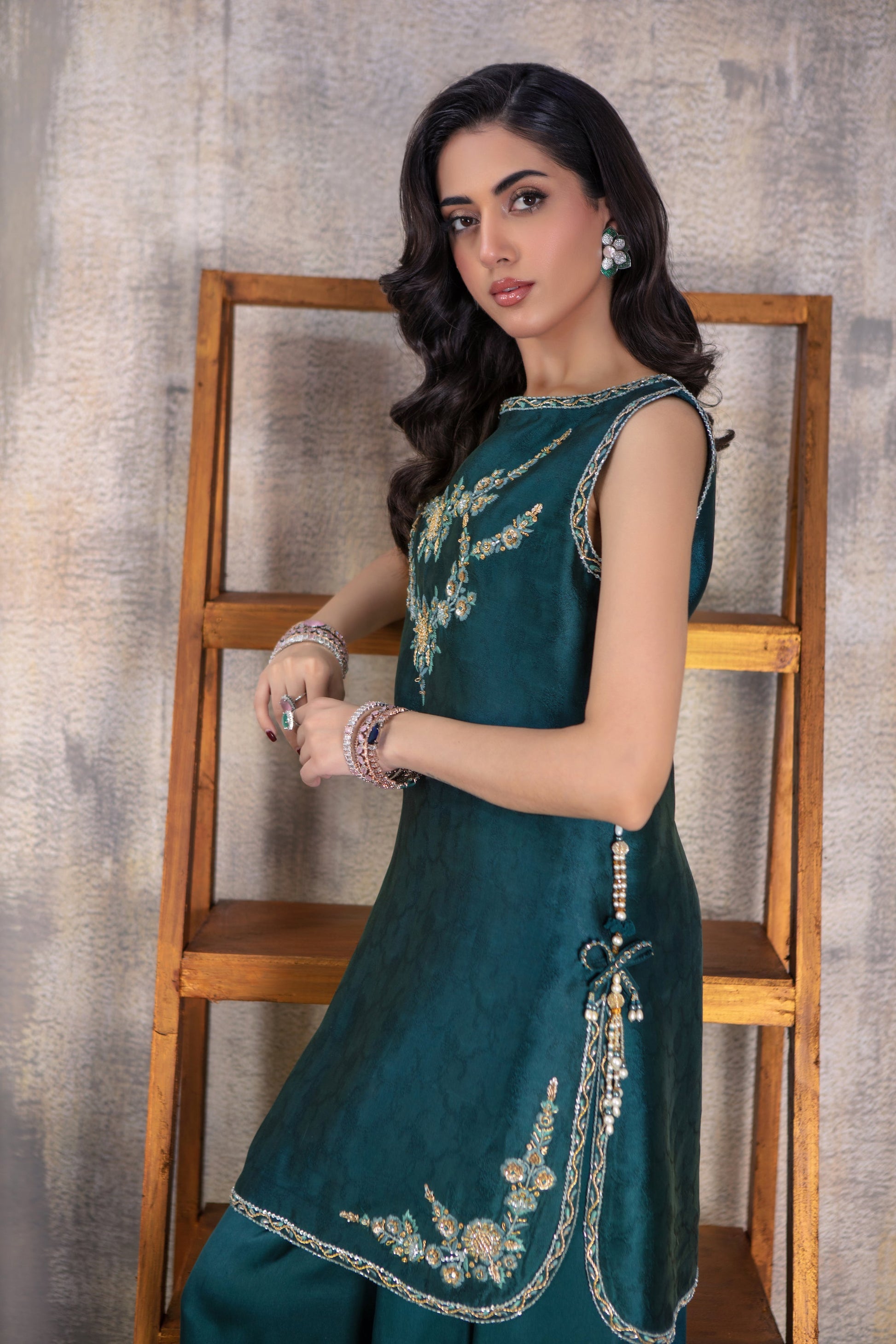 Exude regal modernity in this chic short shirt, adorned with tonal resham and zardozi embroidery, hand crafted stylized hem tassels. Paired with draped flared pants & embroidered silk dupatta, this ensemble effortlessly combines sophistication with dramatic flair.