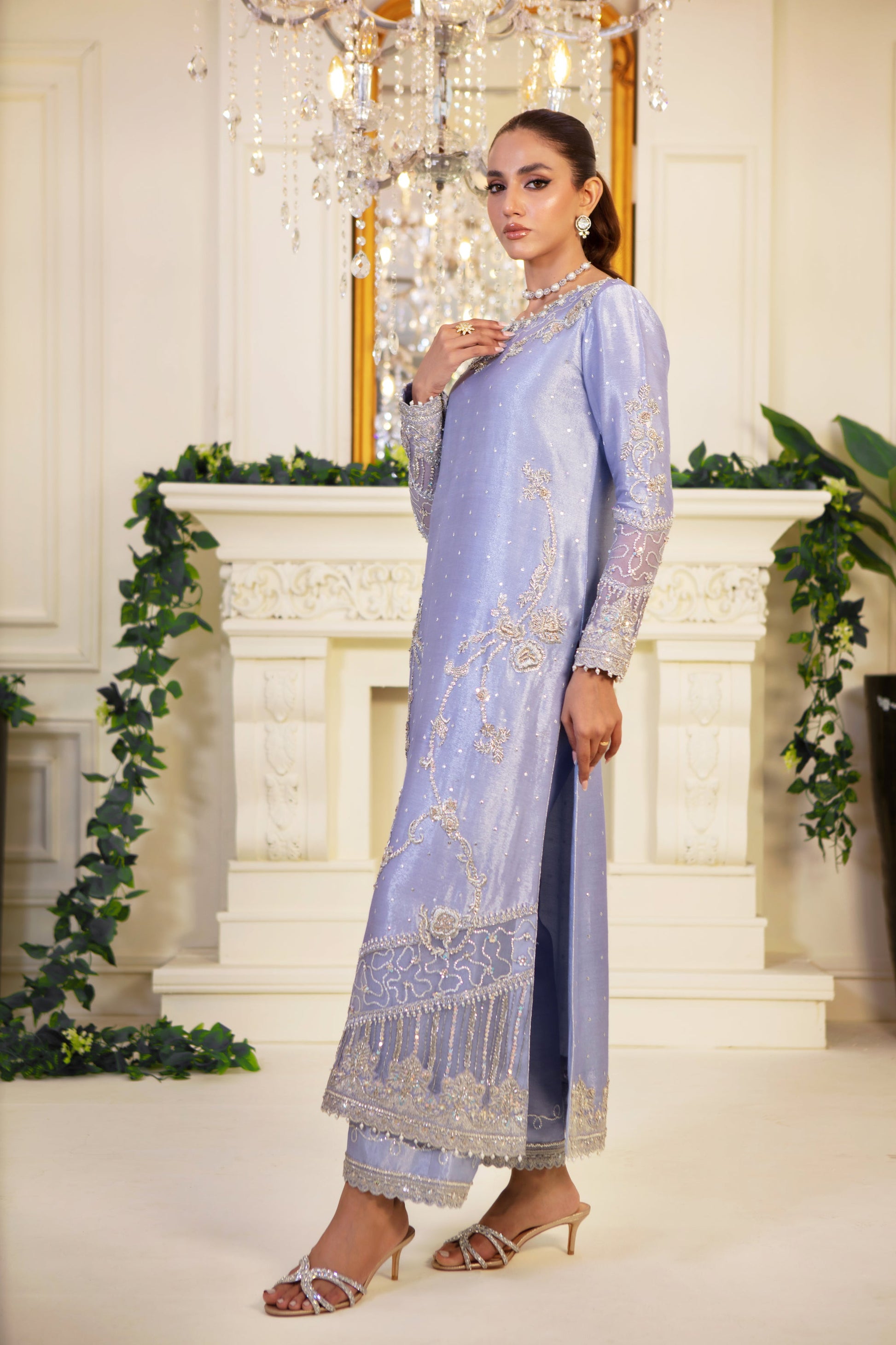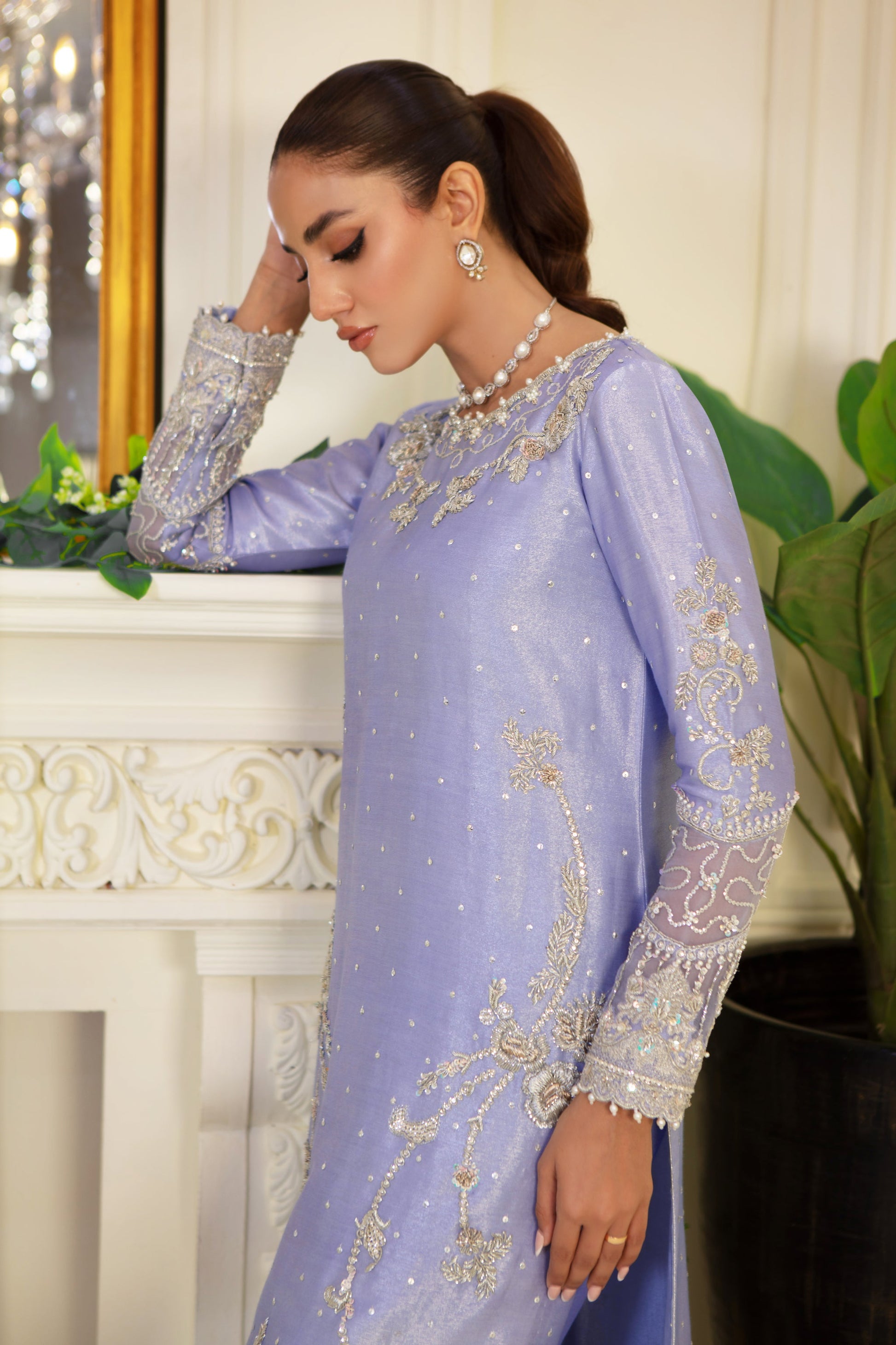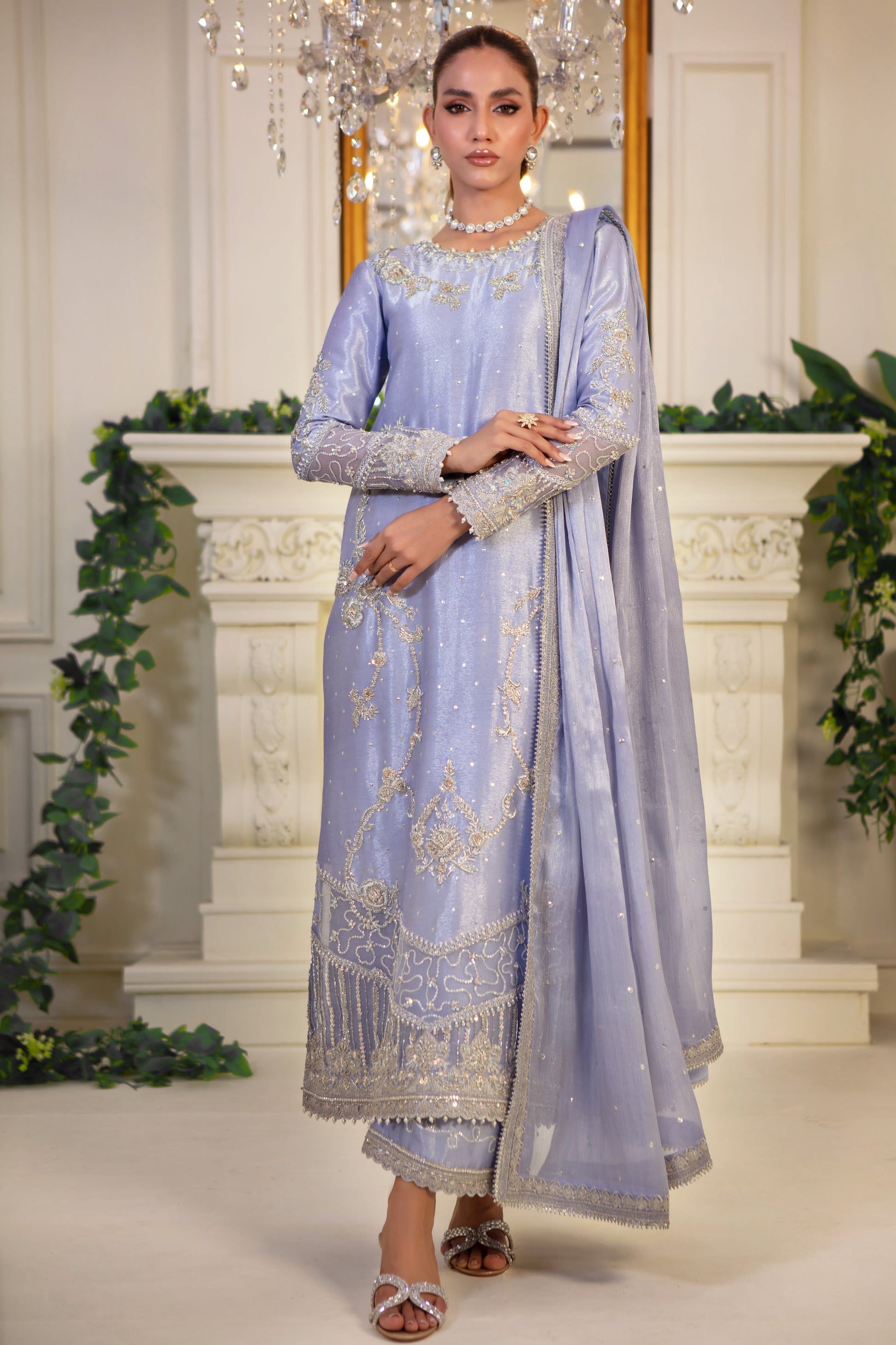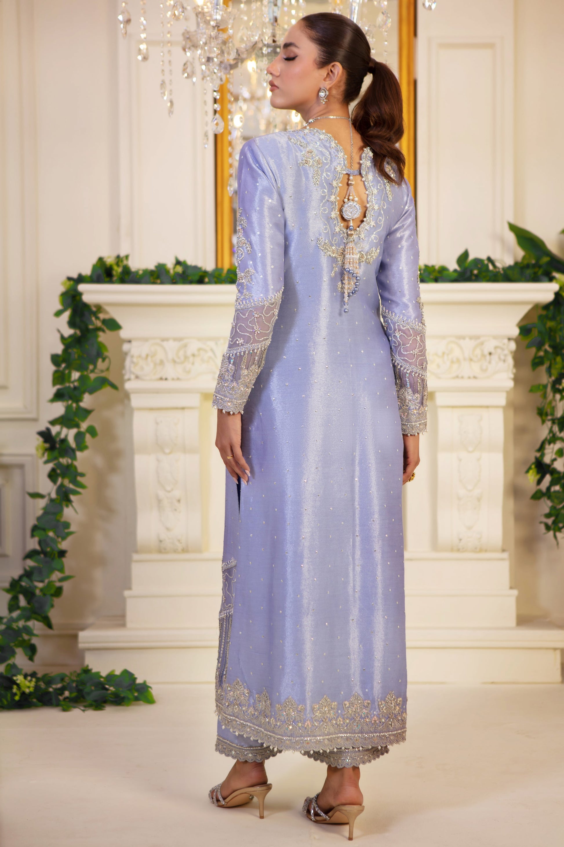 Elevate your style with this exquisite periwinkle zari silk outfit, beautifully embellished with shimmering silver zardozi work that adds a touch of opulence. The ensemble is paired with elegant scalloped Izaar,stunning hand crafted tassel details on back offering a modern twist while ensuring comfort and sophistication. Complemented by a lightweight maysuri embellished dupatta, this look is perfect for special occasions, blending traditional craftsmanship with contemporary design for a stunning statement.