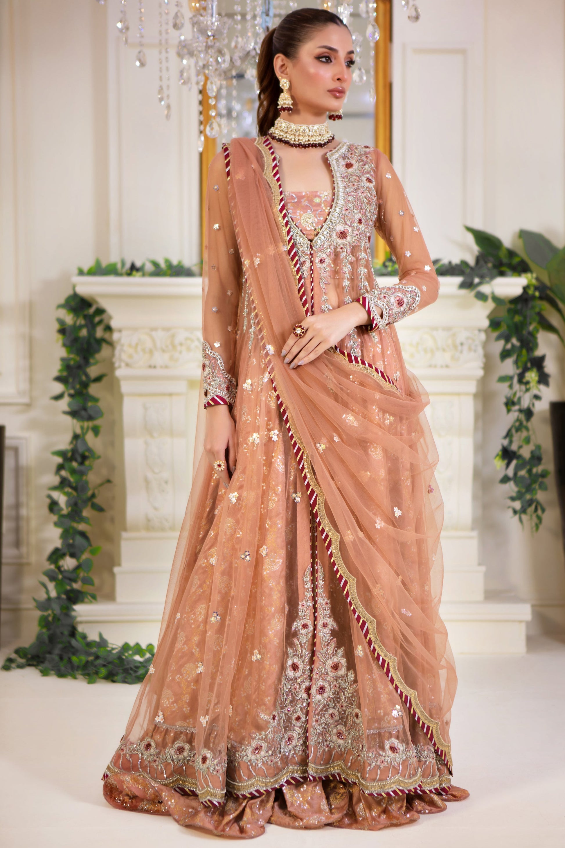 This ethereal Front Open net kalidar jacket exudes elegance, featuring intricate silver and gold zardozi work with delicate hints of plum for a touch of richness. Layered over a hand-embroidered choli, the design flows into a pleated flared lehenga, creating a dramatic and graceful silhouette. Paired with an embellished net dupatta finished with a scalloped border, this ensemble is perfect for making a statement at festive events or weddings, blending tradition with a modern, sophisticated flair.