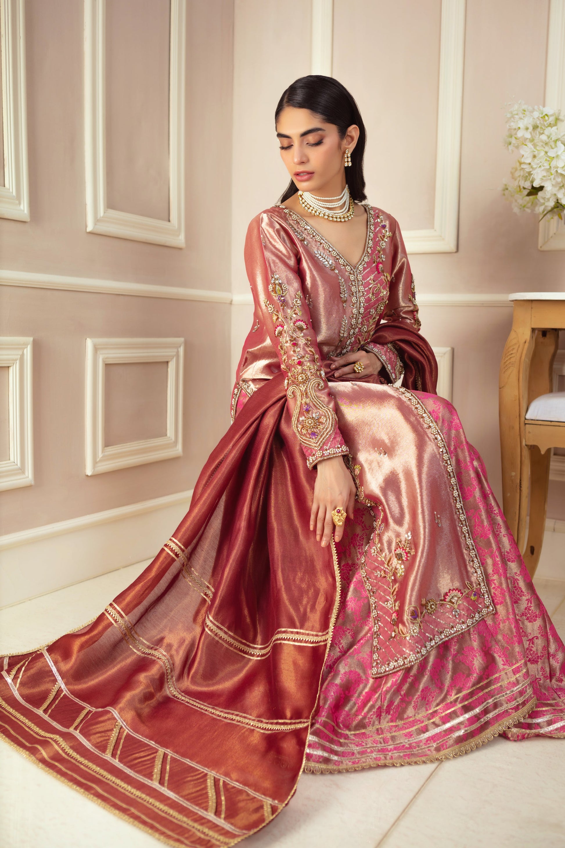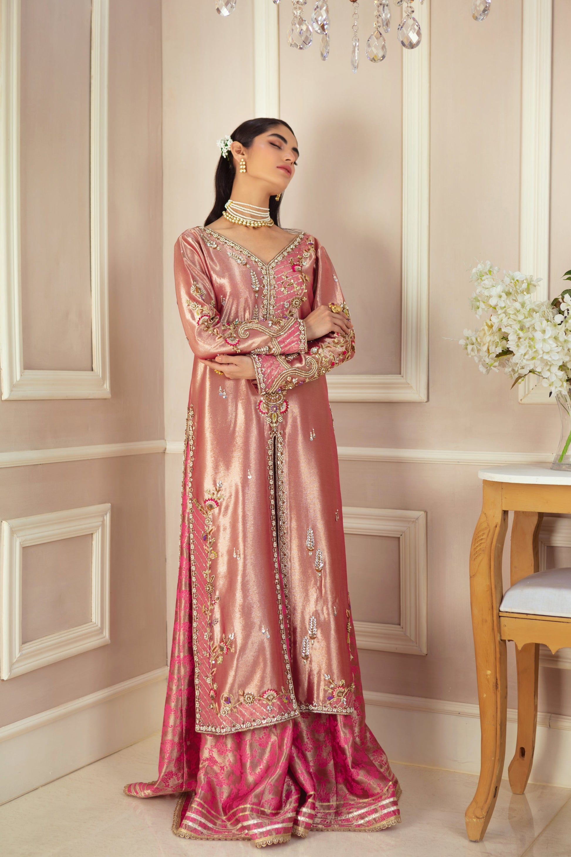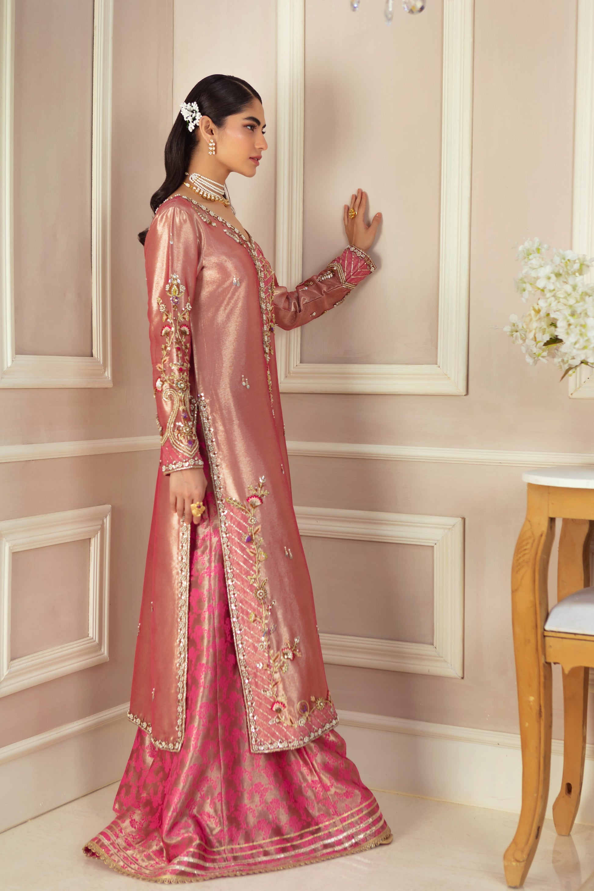 This elegant rose pink lama front-open jacket is a perfect blend of tradition and contemporary style. Adorned with intricate antique gold and silver zardozi floral embroidery, it showcases delicate pops of vibrant colors, adding a lively touch. Paired with a stunning deep pink zari silk dupatta, stylized with gota details, and jacquard lama dhaka pants, this ensemble creates a striking and sophisticated look, ideal for any special occasion.