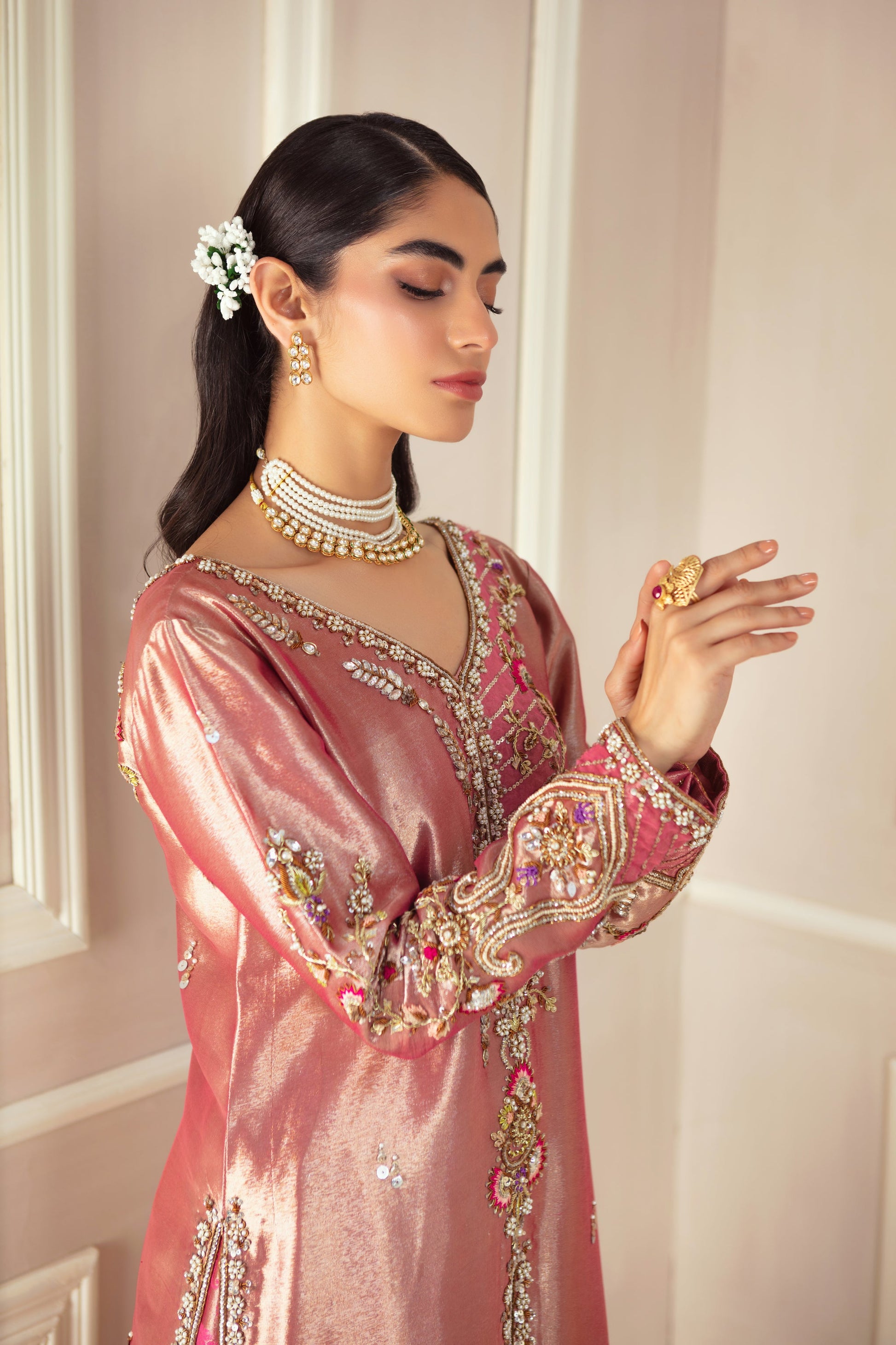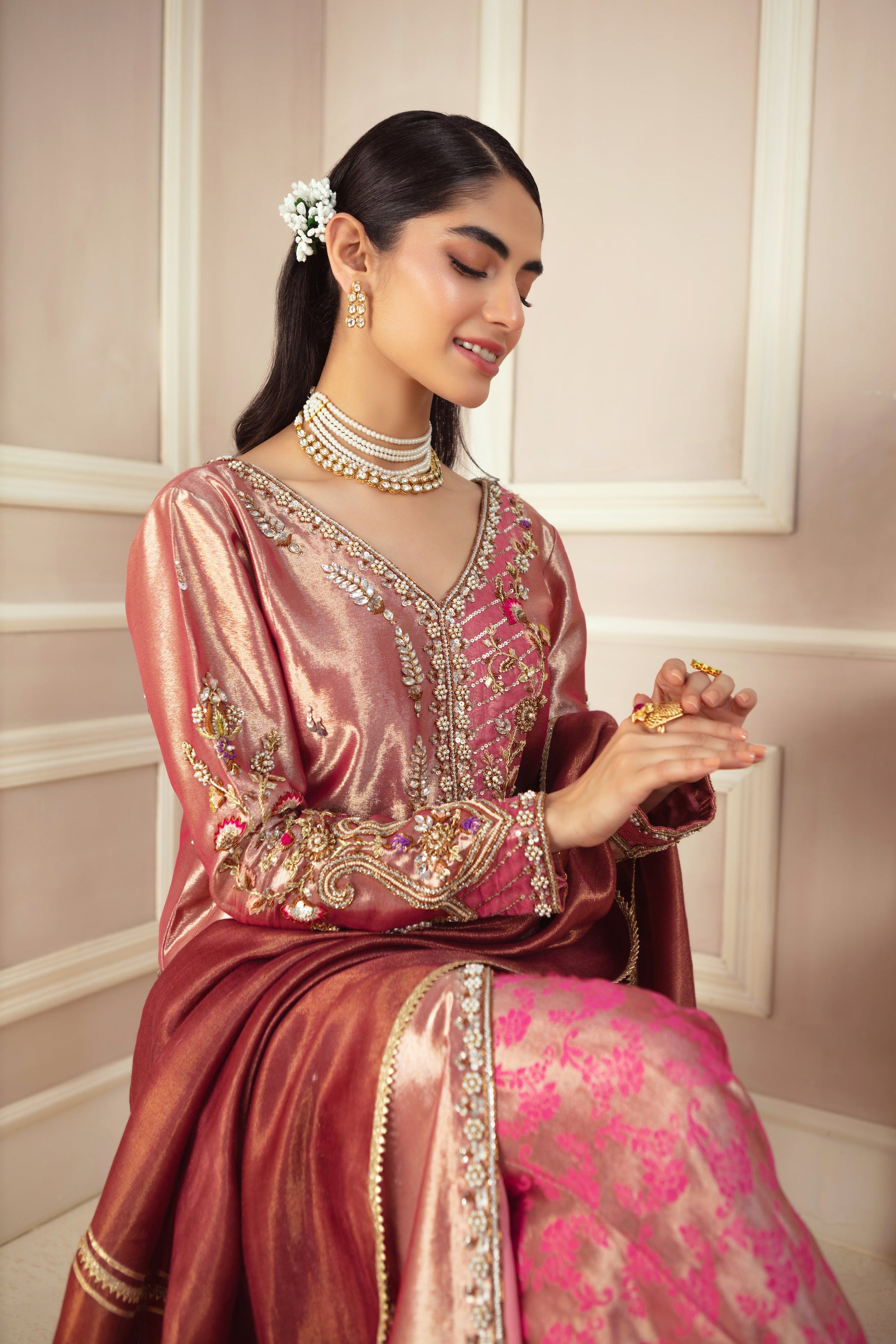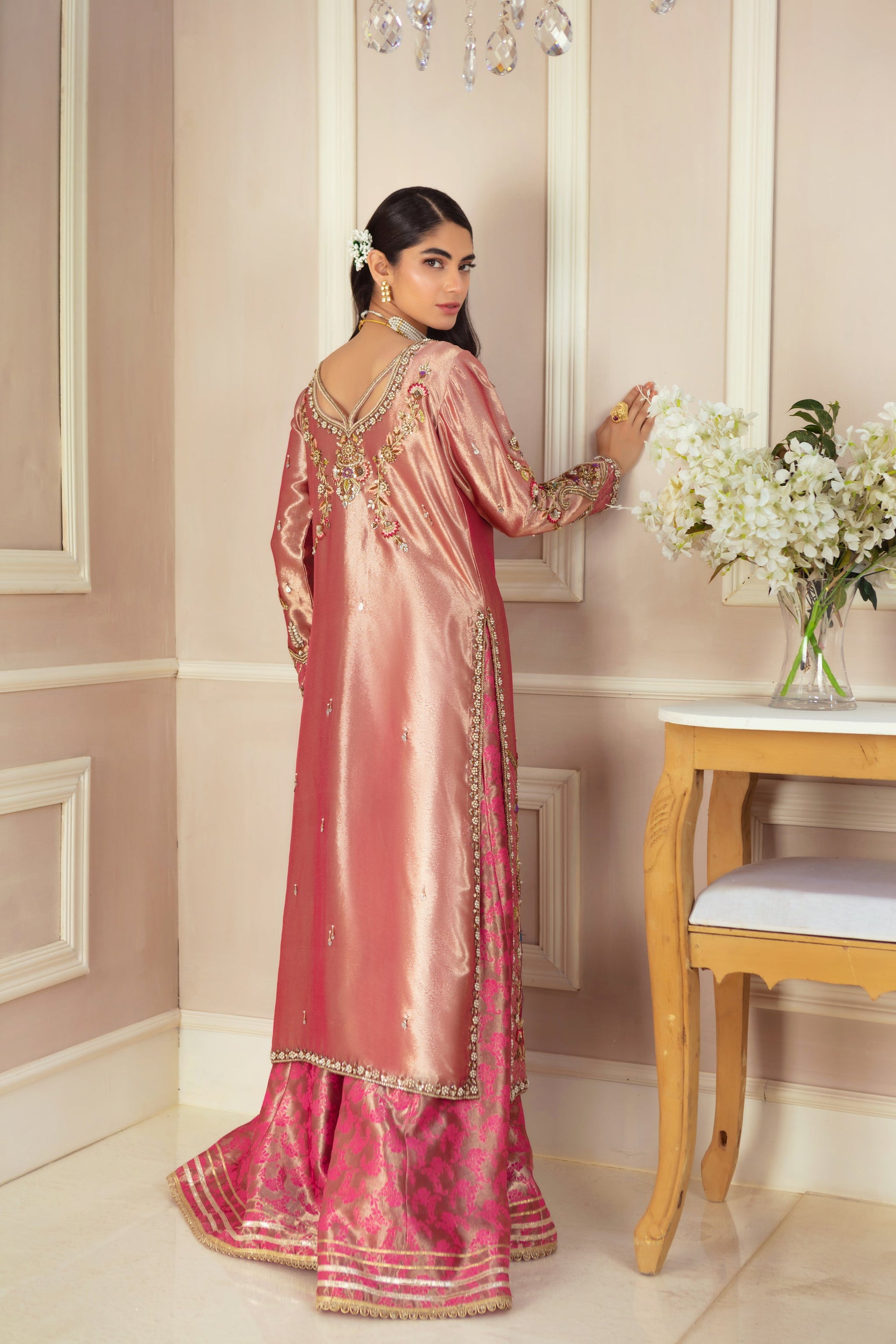 This elegant rose pink lama front-open jacket is a perfect blend of tradition and contemporary style. Adorned with intricate antique gold and silver zardozi floral embroidery, it showcases delicate pops of vibrant colors, adding a lively touch. Paired with a stunning deep pink zari silk dupatta, stylized with gota details, and jacquard lama dhaka pants, this ensemble creates a striking and sophisticated look, ideal for any special occasion.