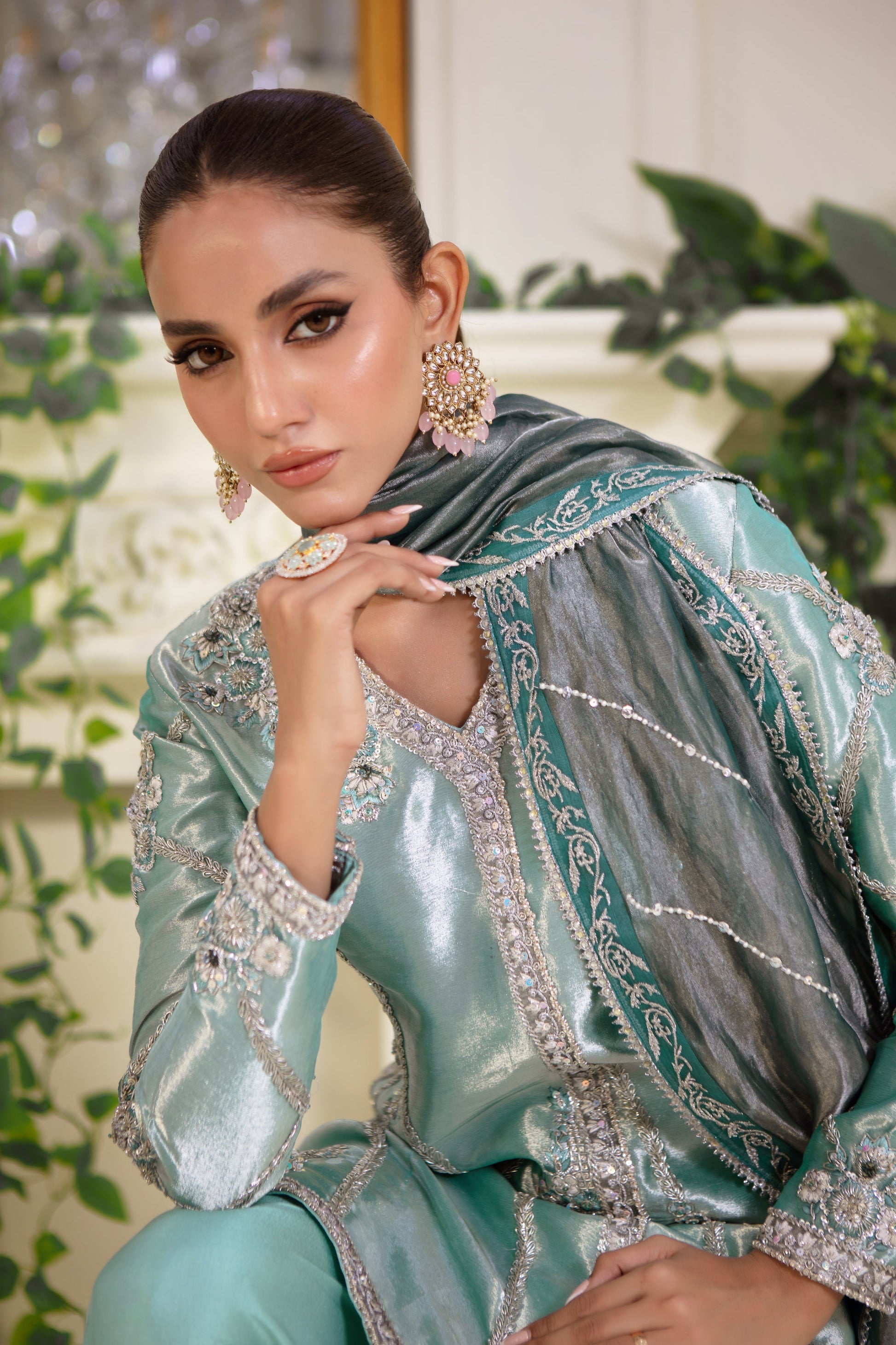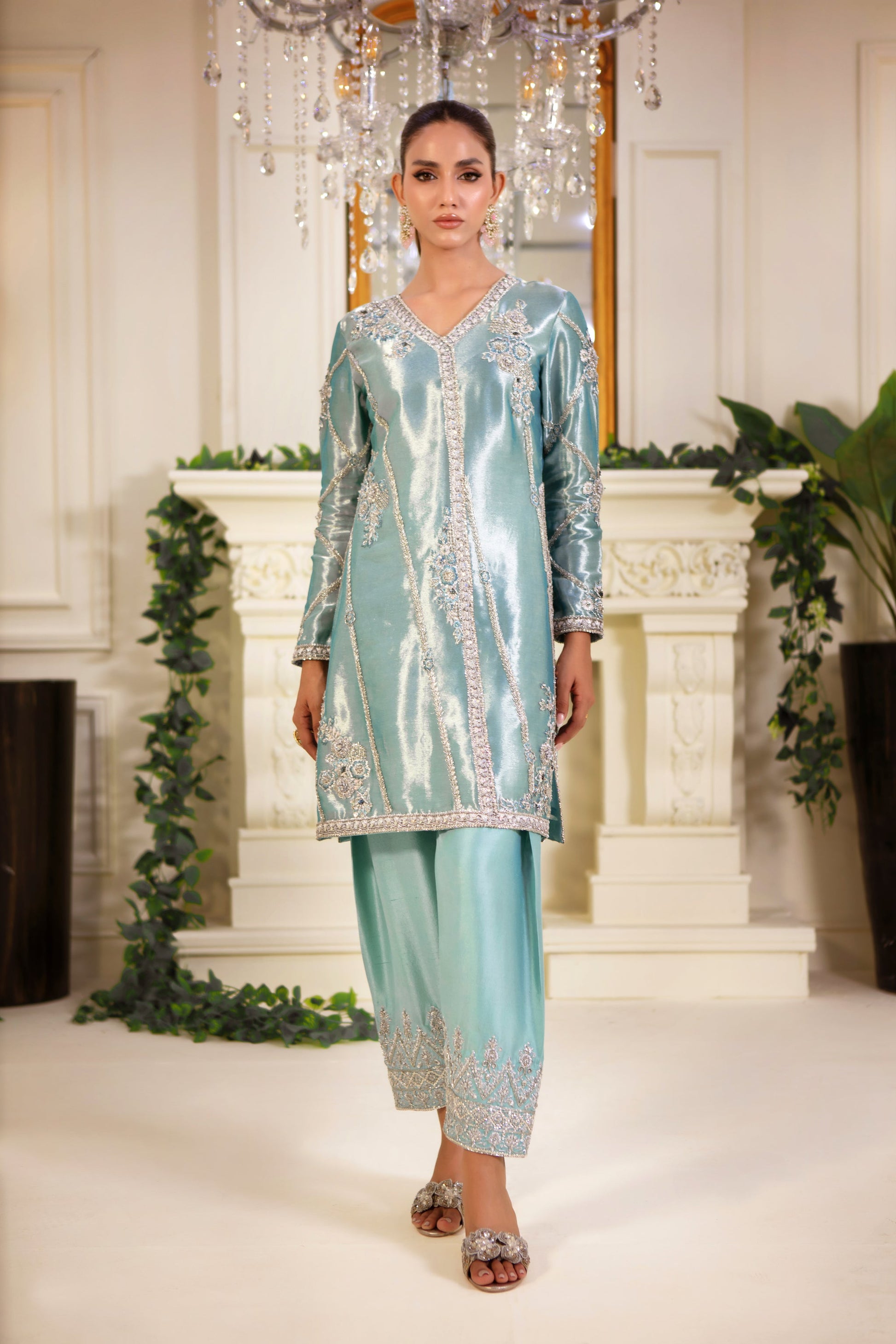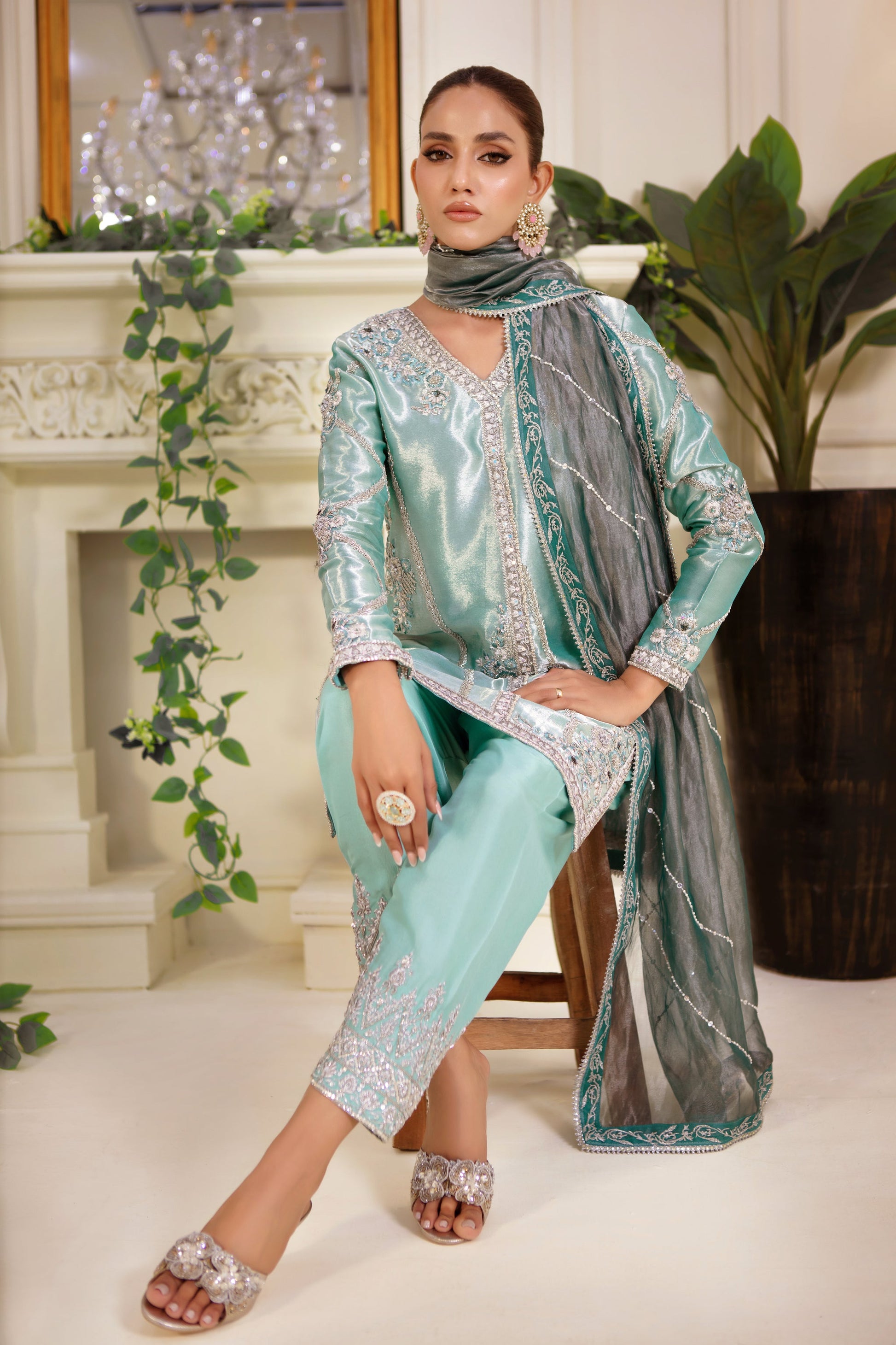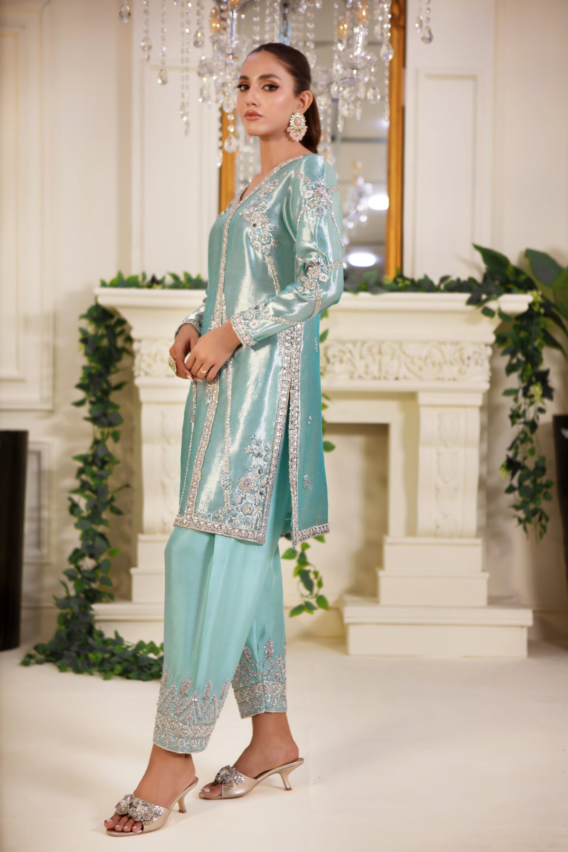 Stunning ice blue lama short shirt, beautifully adorned with intricate zardozi work in shimmering silver tone that adds a touch of elegance and luxury. Paired with raw silk shalwar & contrasting tissue dupatta, this ensemble balances opulence with understated sophistication. The monotone palette creates a harmonious look, perfect for both festive occasions and elegant gatherings.