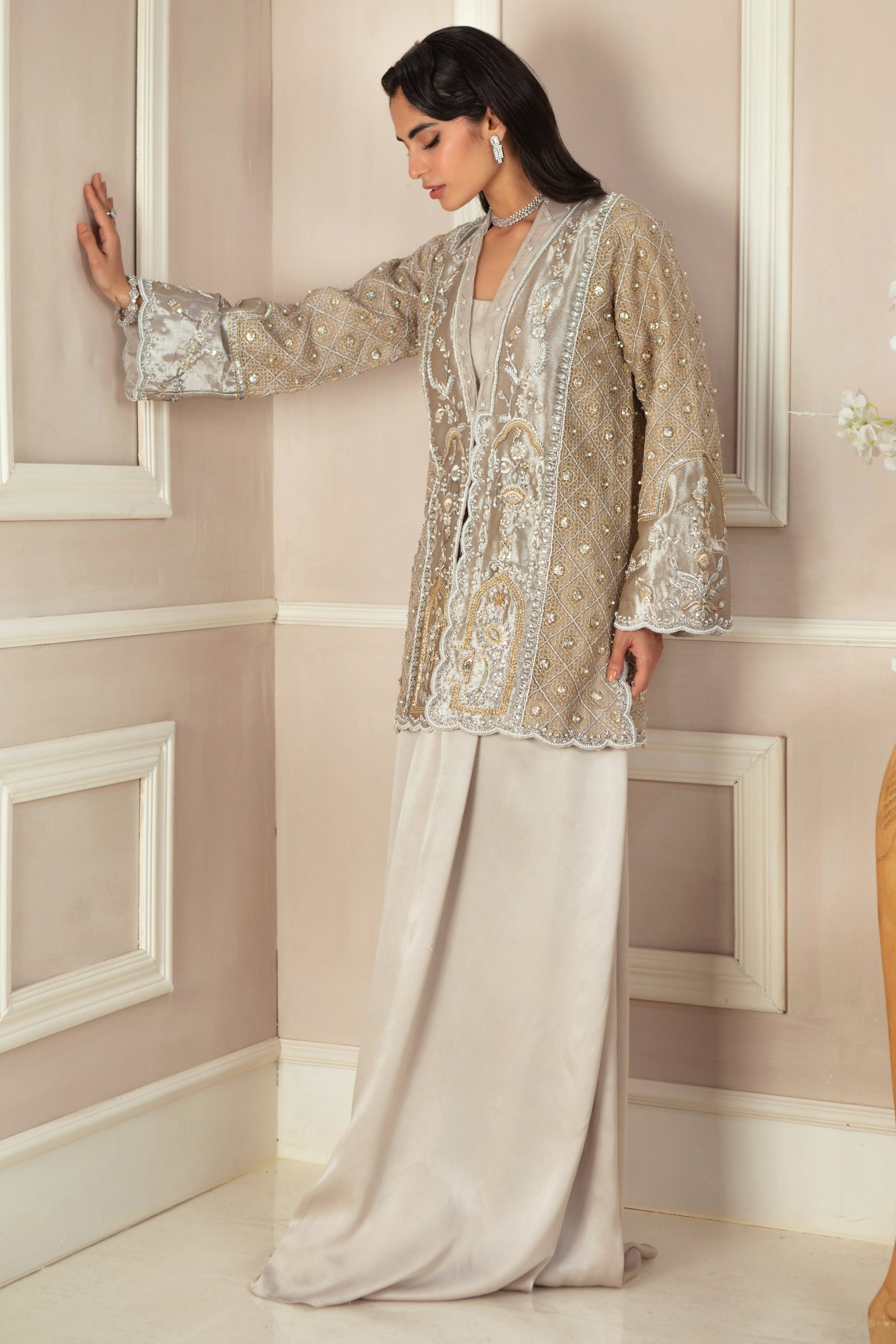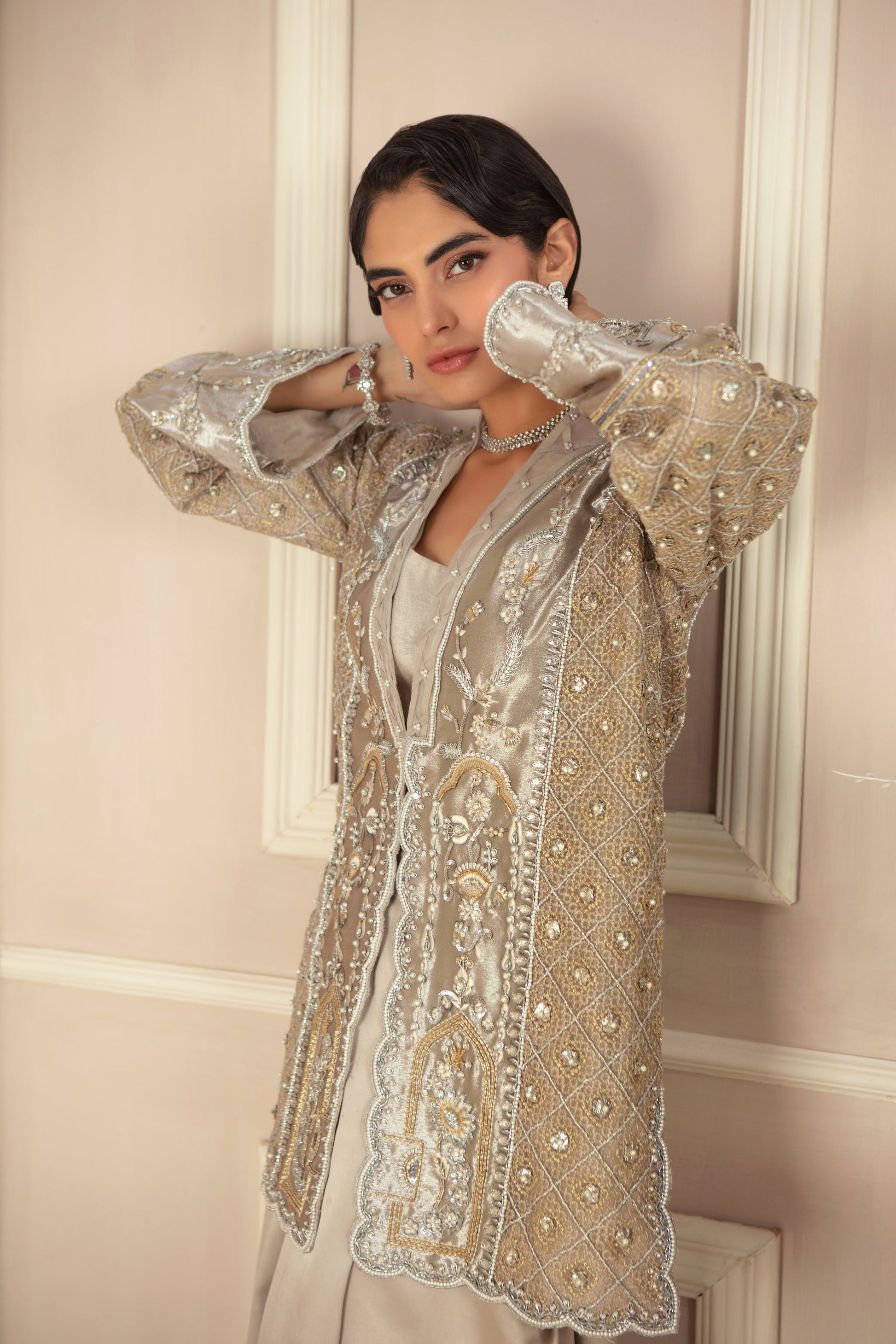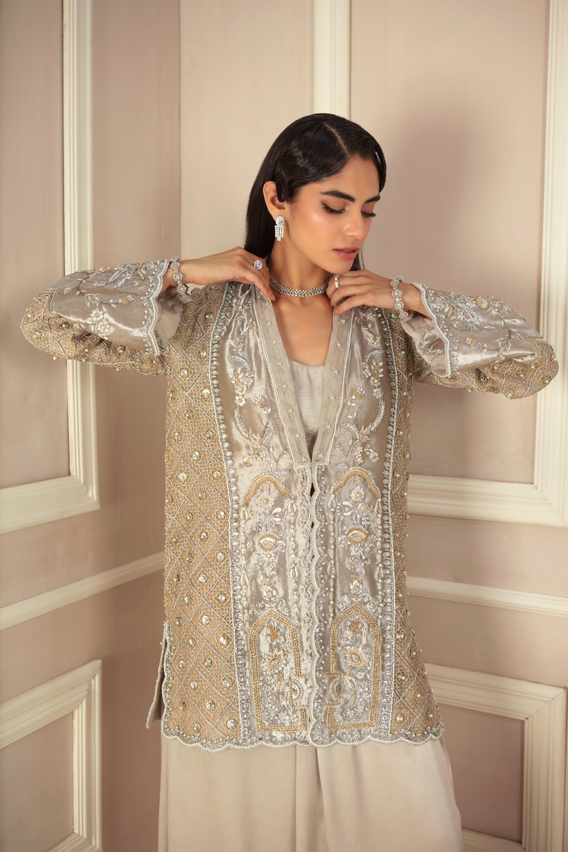 This statement jacket exudes elegance with its intricate and stylized design, featuring a structured silhouette that adds a modern yet festive flair. The jacket is beautifully detailed with finely cut worked front panels, creating a bold, artistic statement. Paired with a stylish draped skirt, this ensemble combines sophistication and grace